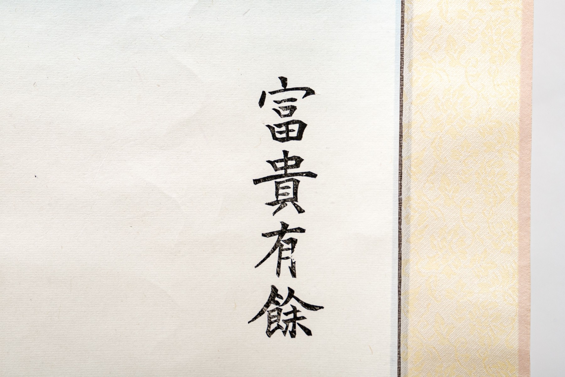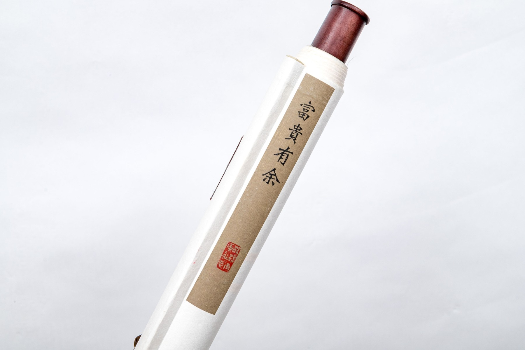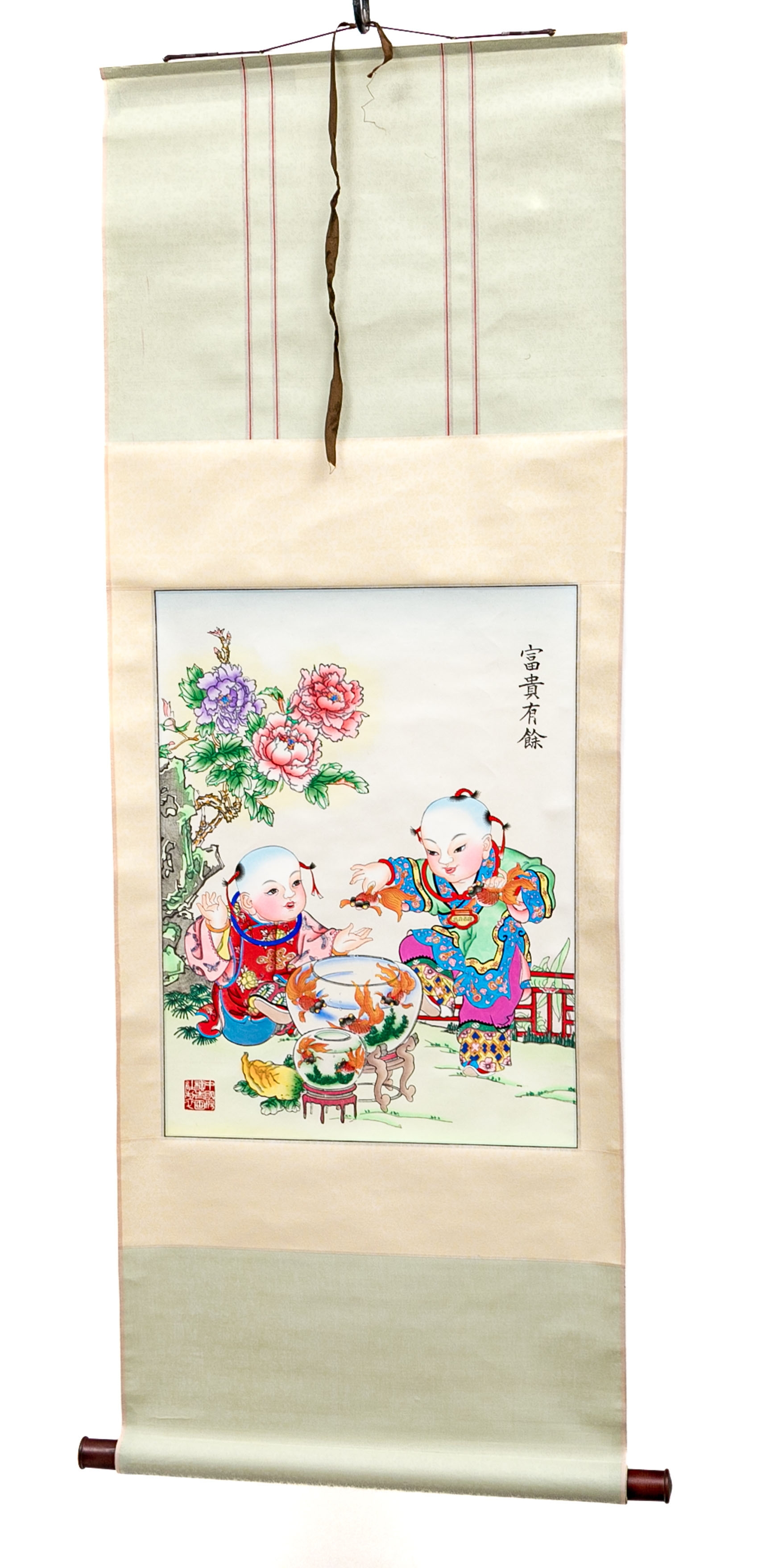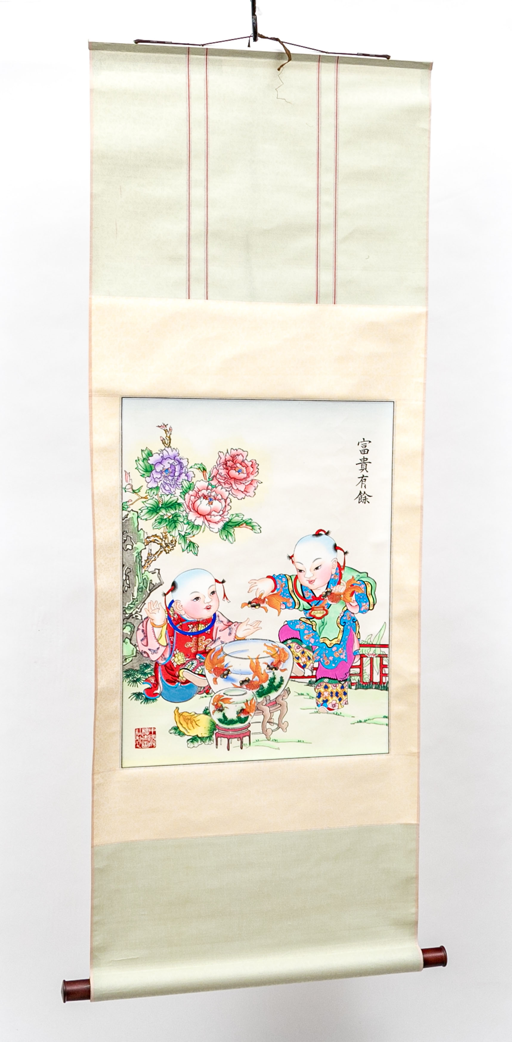 With a nicely finished wooden pole and brocade decorated paper trim around the printed image in vibrant colors.