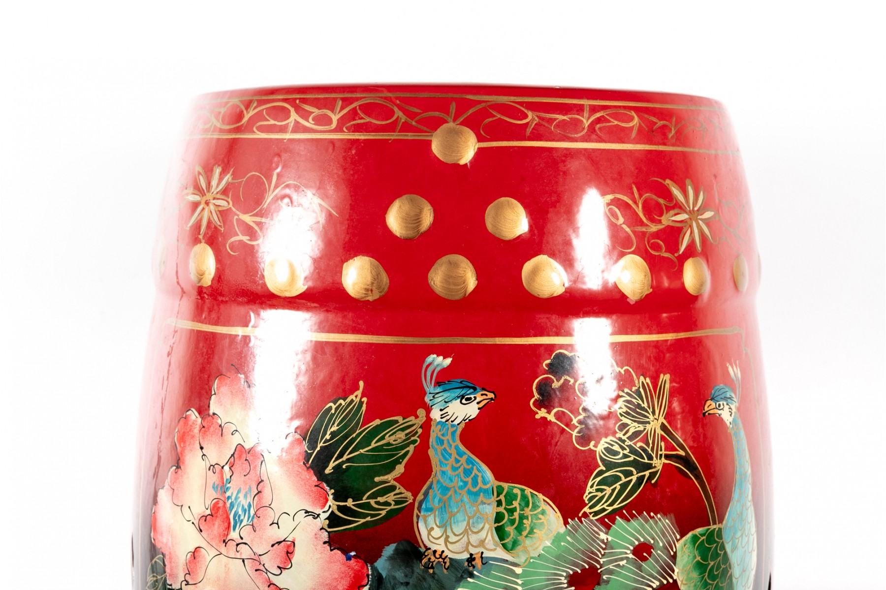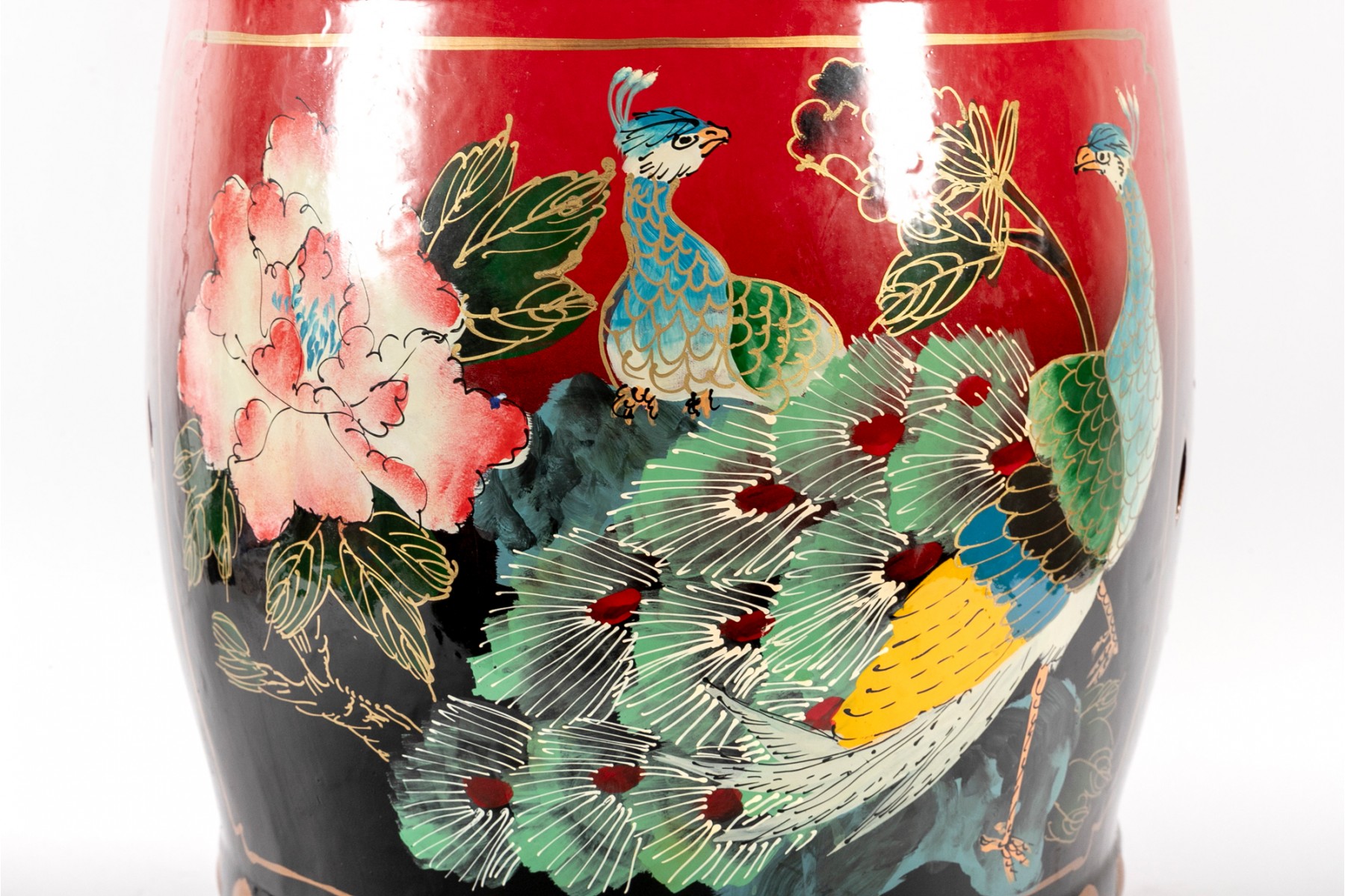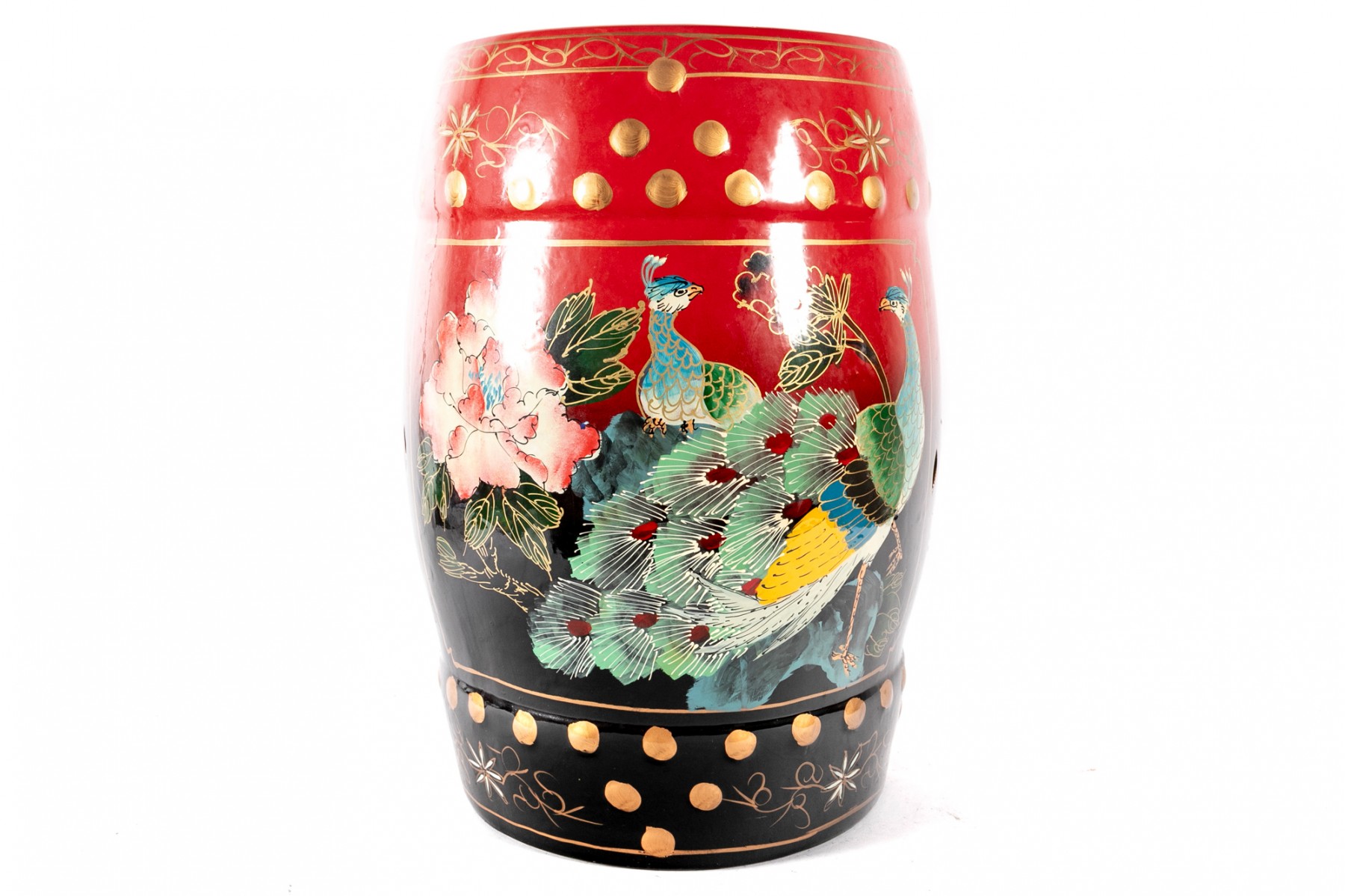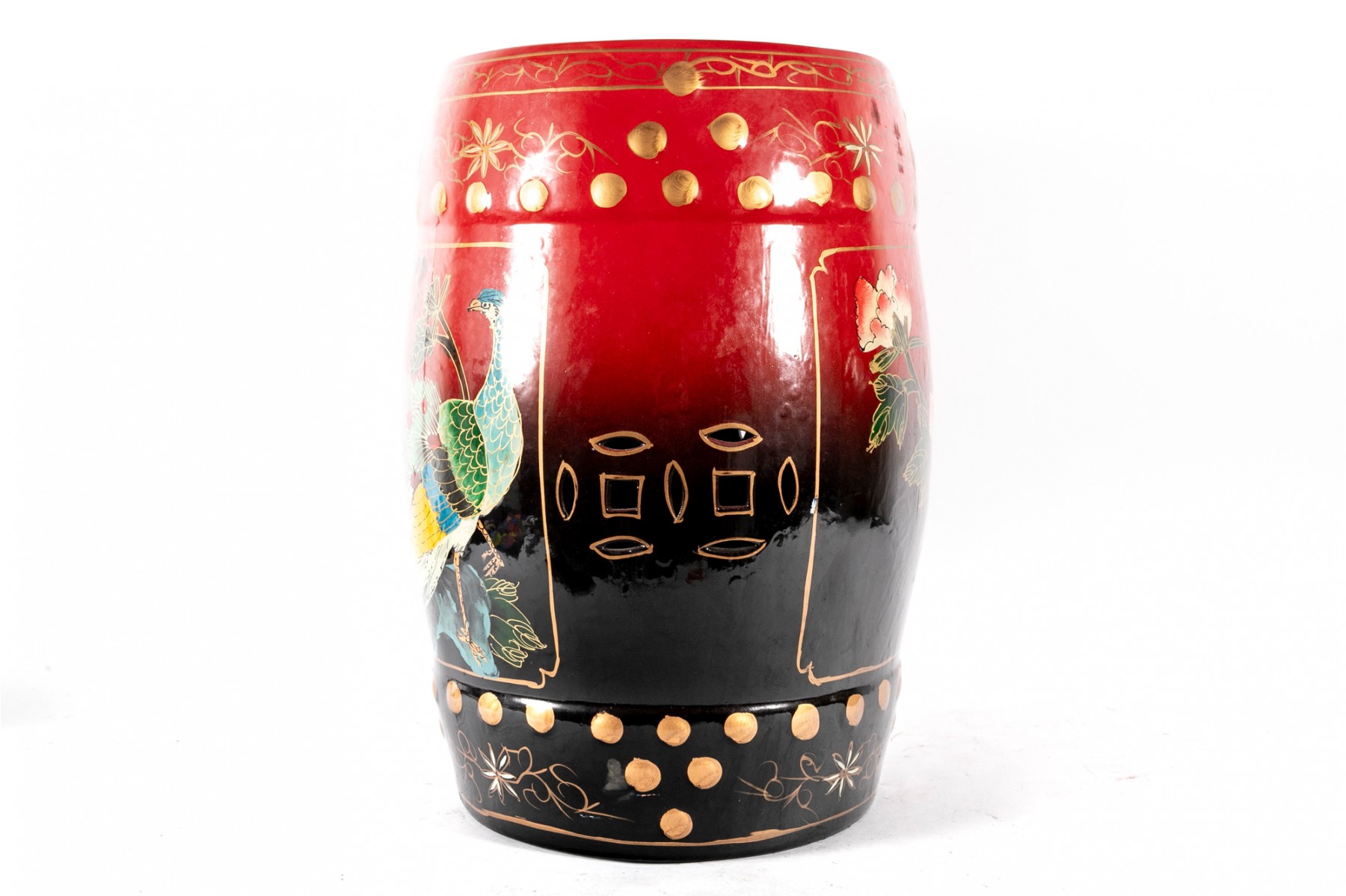 A beautiful Chinese drum-form garden stool in a vibrant red-to-black ombre, hand-painted with scenes of peacocks and large flowers in hues of blue, yellow, and pink.
