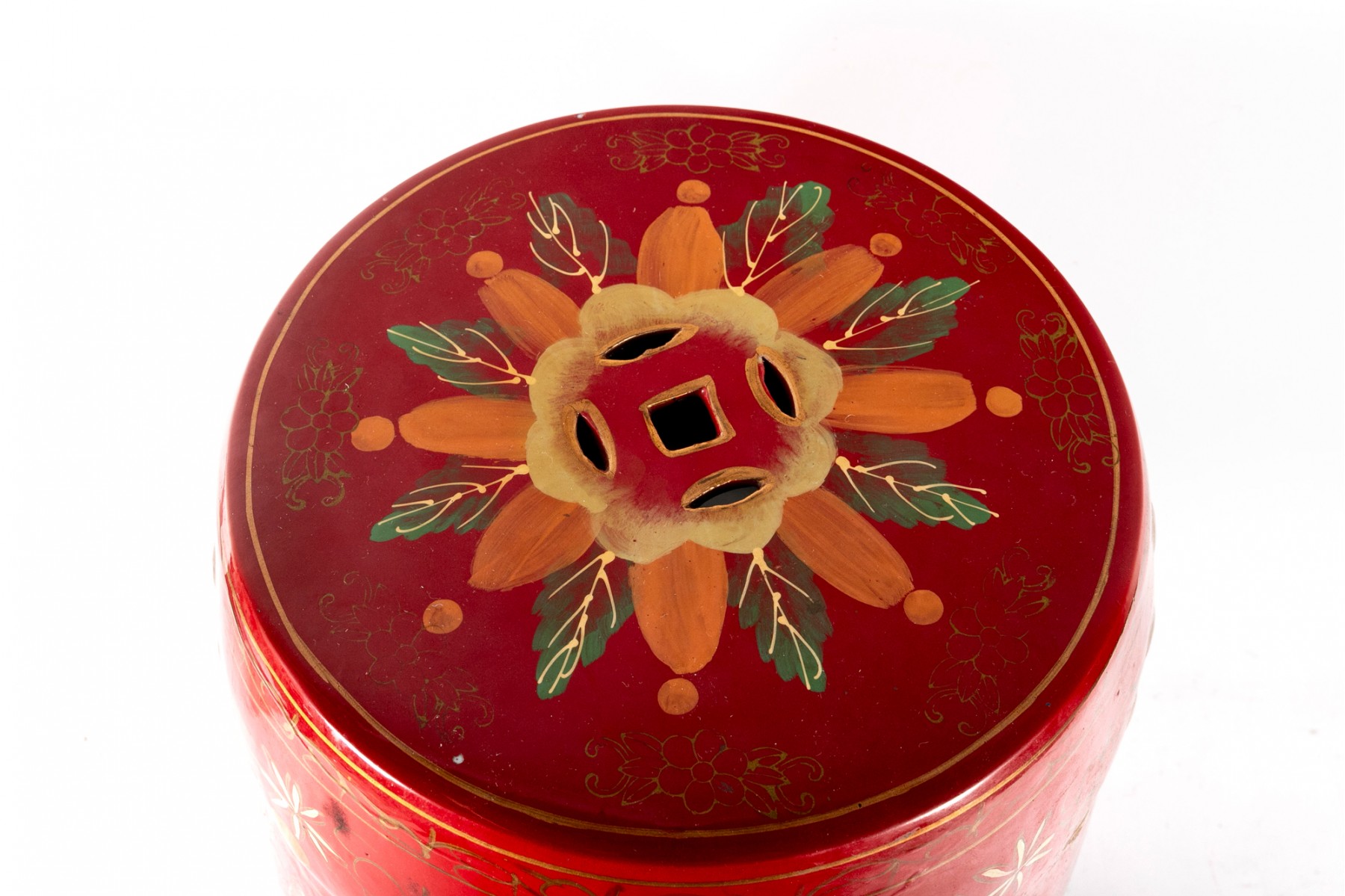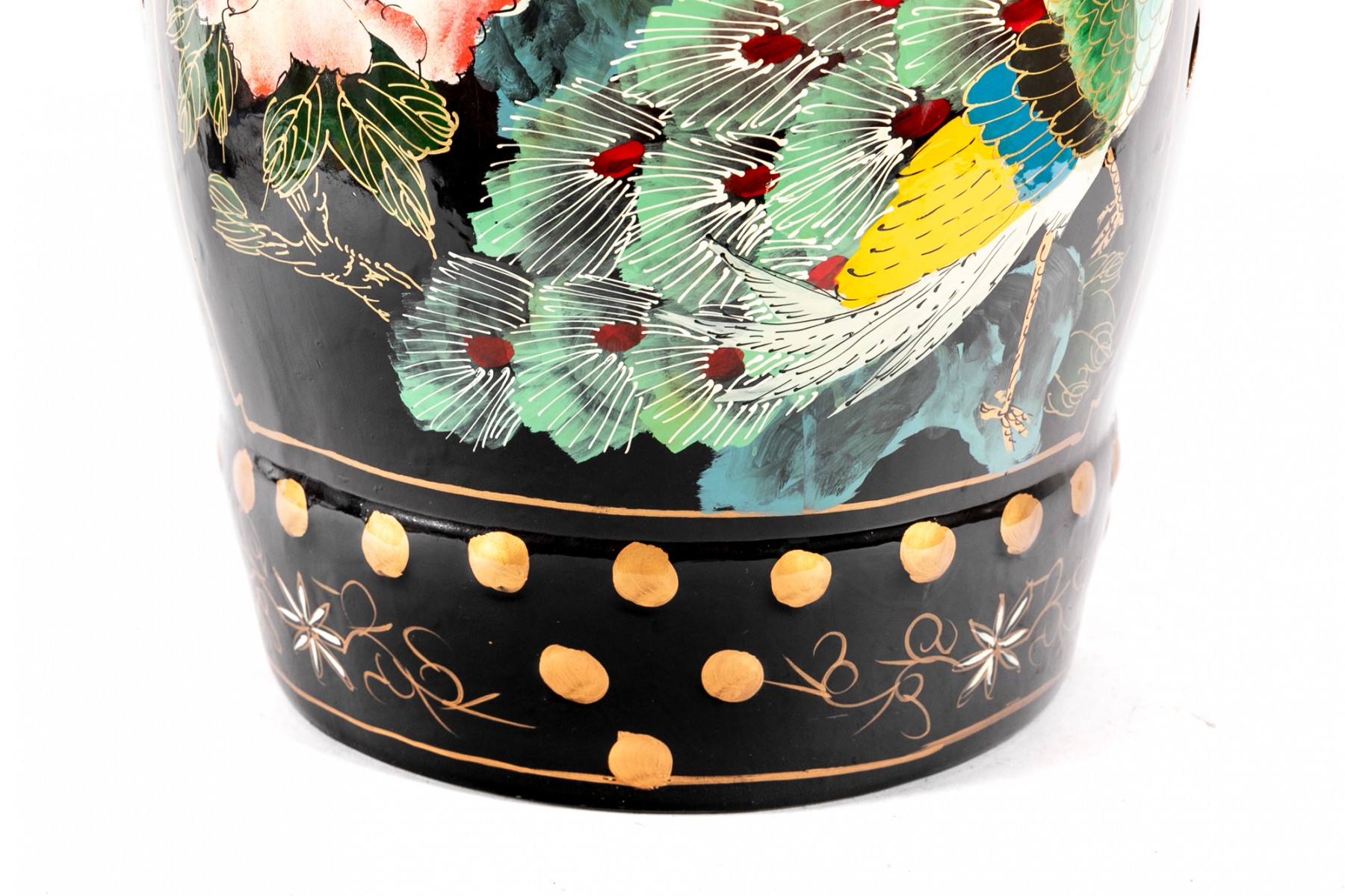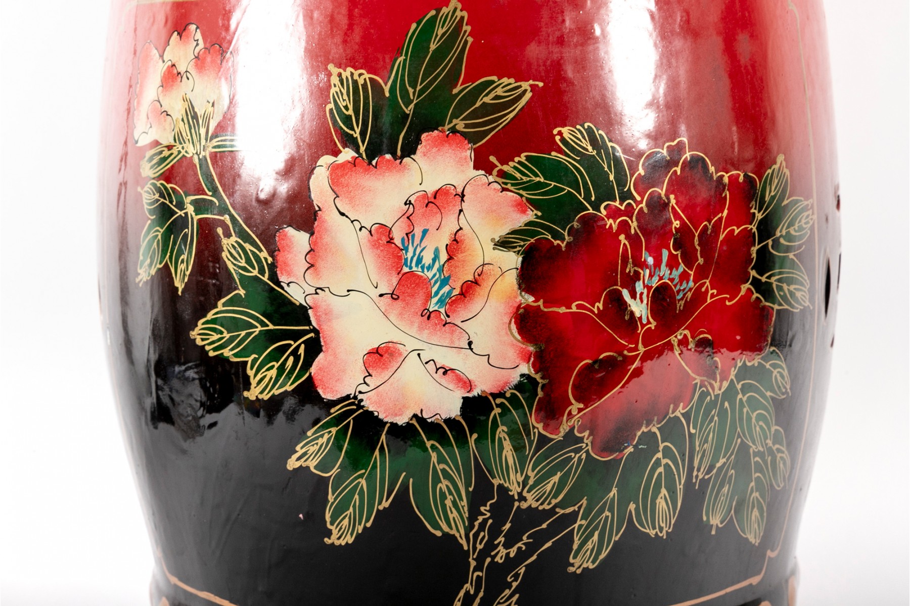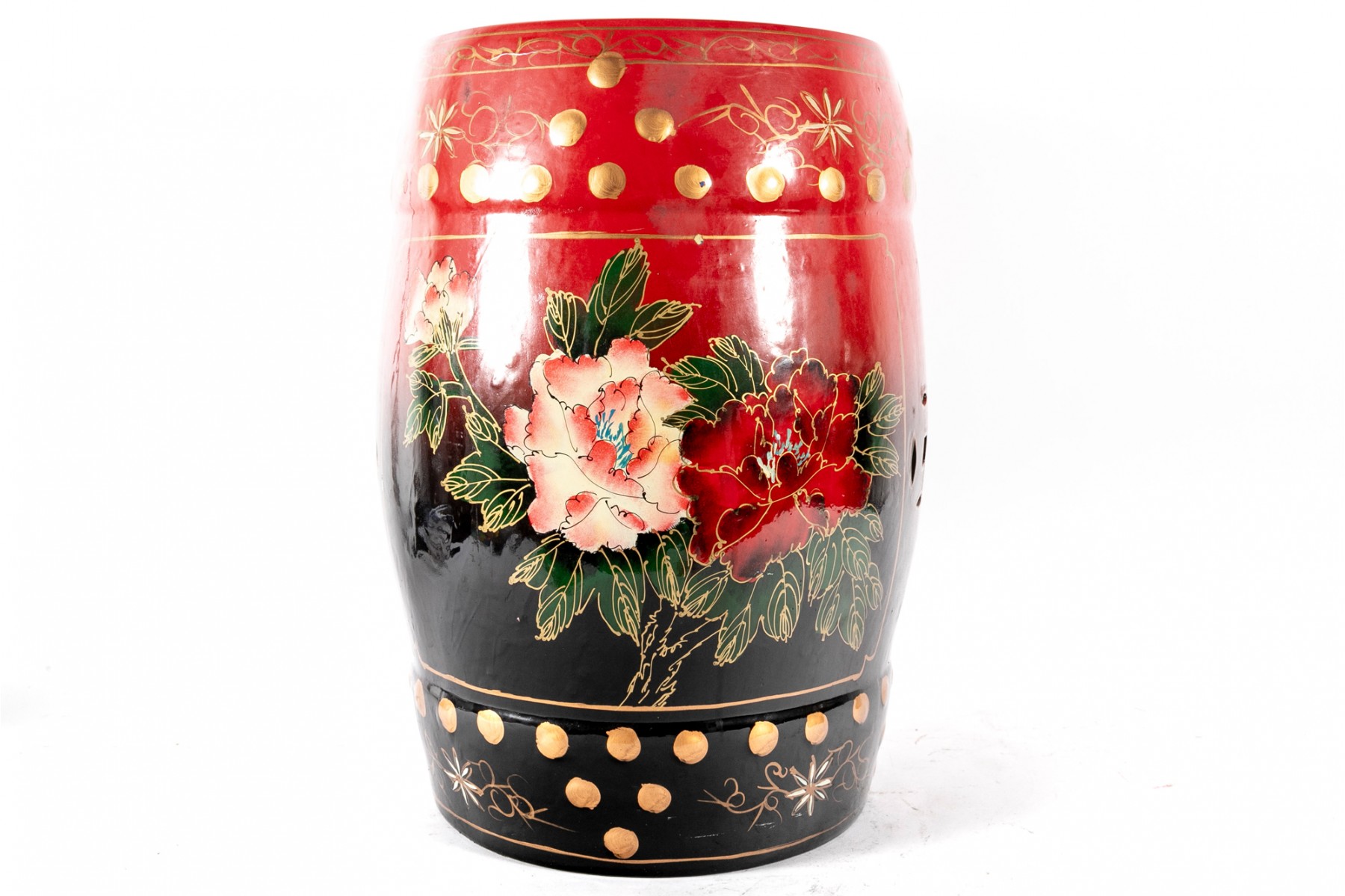 A beautiful Chinese drum-form garden stool in a vibrant red-to-black ombre, hand-painted with scenes of peacocks and large flowers in hues of blue, yellow, and pink.