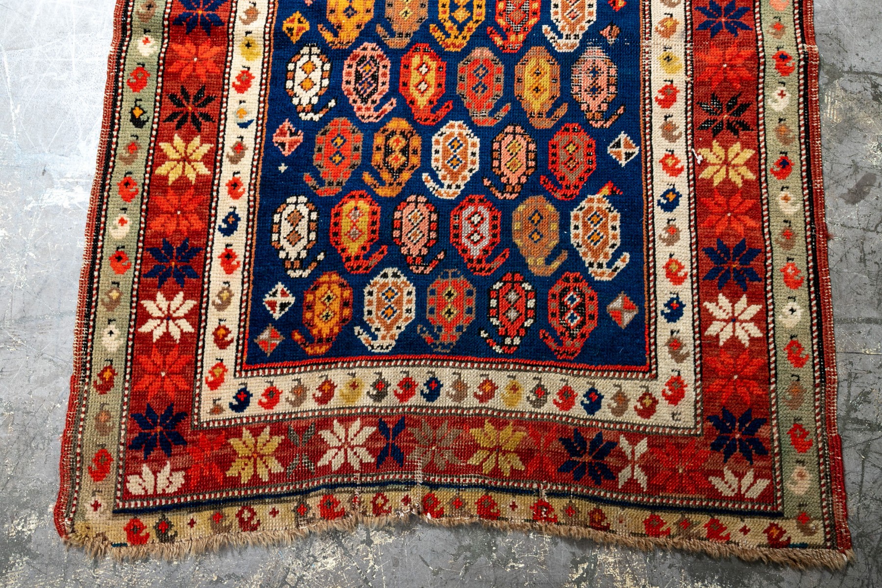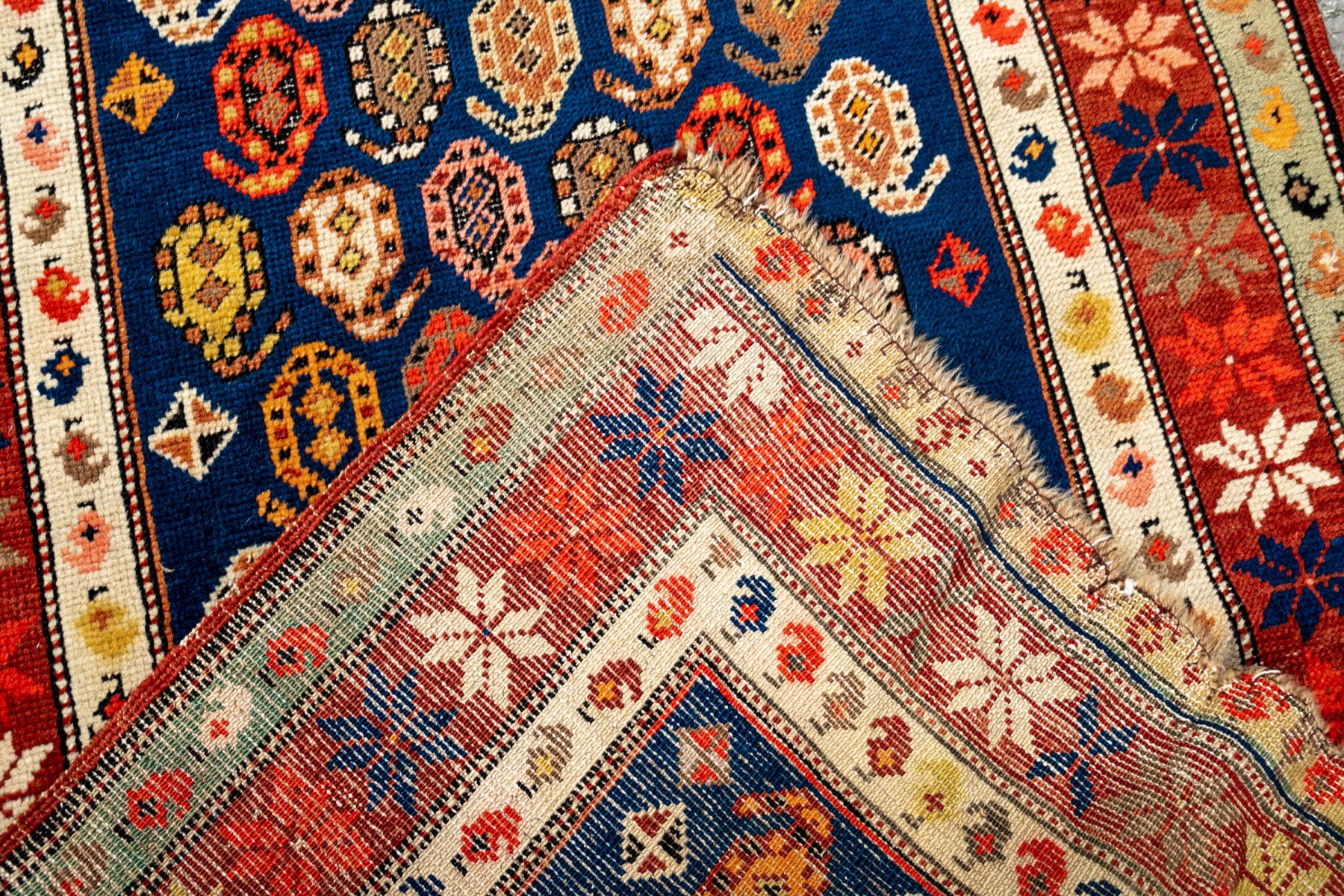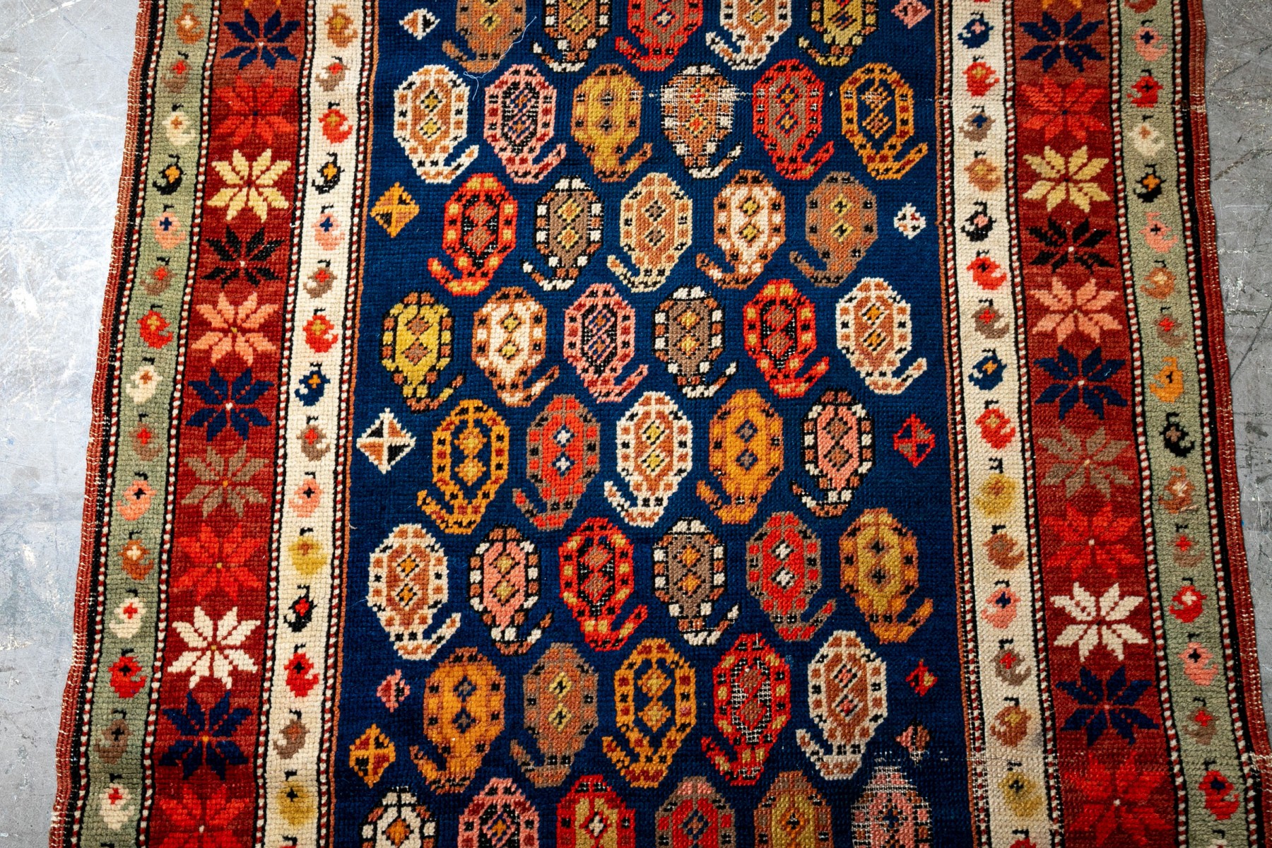 A vibrant Kazak hand knotted wool runner rug in eye catching vibrant hues of red, yellow, and blue. Geometric flowers decorate the red main border, while scorpion motifs repeat across the blue field.