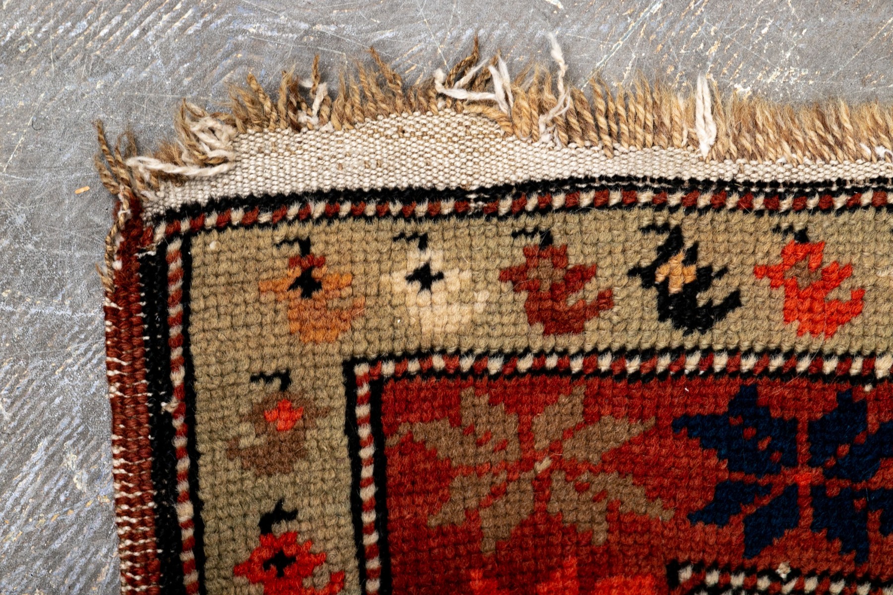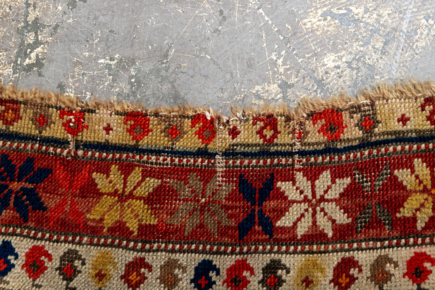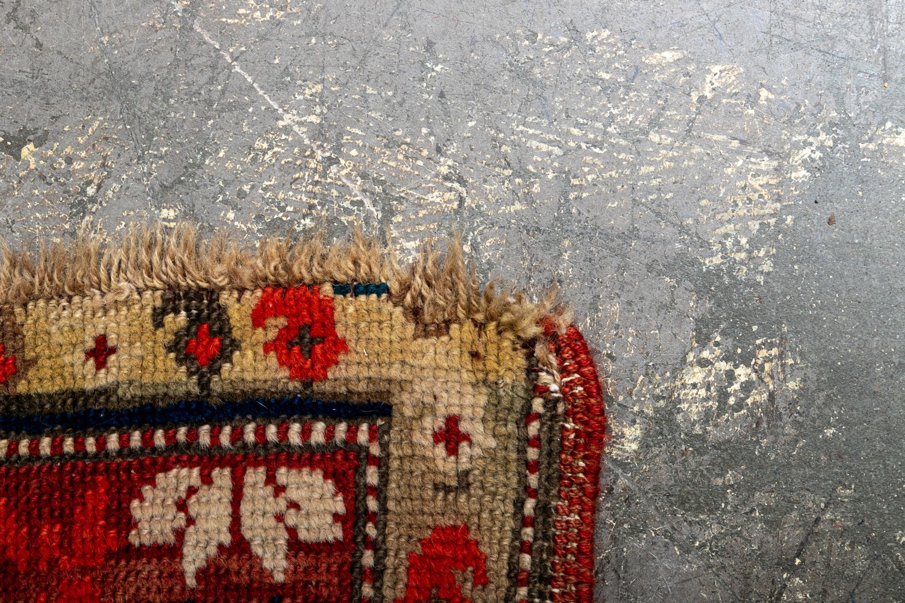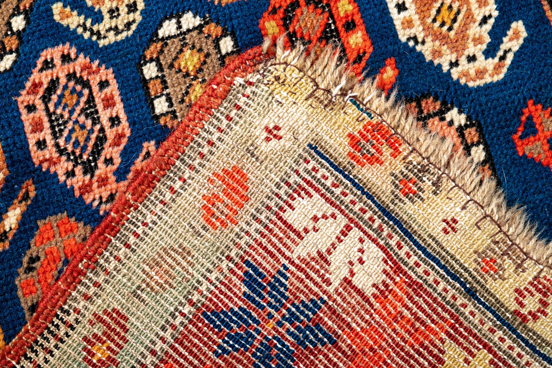 A vibrant Kazak hand knotted wool runner rug in eye catching vibrant hues of red, yellow, and blue. Geometric flowers decorate the red main border, while scorpion motifs repeat across the blue field.