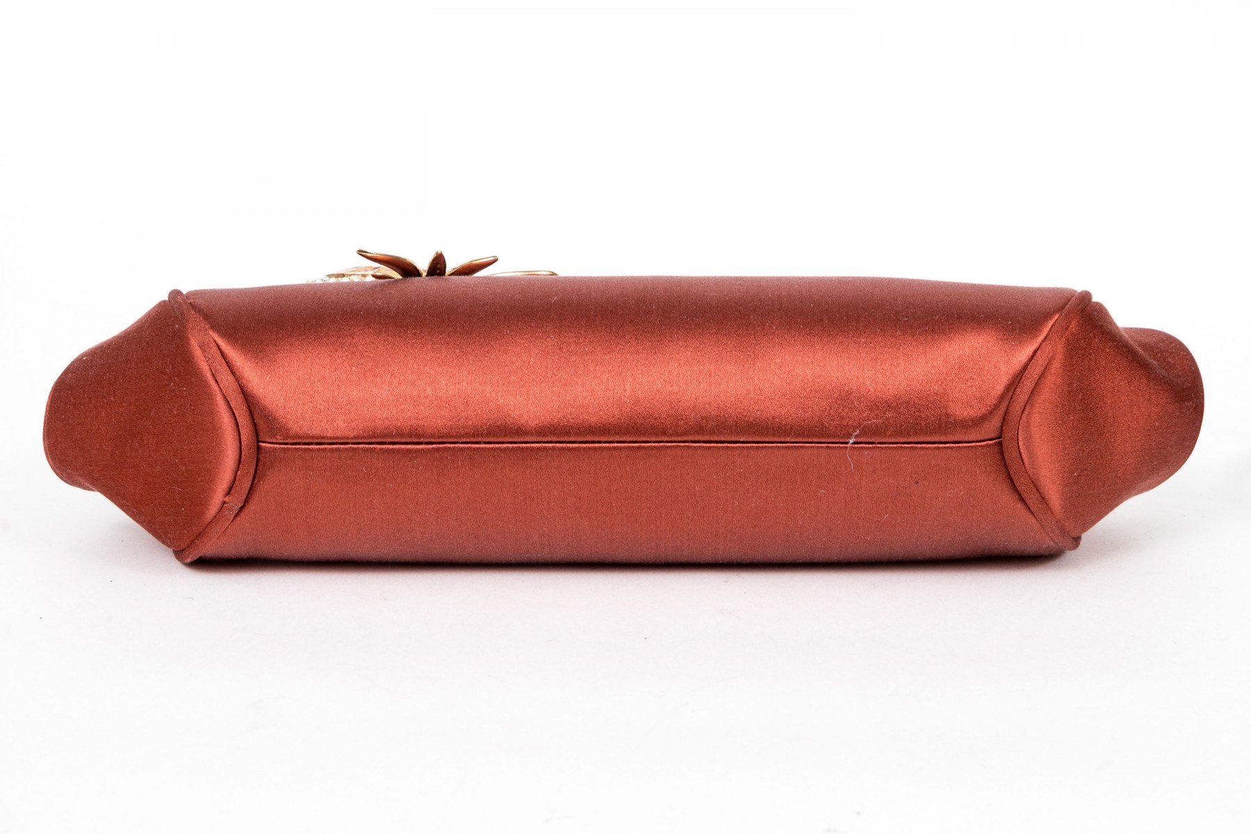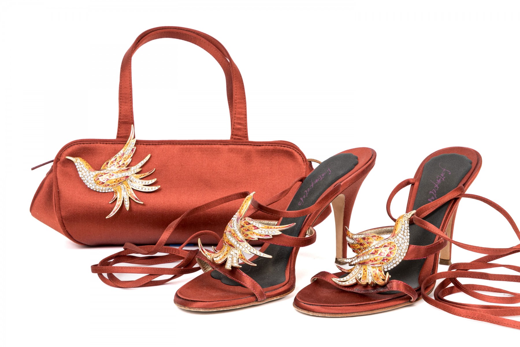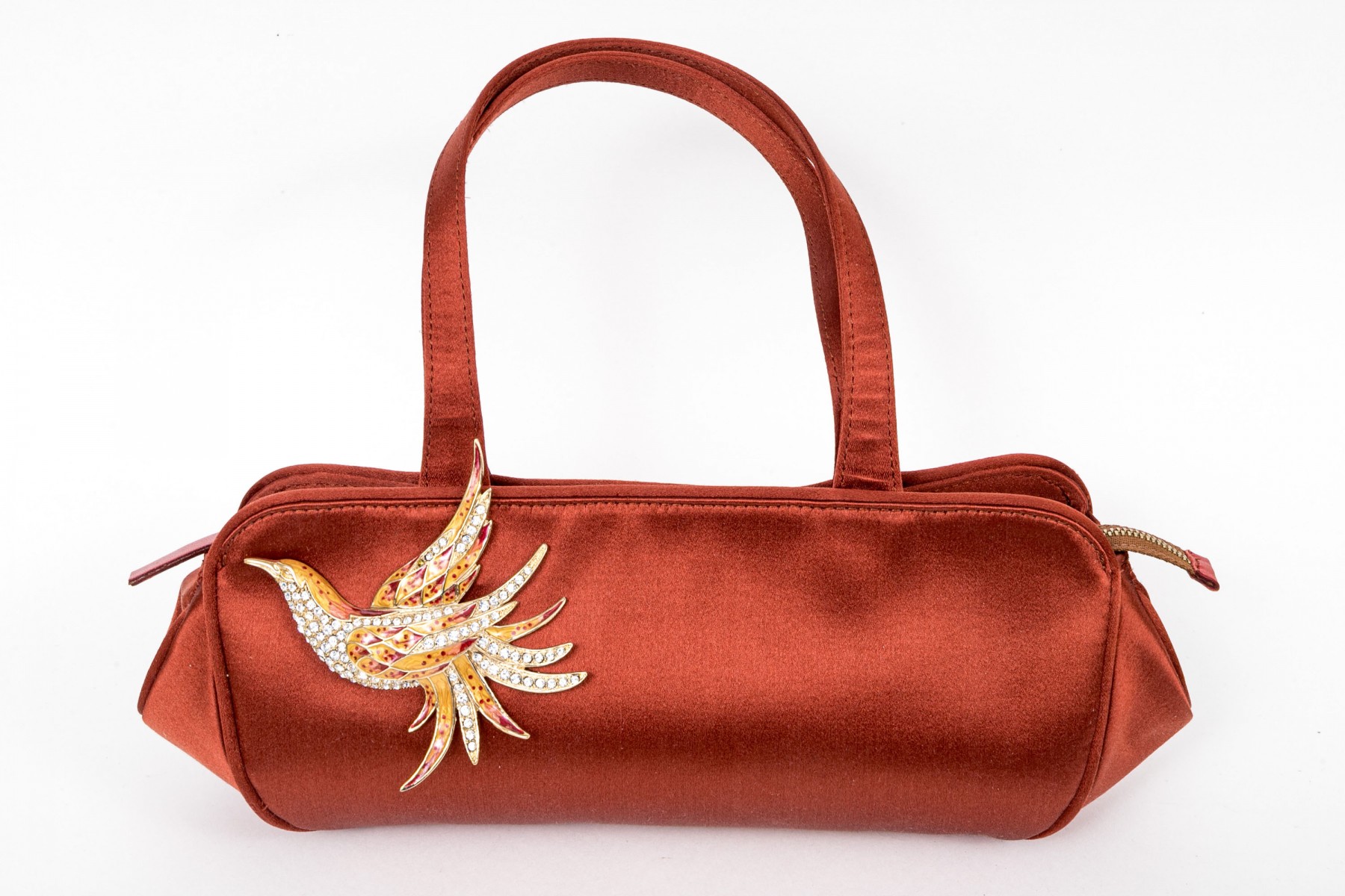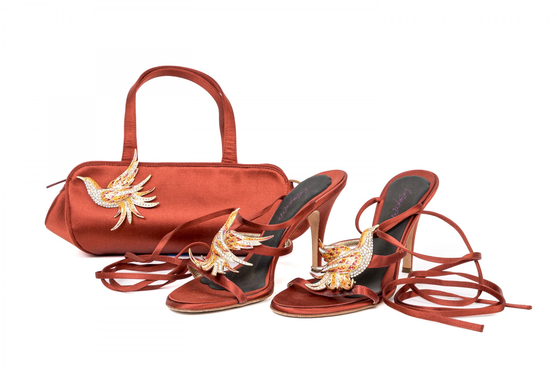 Vicini impactful dark orange satin top handle bag and matching sandals, size 40, bird motif decorations