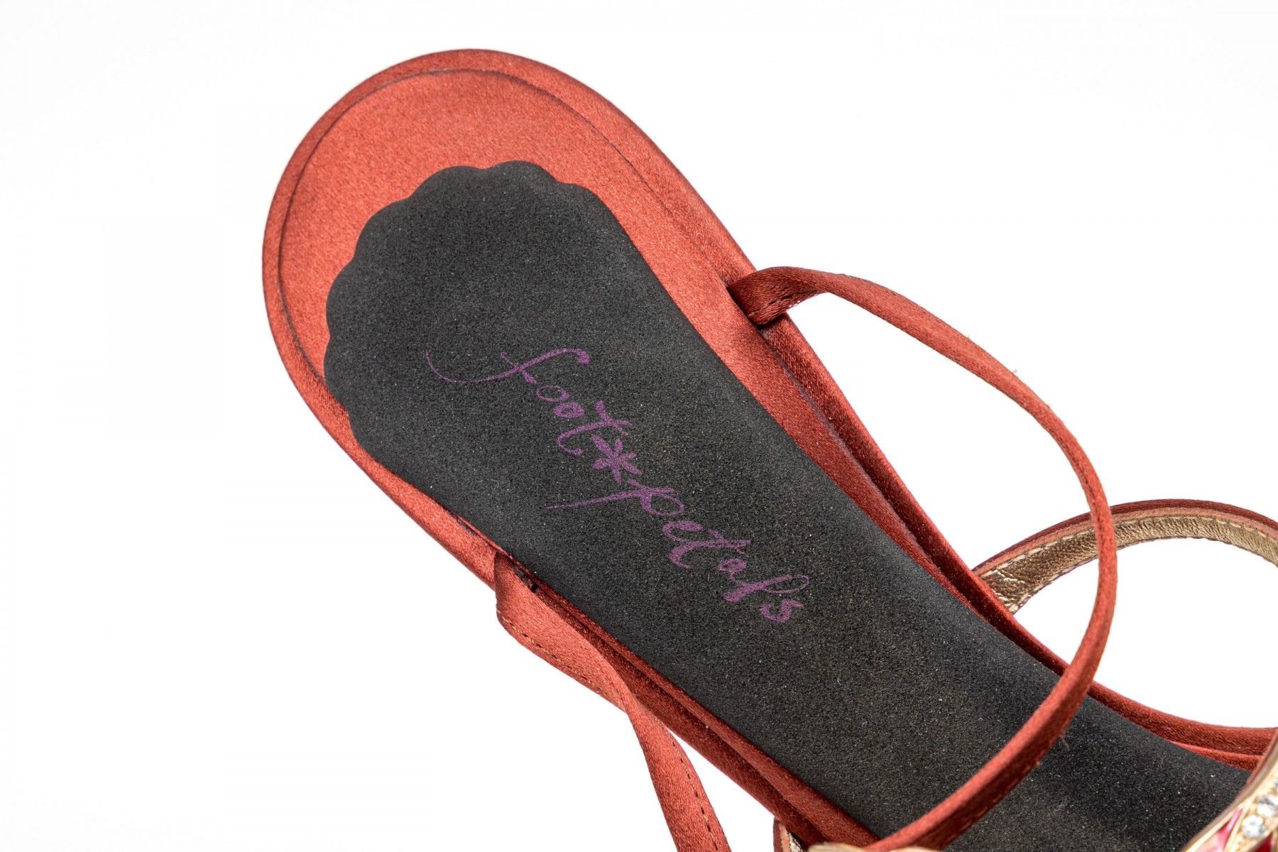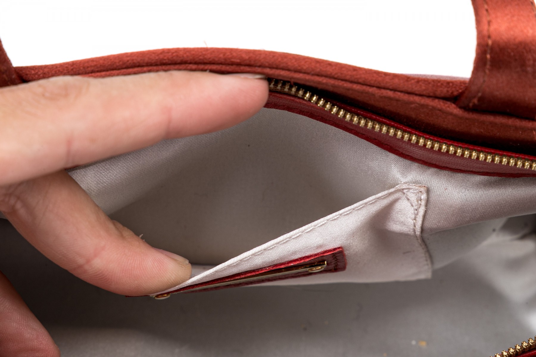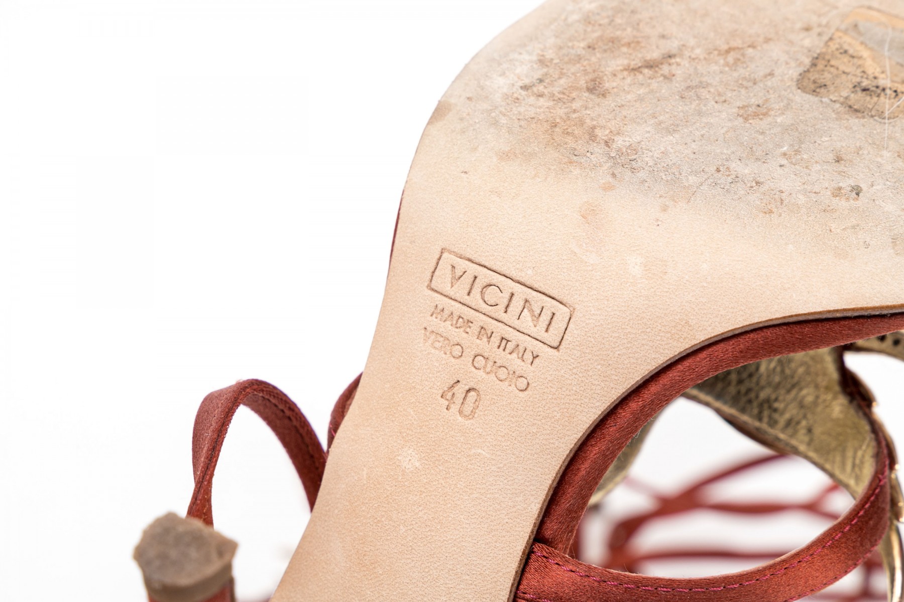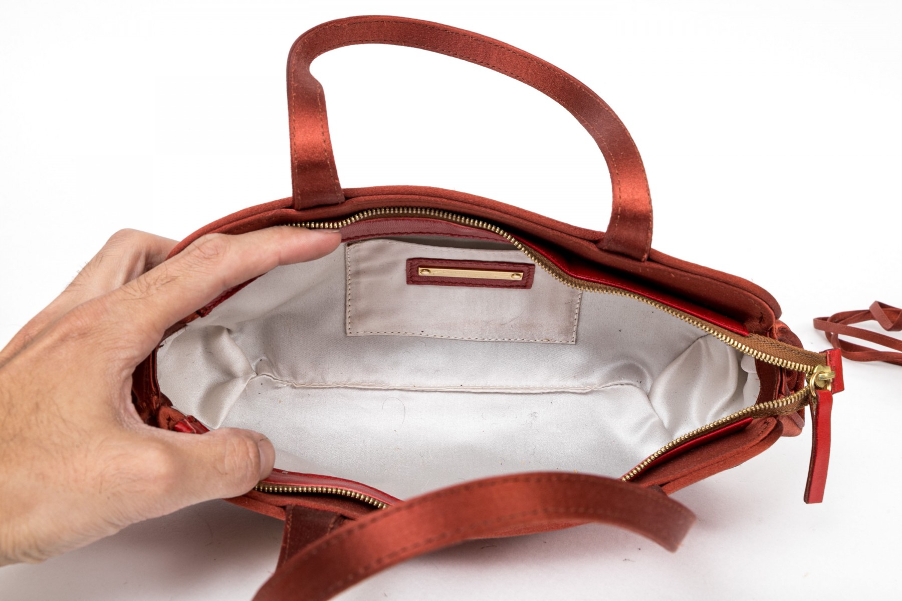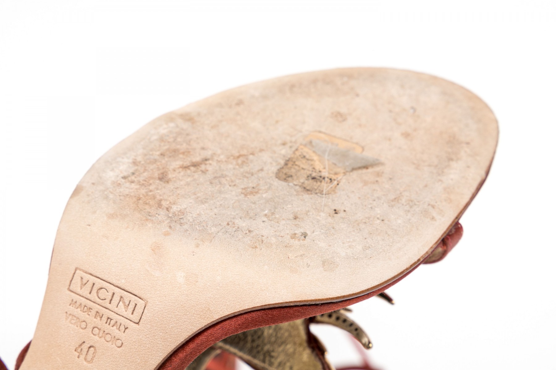 Vicini impactful dark orange satin top handle bag and matching sandals, size 40, bird motif decorations