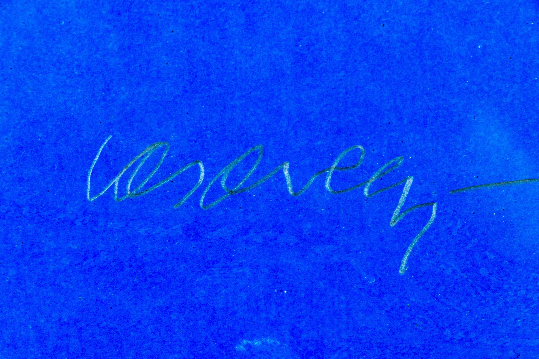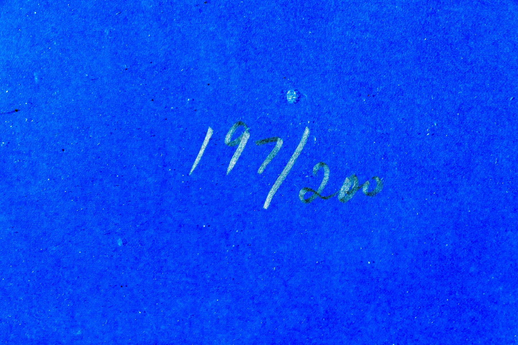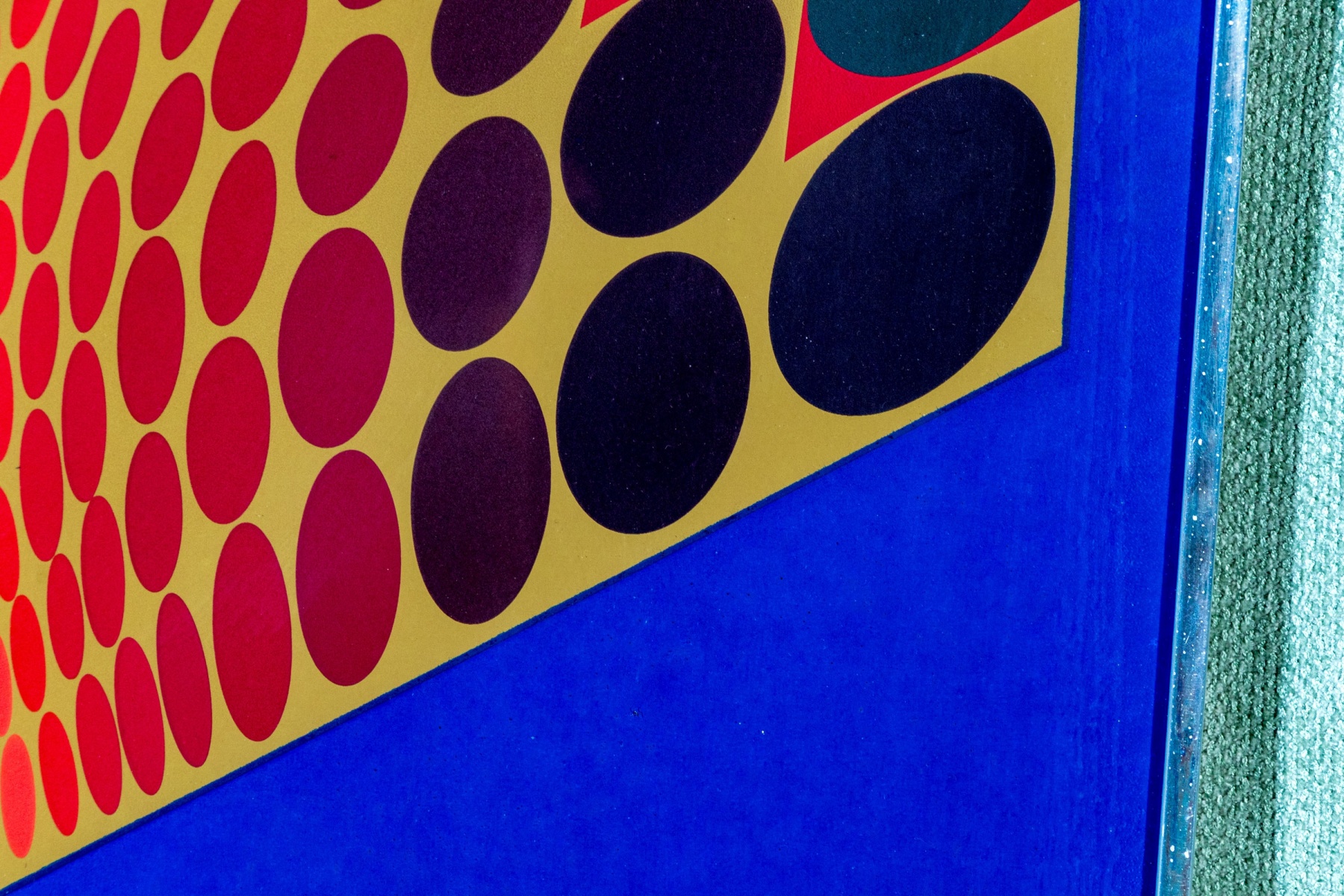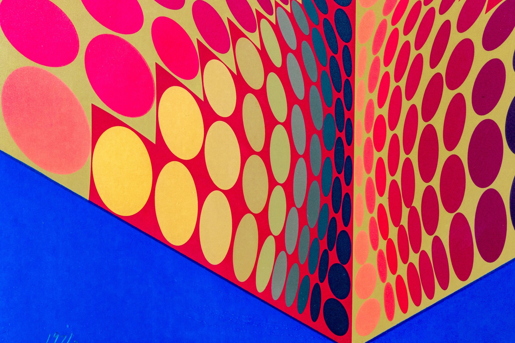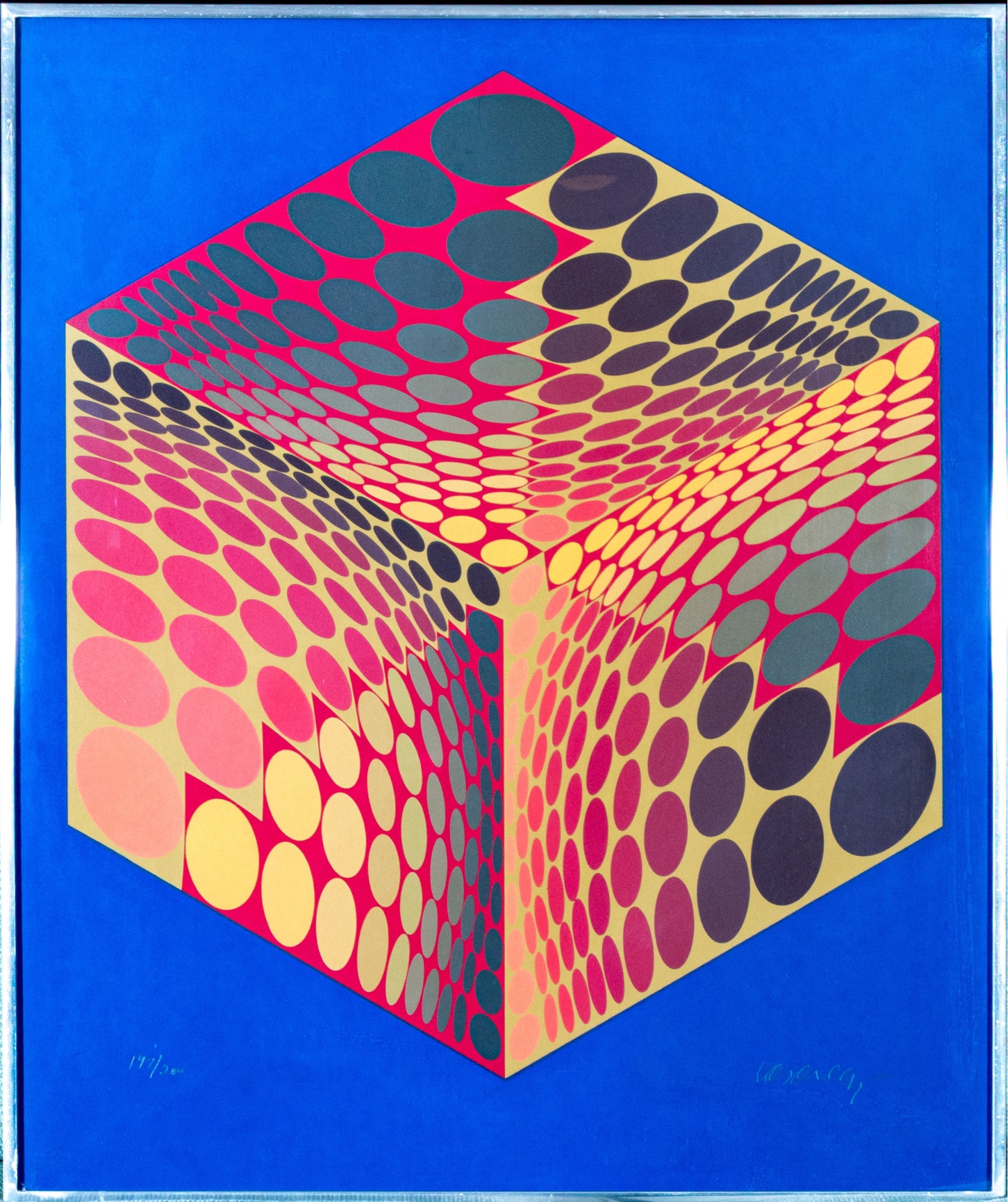 The serigraph features a cube composed of multiple sized ellipses in hues of yellow, red, pink and grey, set against a blue ground. The work creates an illusion of depth and spatial sense with its notable shifting perspective. The work pencil signed lower right and numbered ‘197/200’.