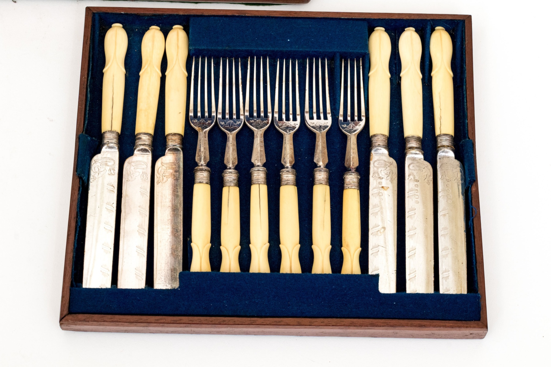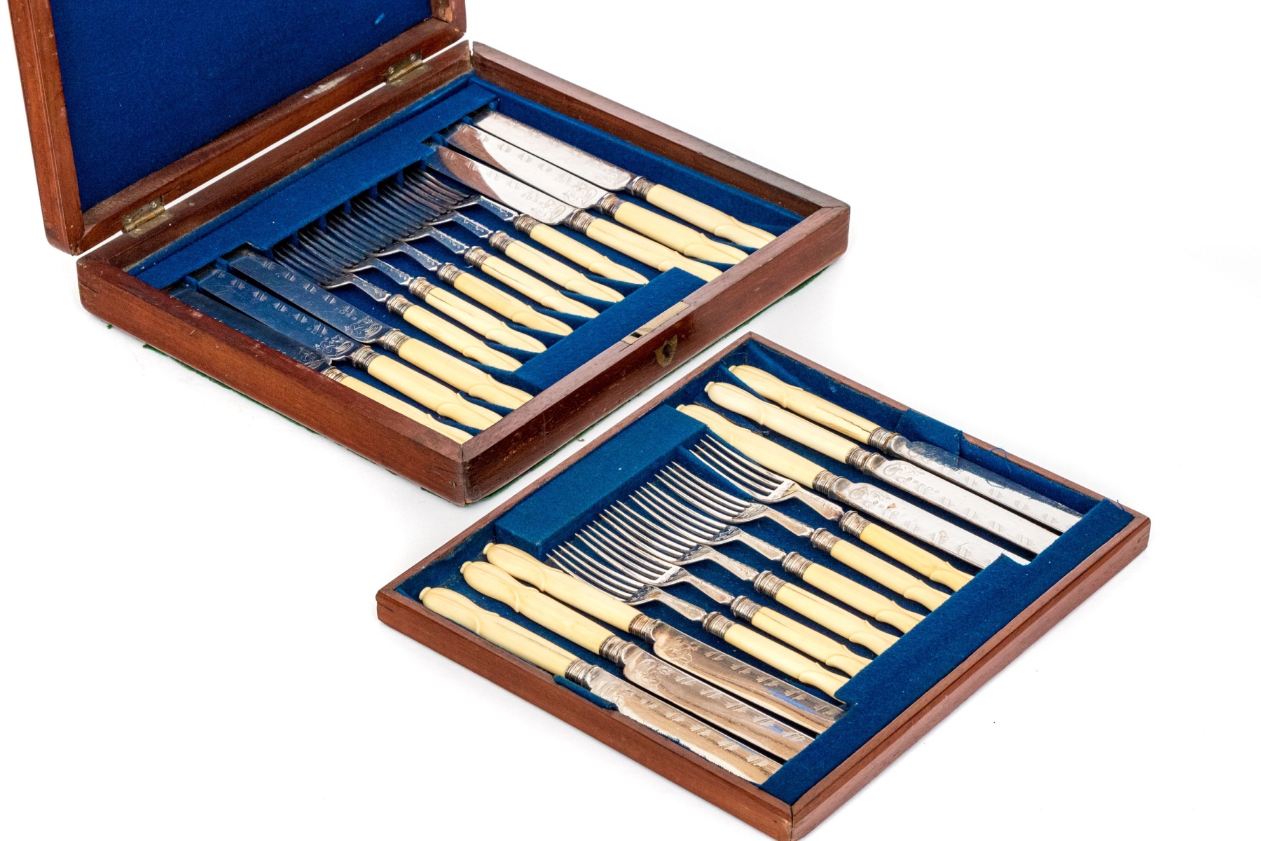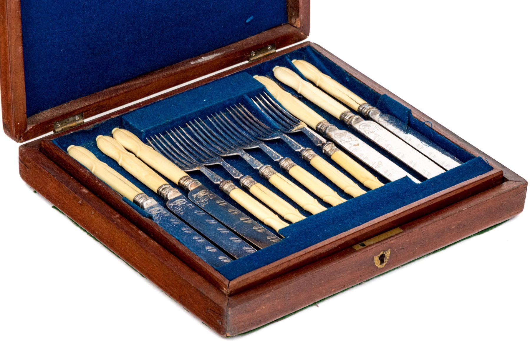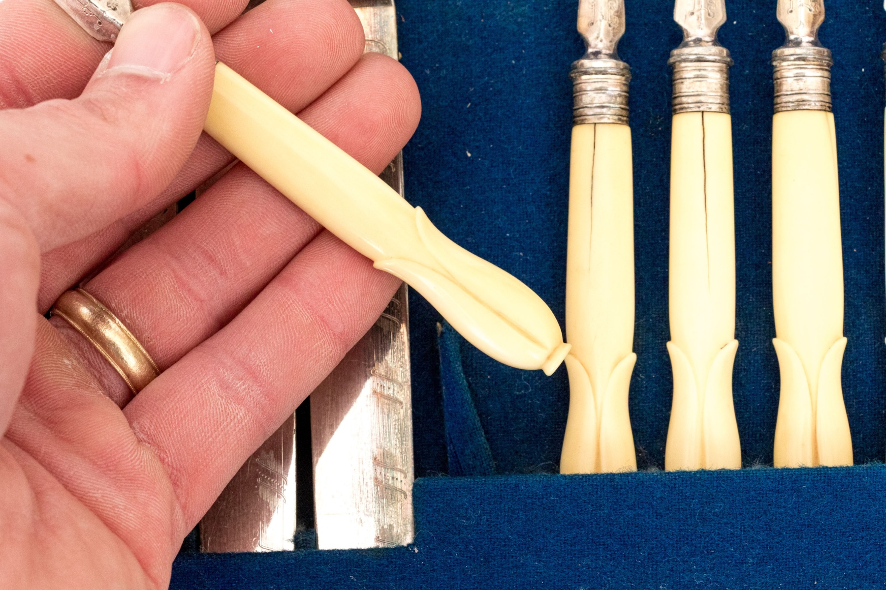A wonderful set of Victorian fish flatware including twelve knives and twelve forks, all with foliate carved celluloid handles. Includes a wood case with a blue velvet lining.