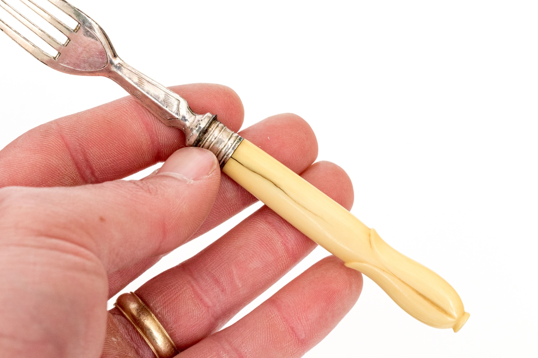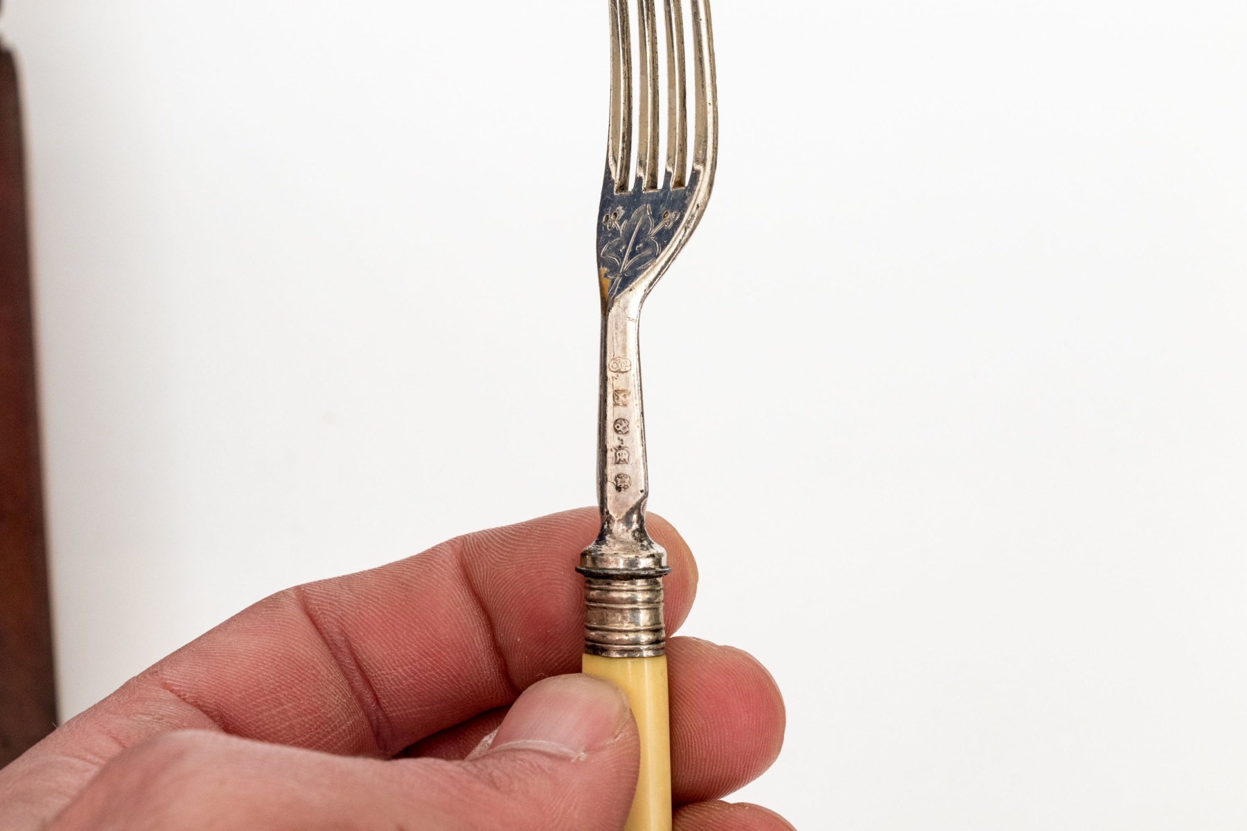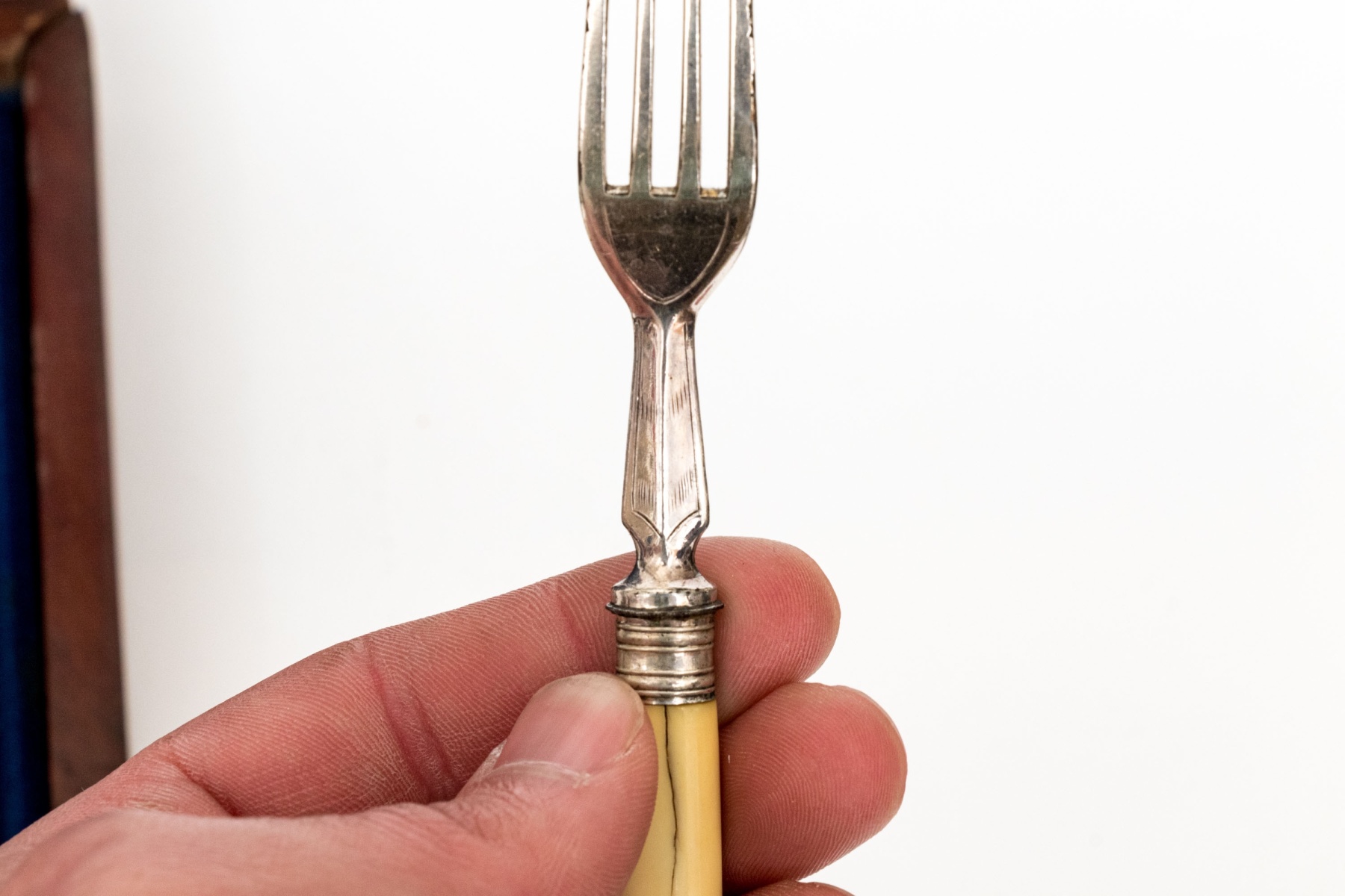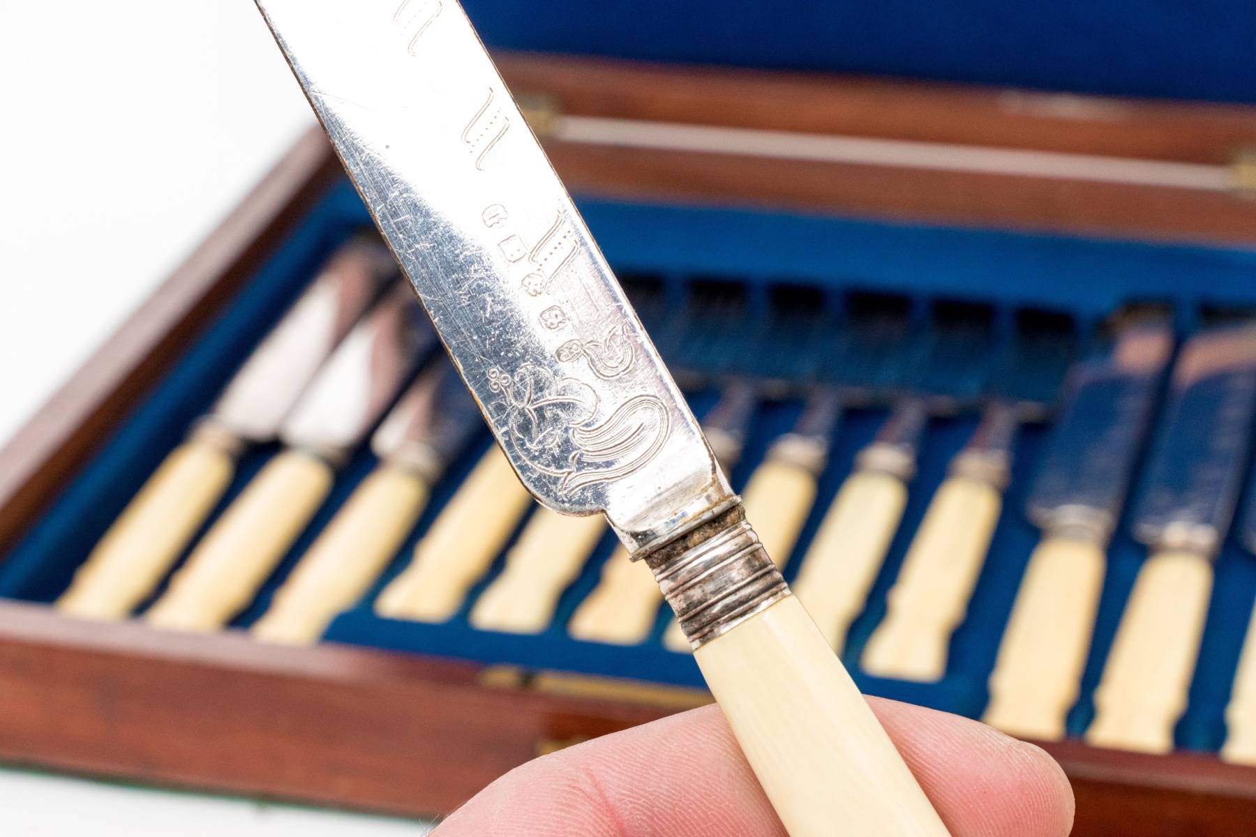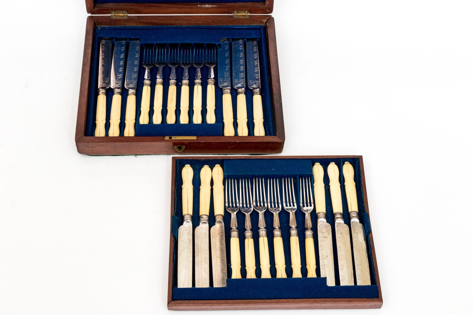 A wonderful set of Victorian fish flatware including twelve knives and twelve forks, all with foliate carved celluloid handles. Includes a wood case with a blue velvet lining.