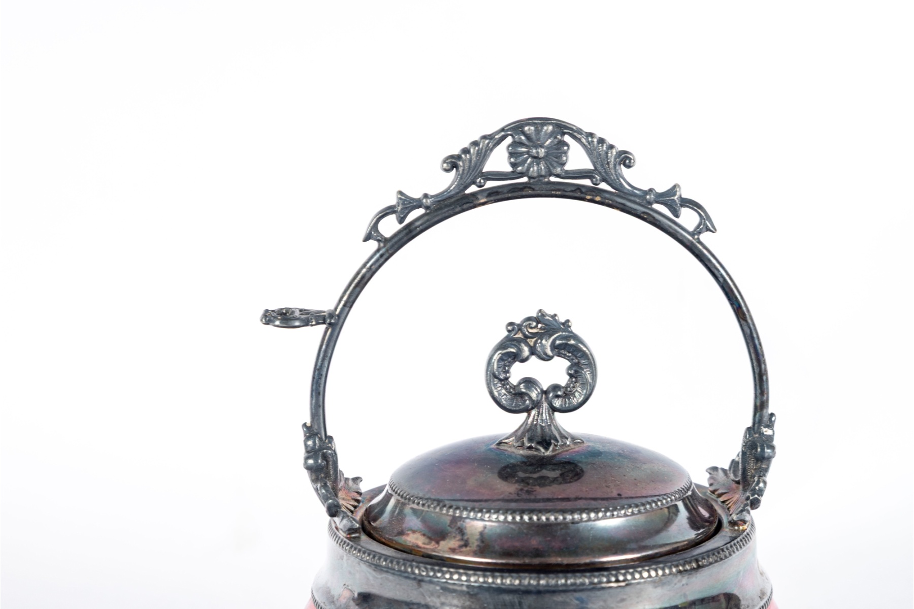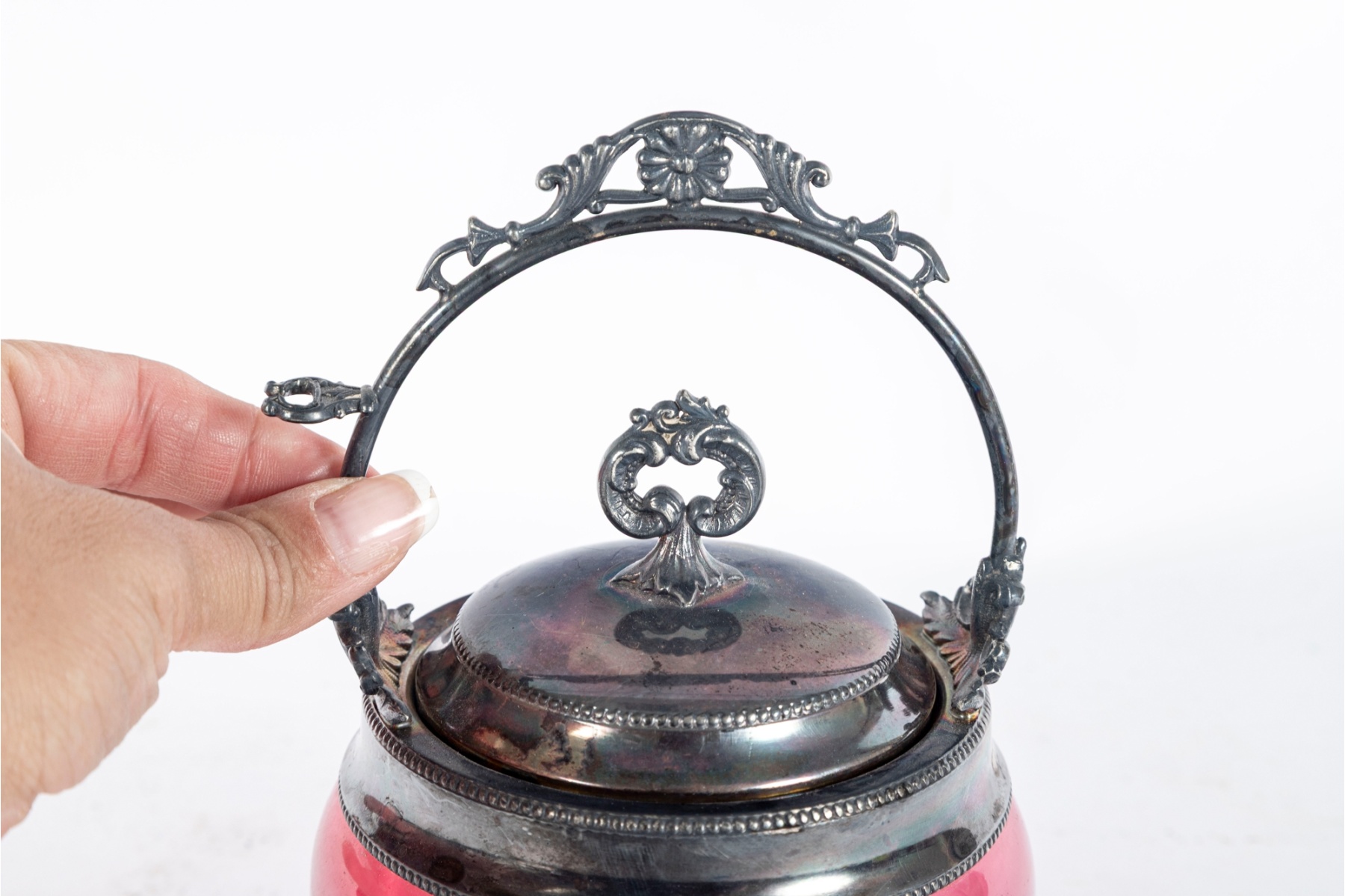 Charming antique biscuit jar featuring a vibrant cranberry glass body paired with an ornate silverplate lid and raised decorative swing handle.