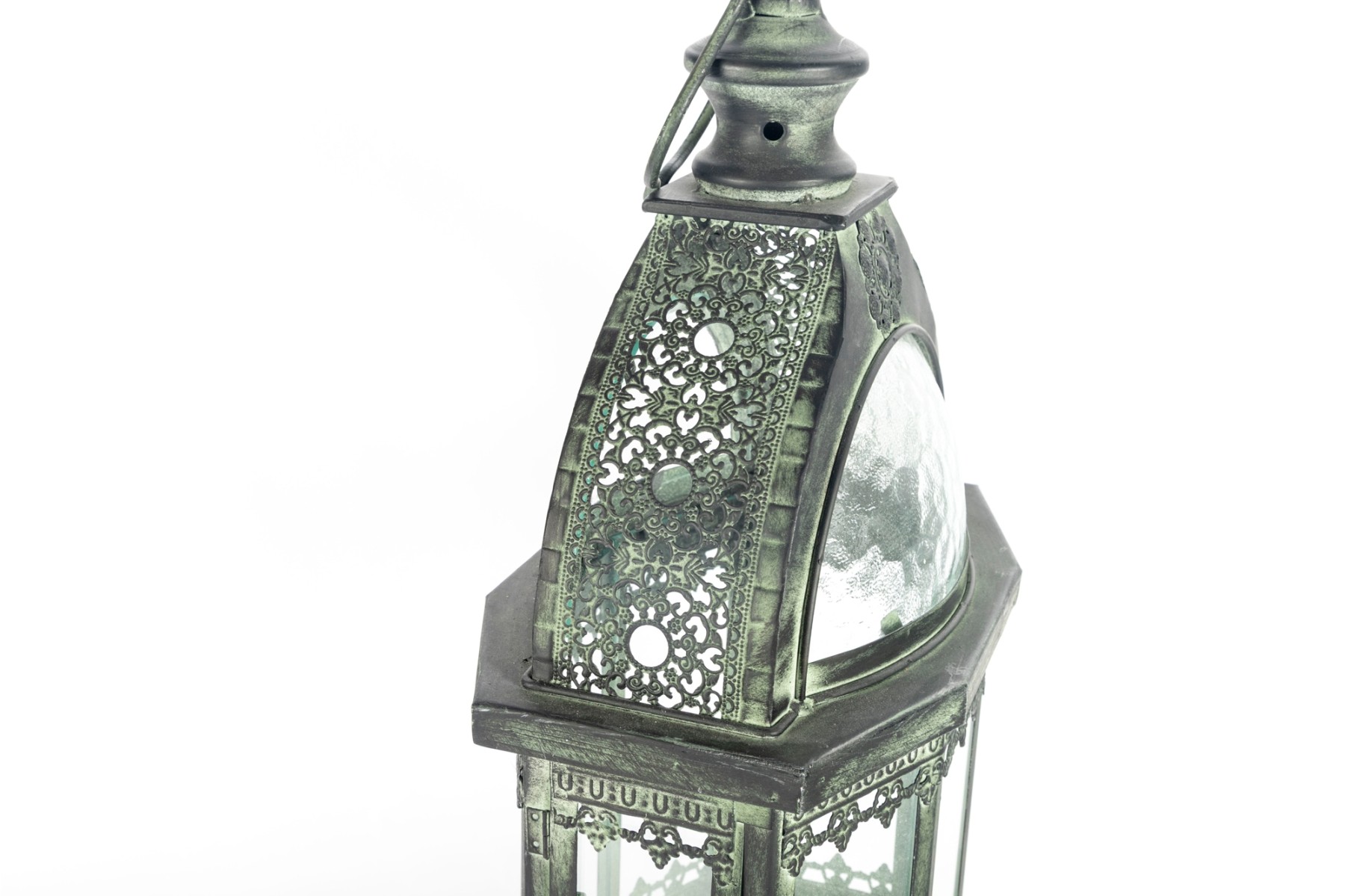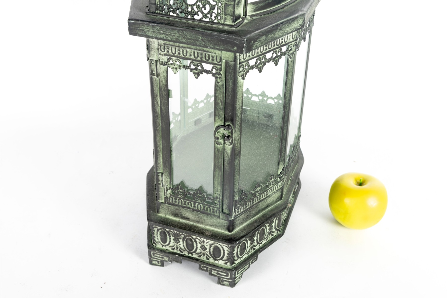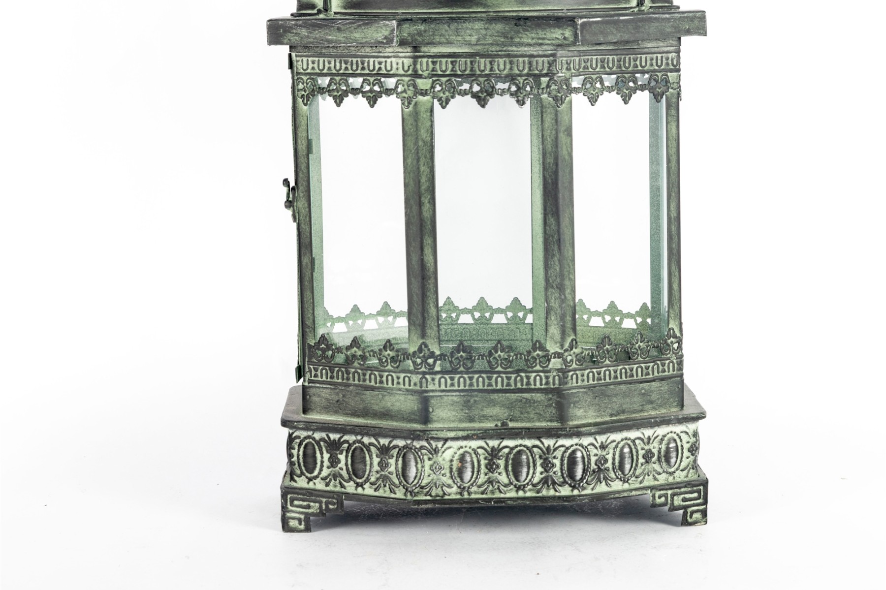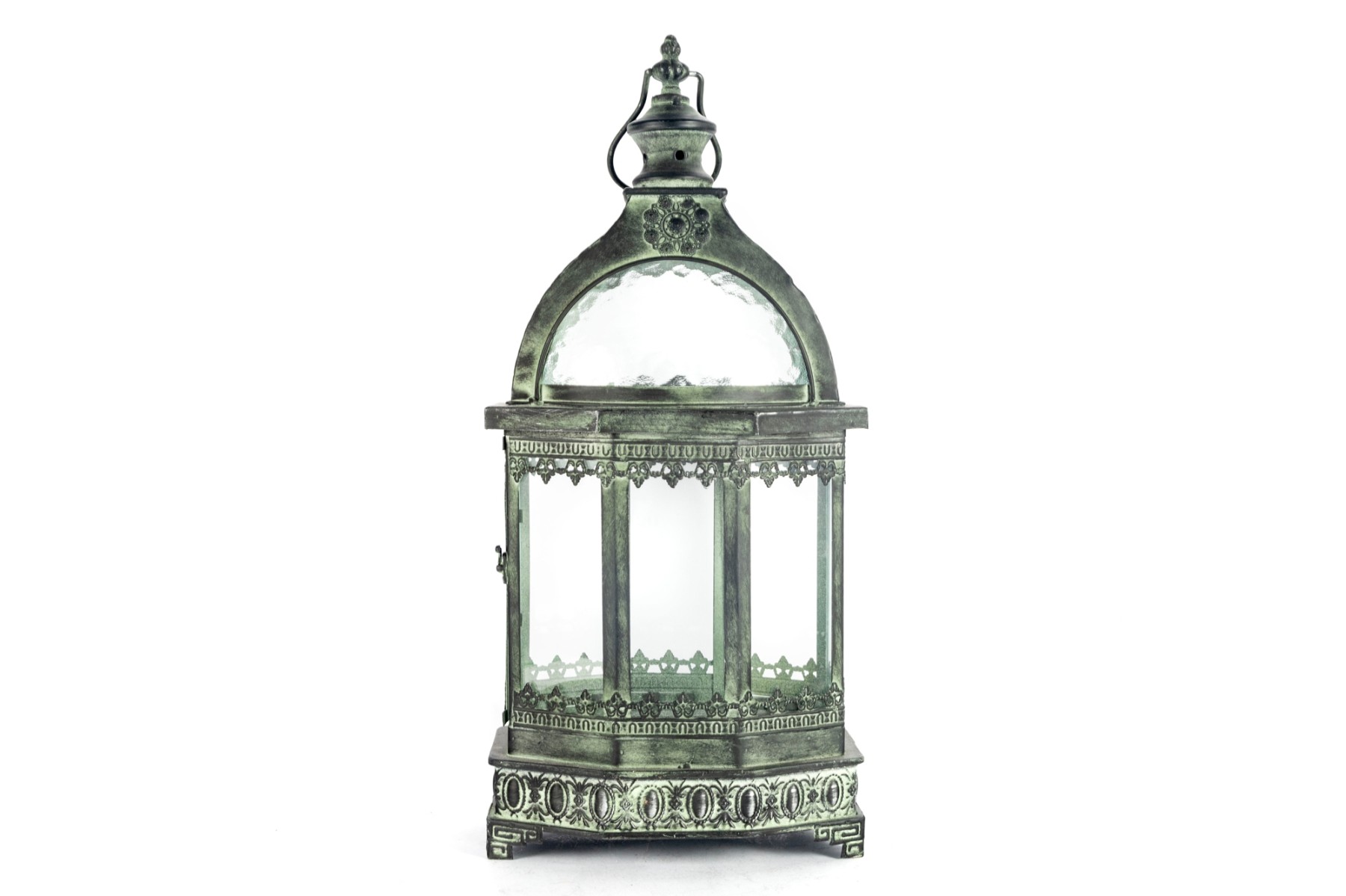 A decorative metal lantern with a faux distressed green-tone finish mimicking verdigris patina, and eight individual glass panels.