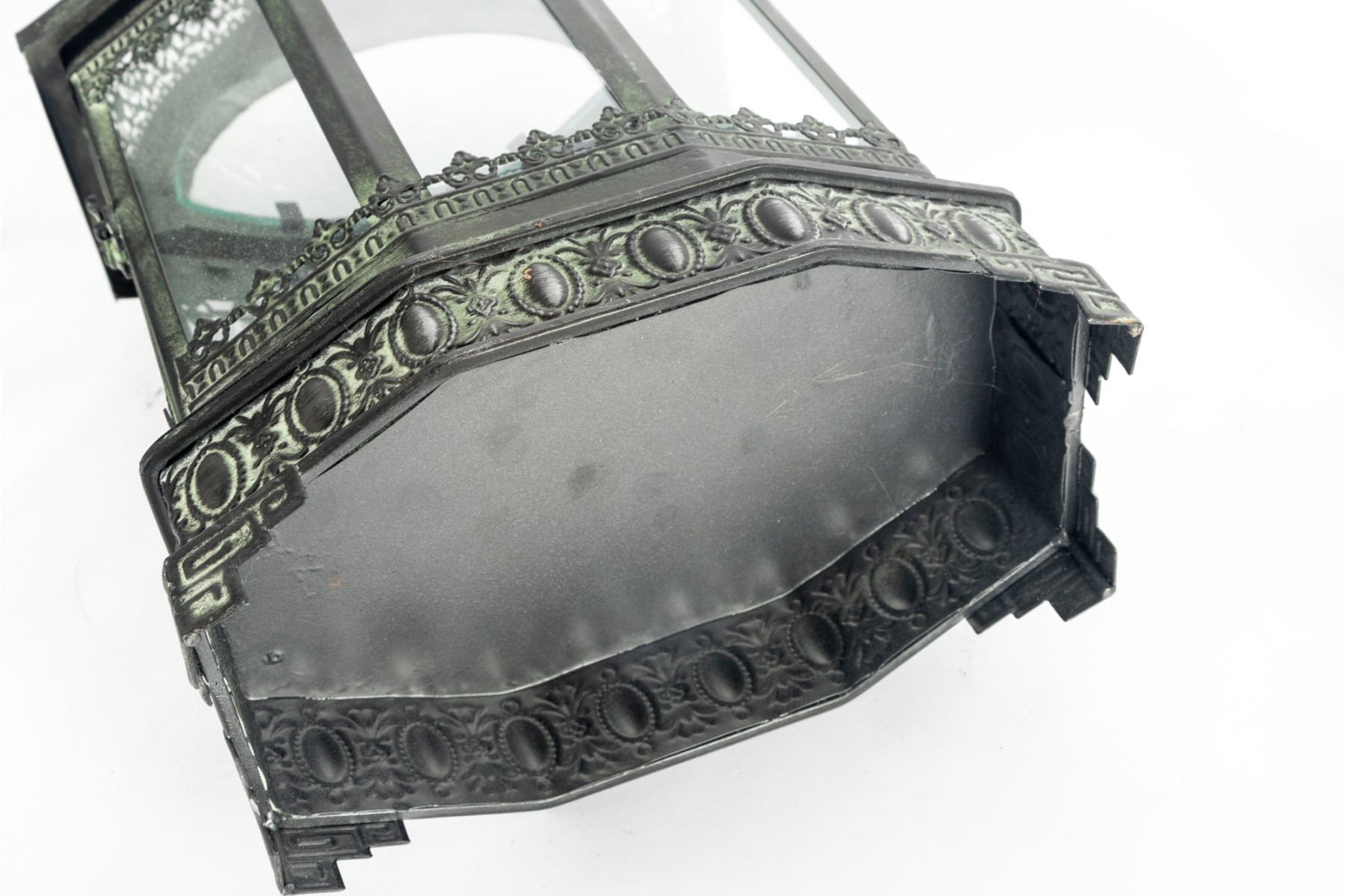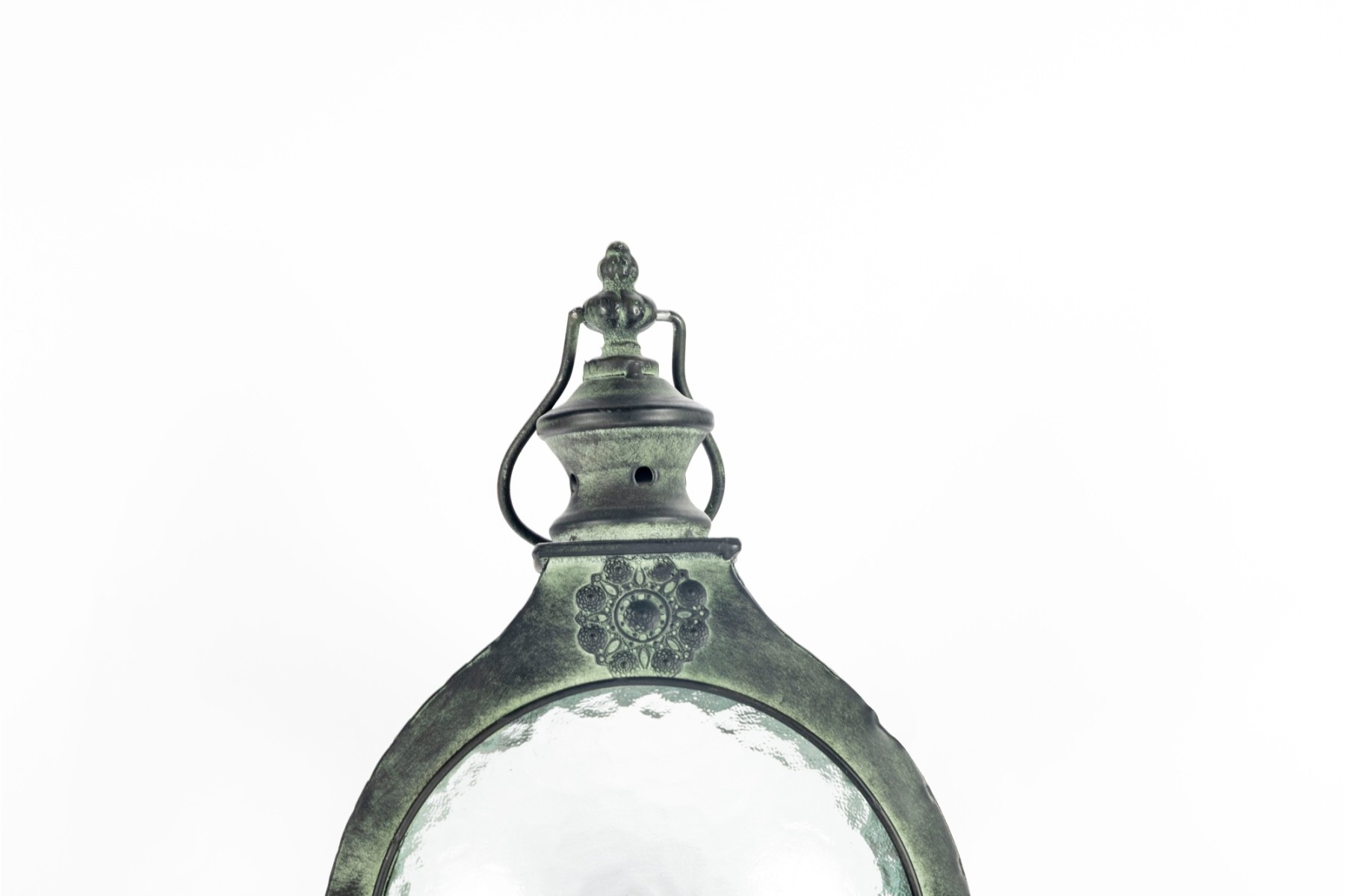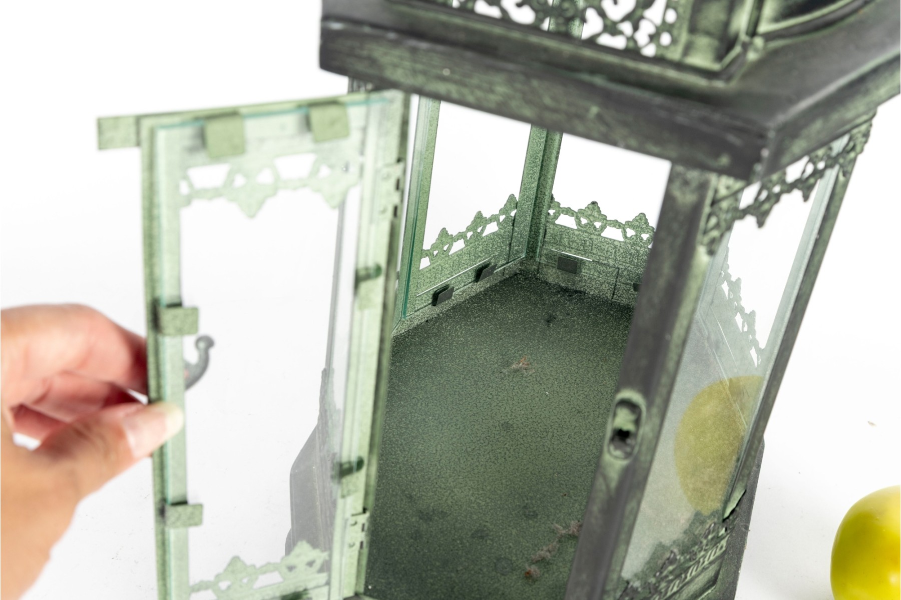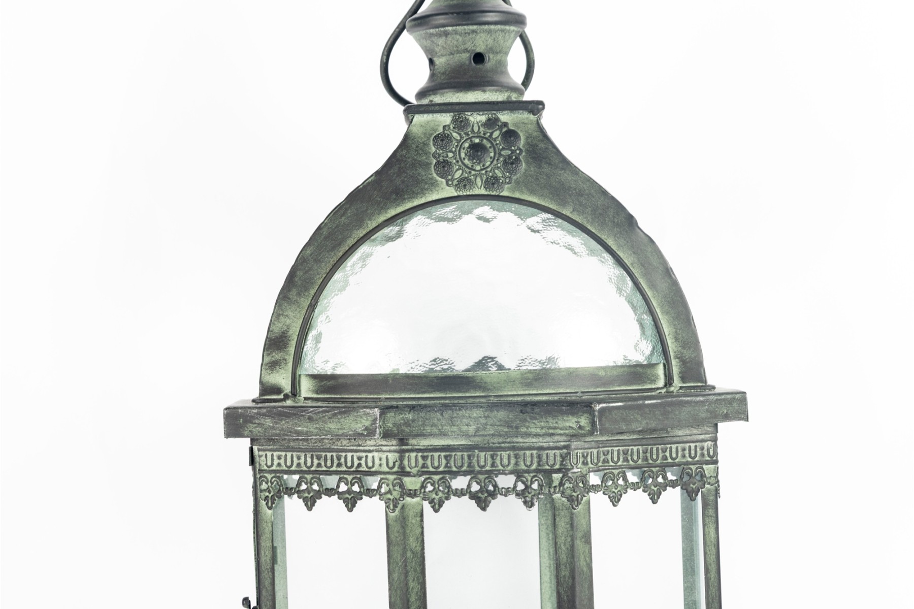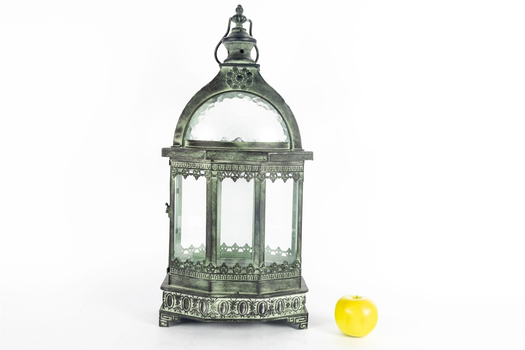 A decorative metal lantern with a faux distressed green-tone finish mimicking verdigris patina, and eight individual glass panels.