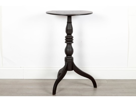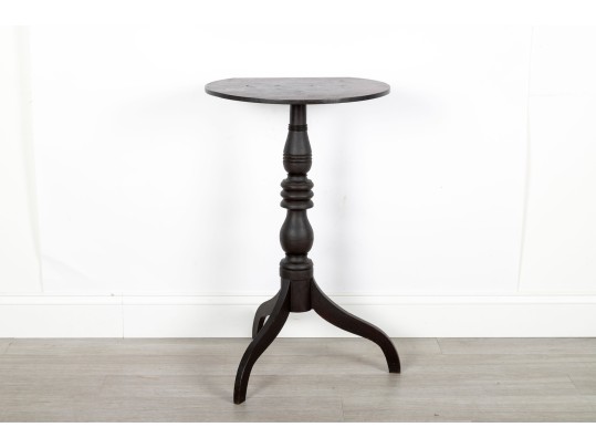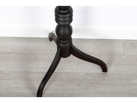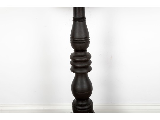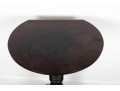 A Victorian style wood pedestal table with a deep mahogany finish and a lathe-turned central column terminating on tripod feet.