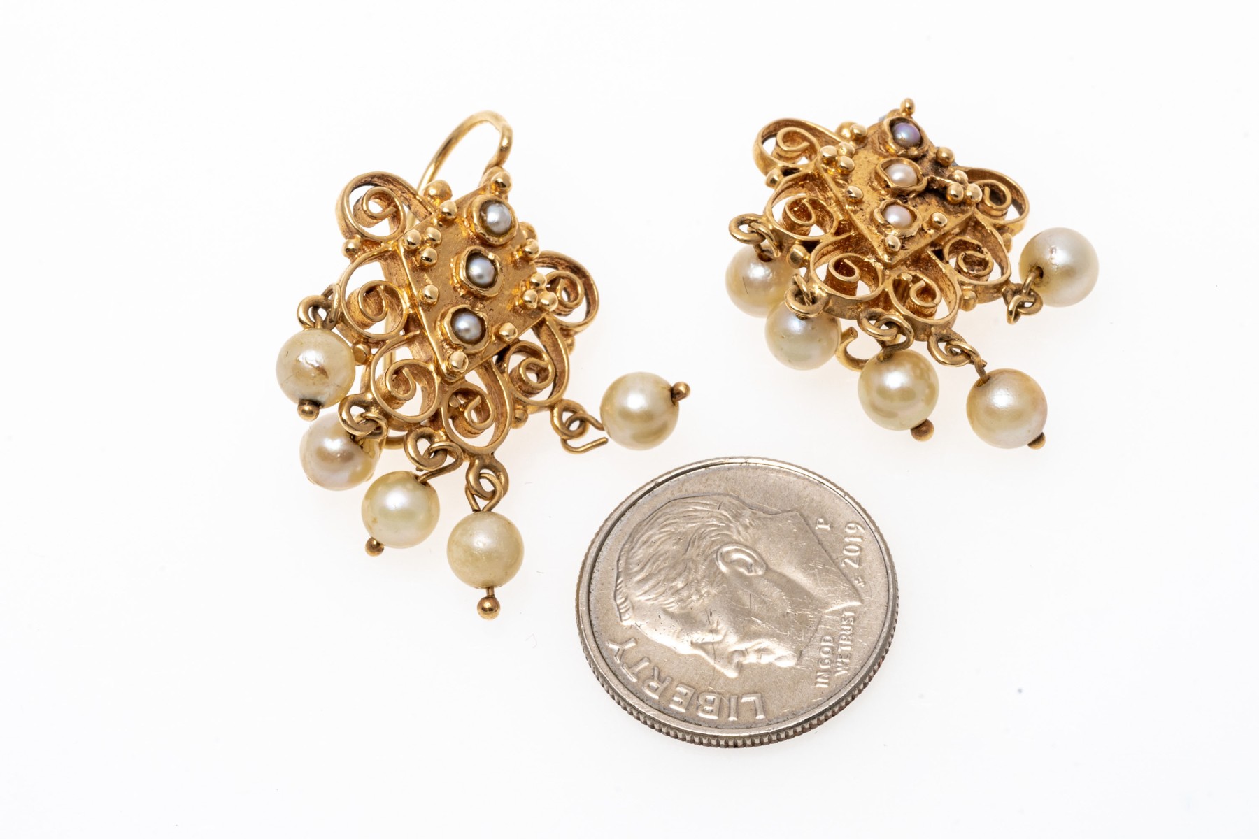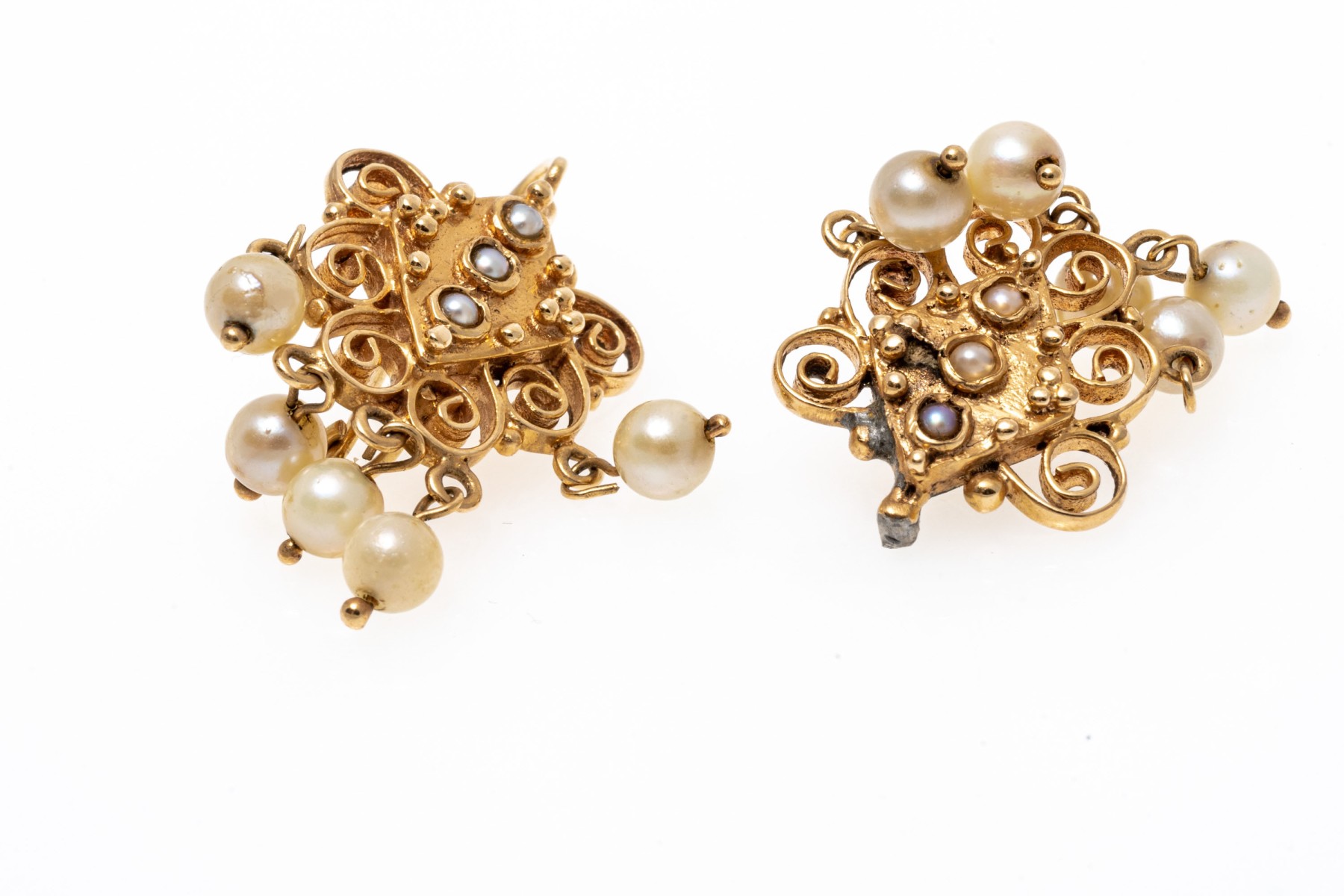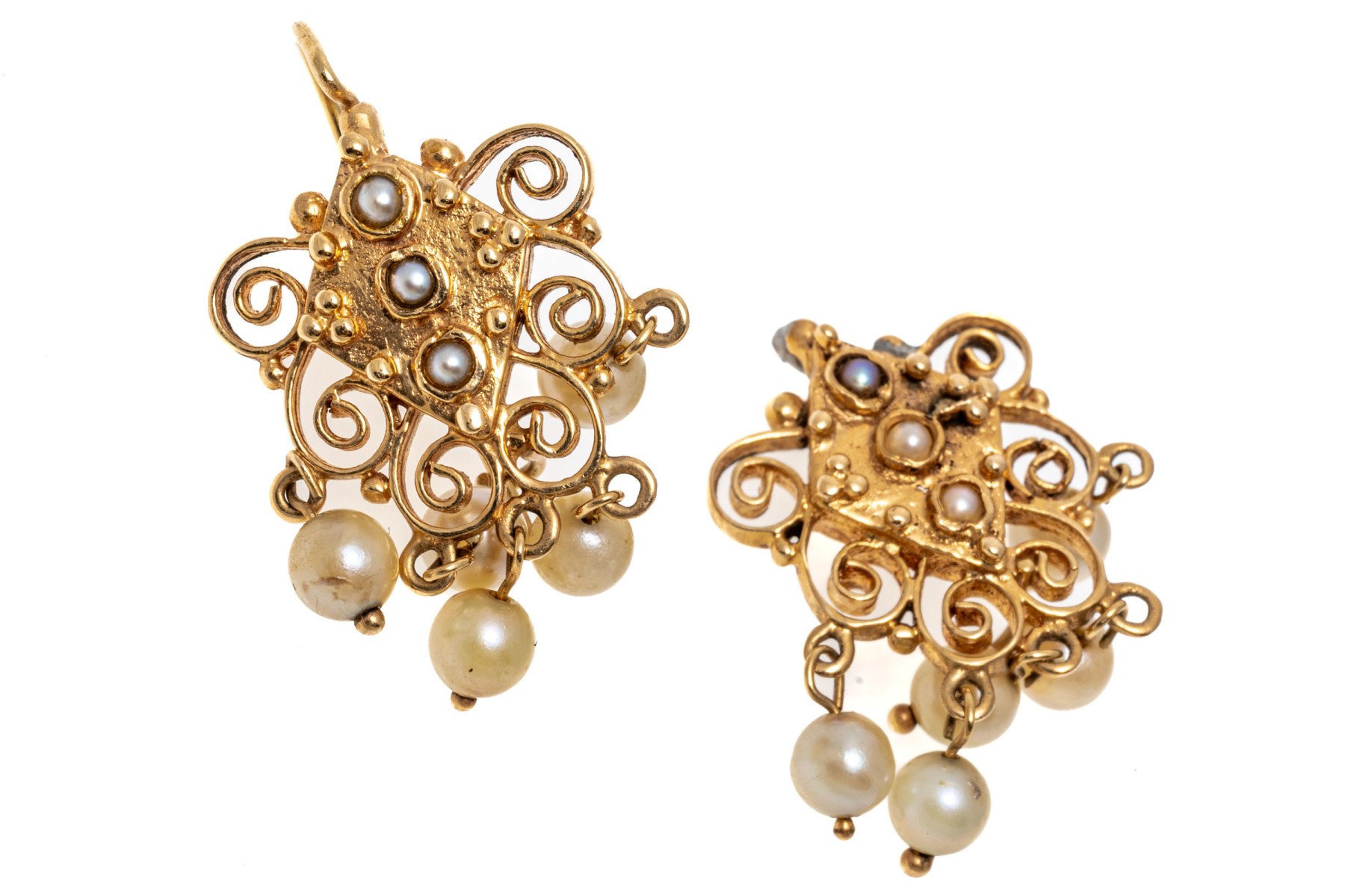Vintage pair of 14K yellow gold earrings. The earrings have a scrollwork design and display 4.4mm suspended pearls from the base of the earrings. Hook style backing.