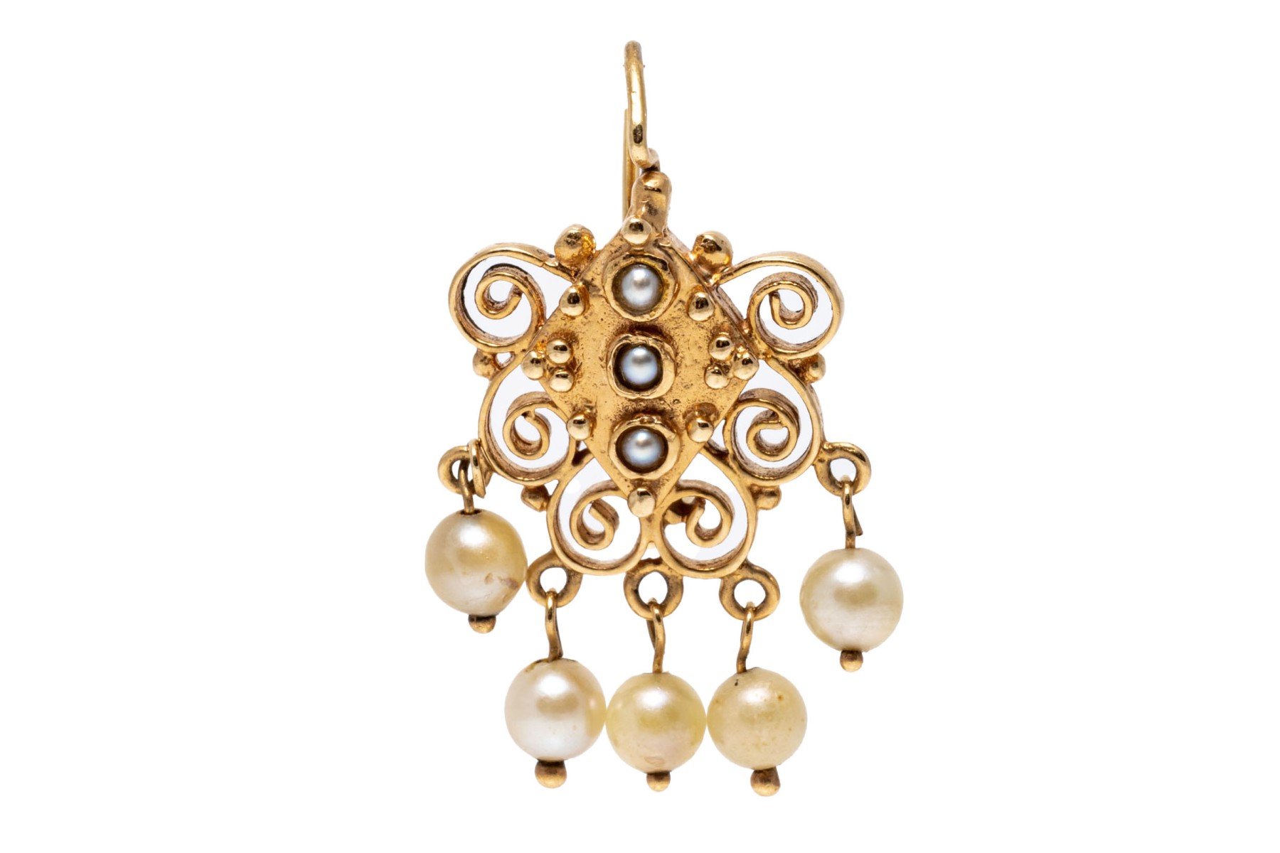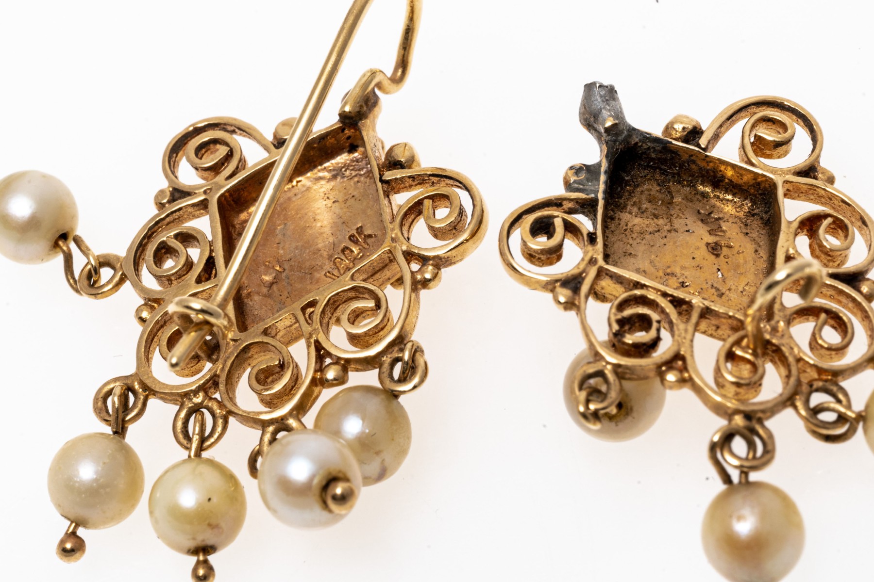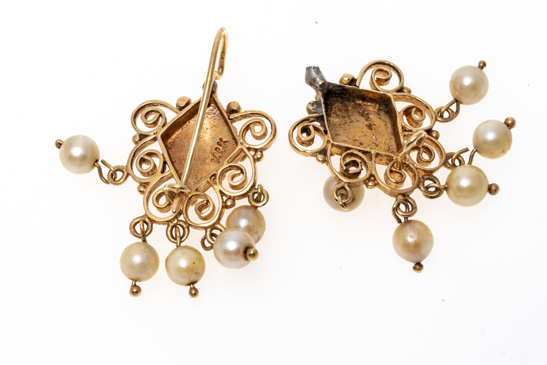 Vintage pair of 14K yellow gold earrings. The earrings have a scrollwork design and display 4.4mm suspended pearls from the base of the earrings. Hook style backing.