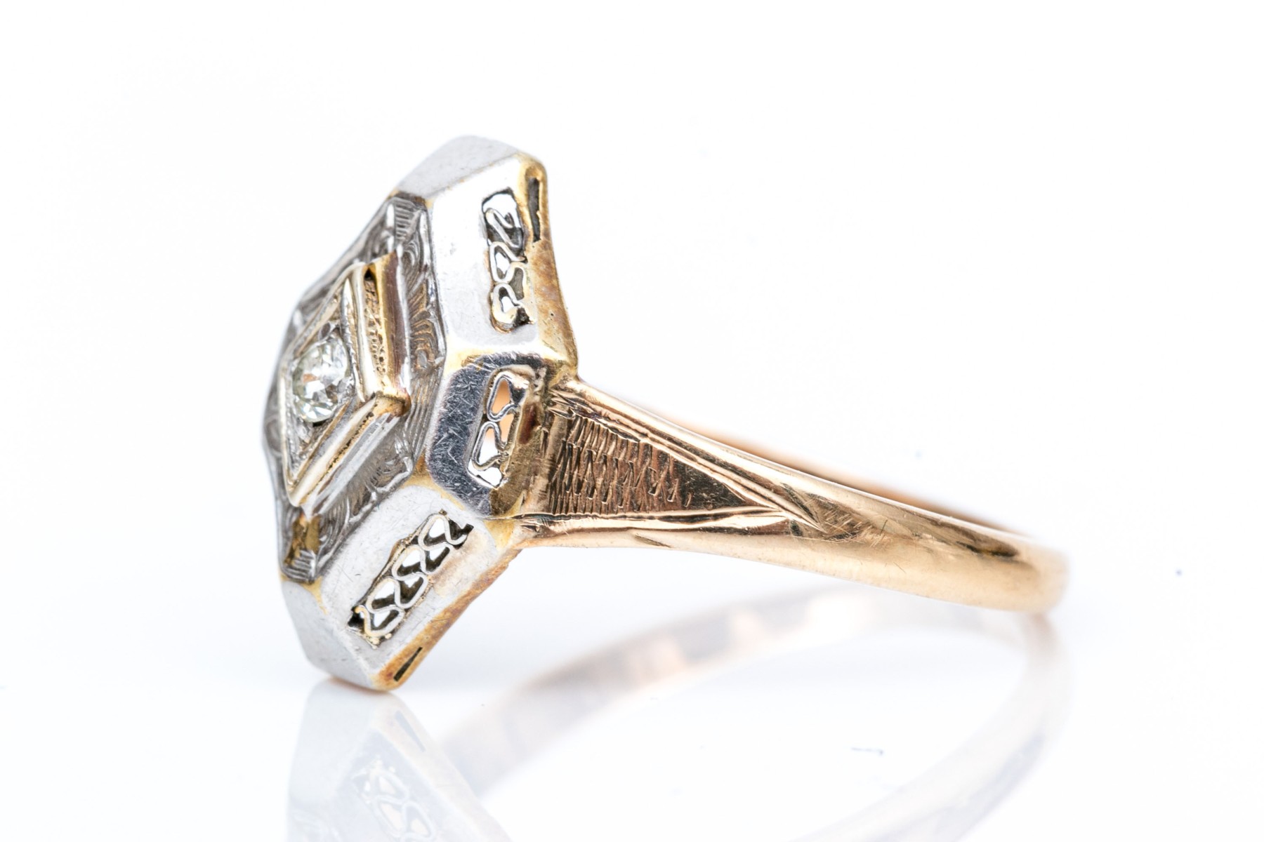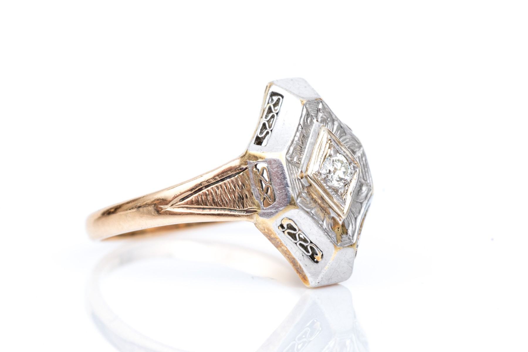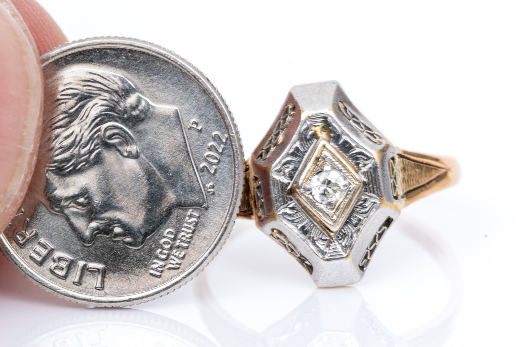 Vintage 14K yellow gold ring. The octagonal face of the ring has a delicate engraving with filigree sides and an accent diamond at the center. Ring size 6.25.