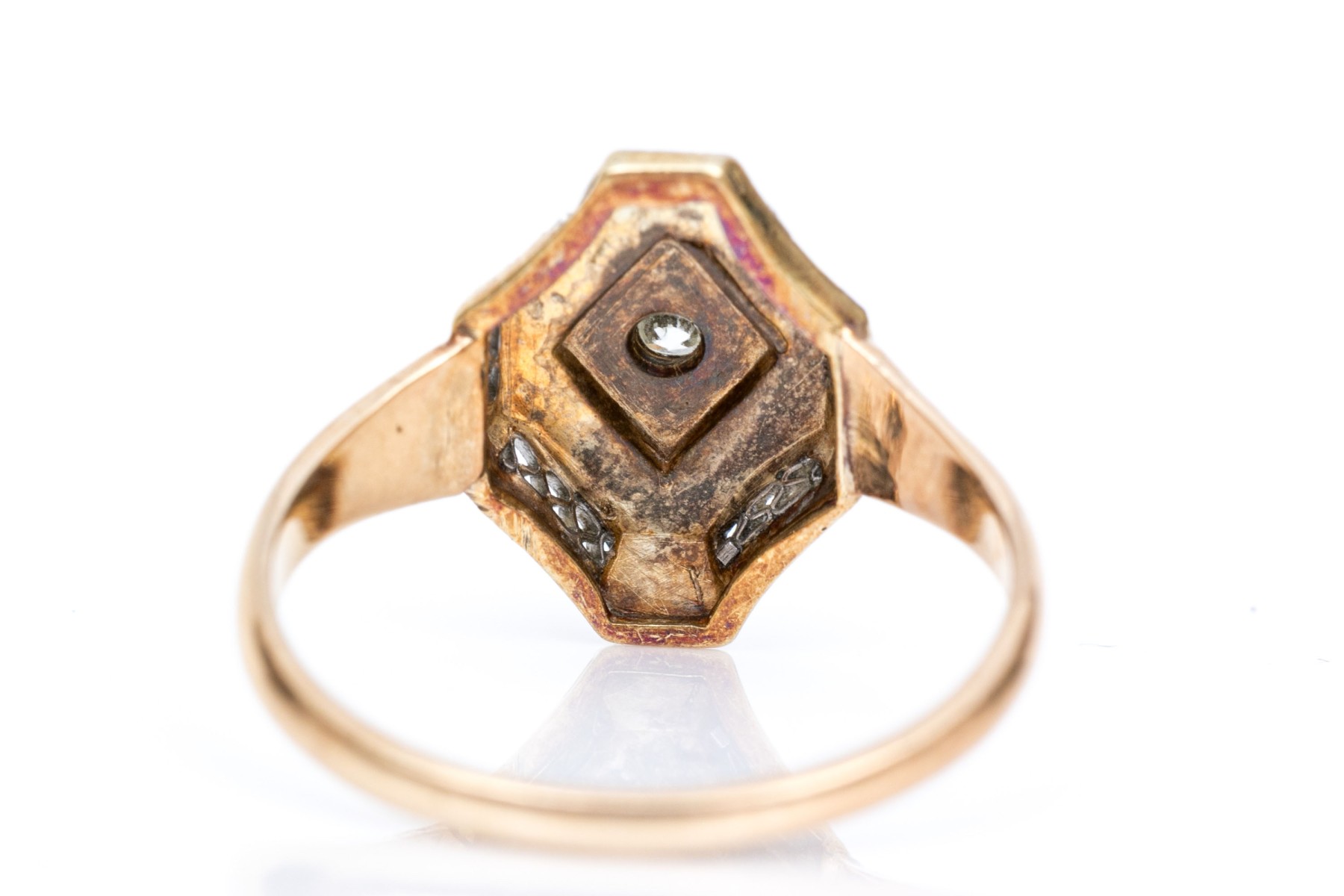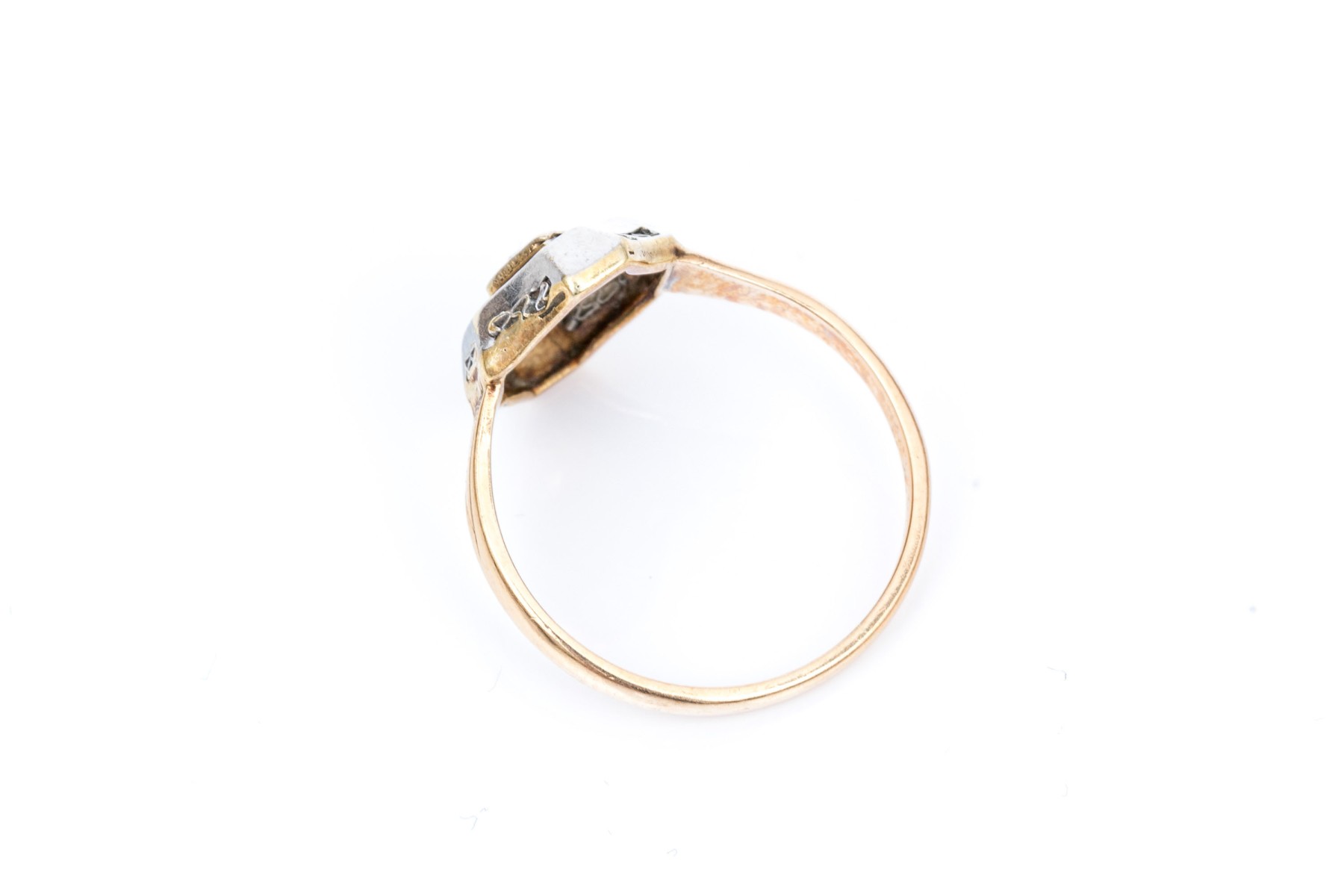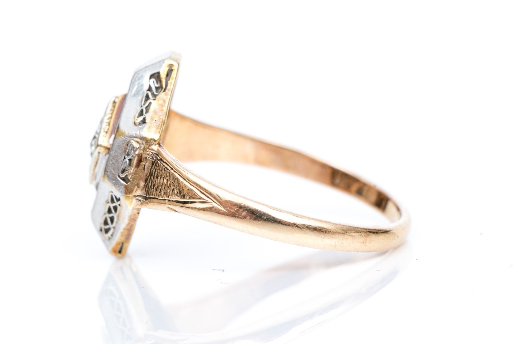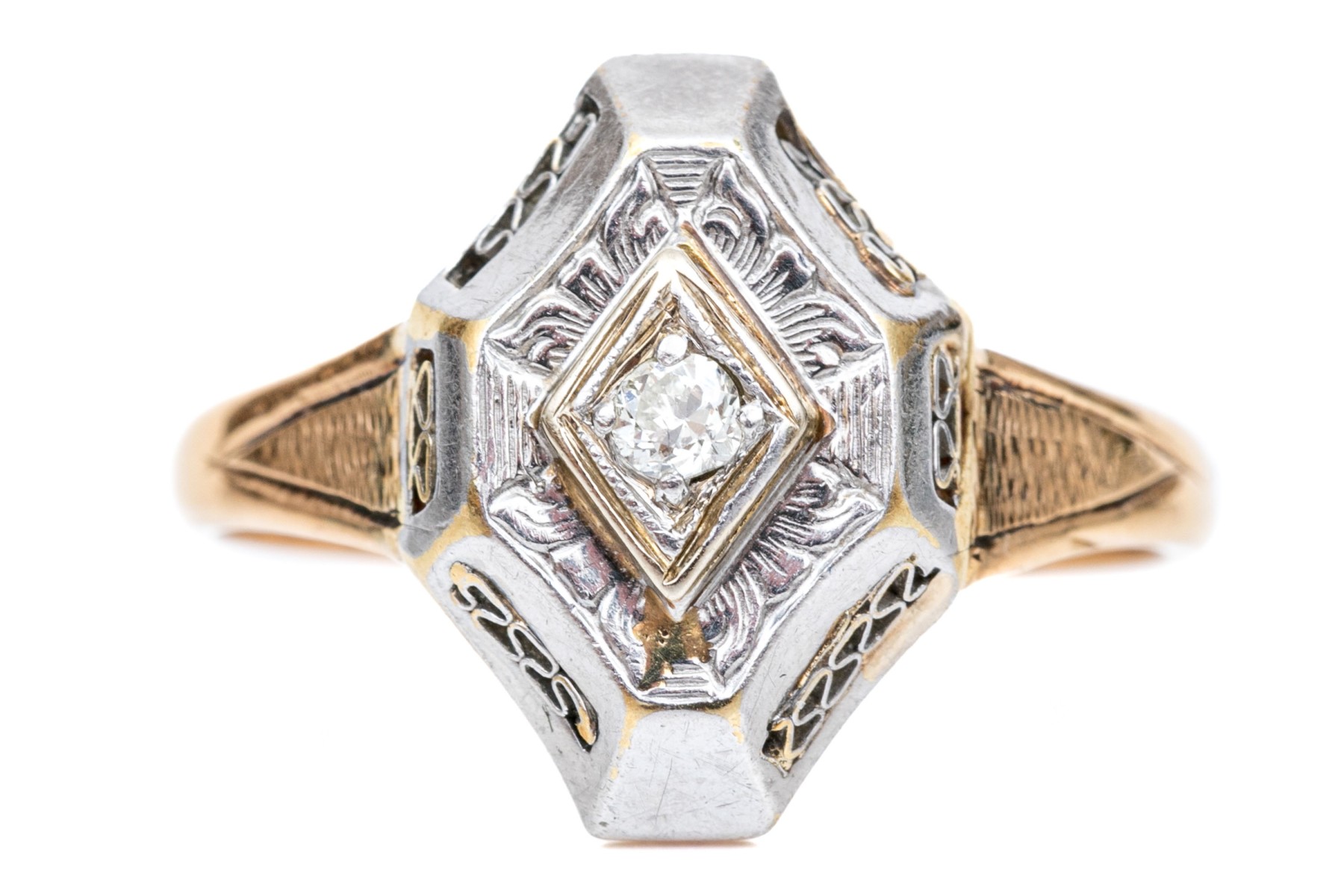 Vintage 14K yellow gold ring. The octagonal face of the ring has a delicate engraving with filigree sides and an accent diamond at the center. Ring size 6.25.