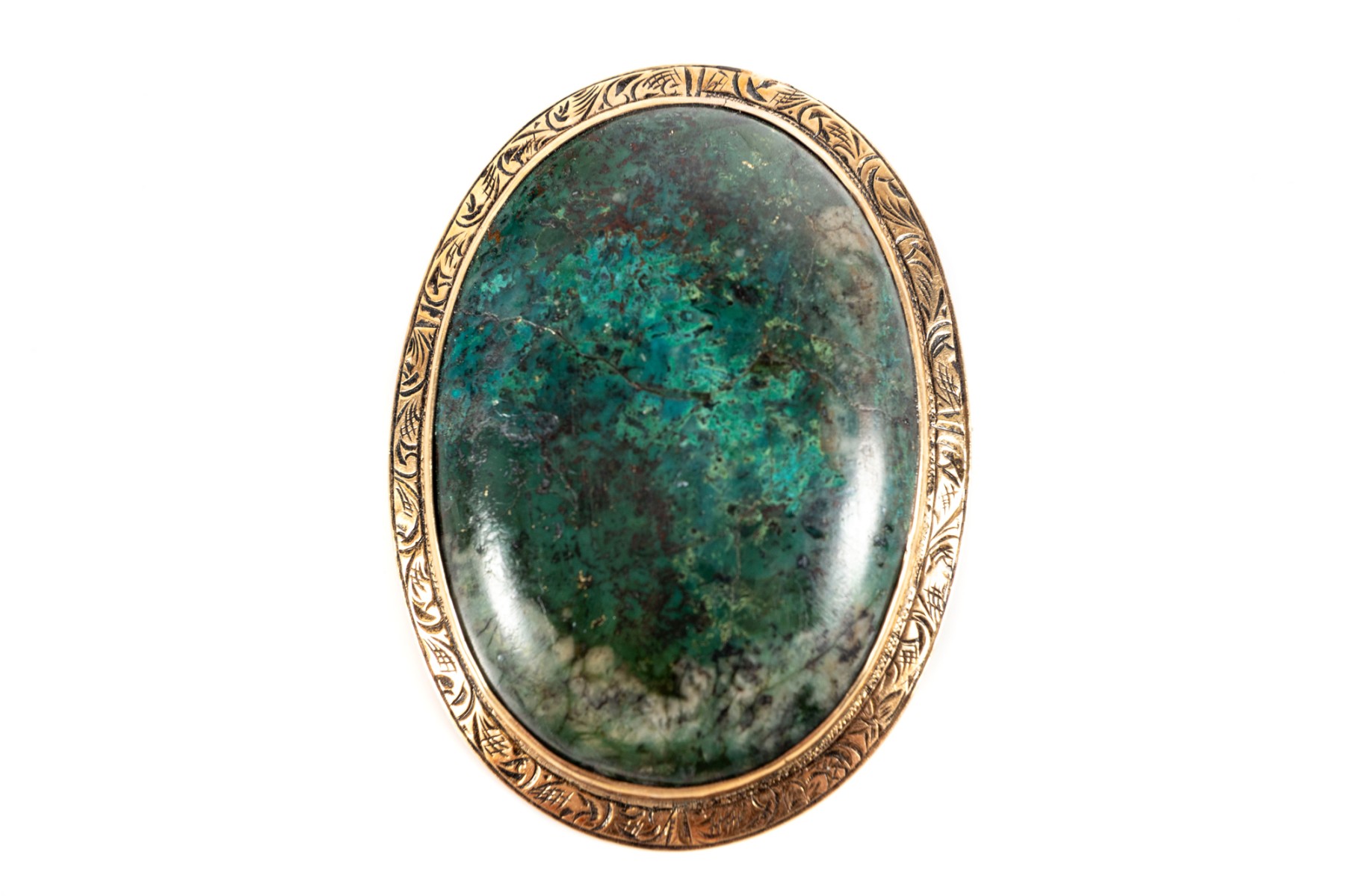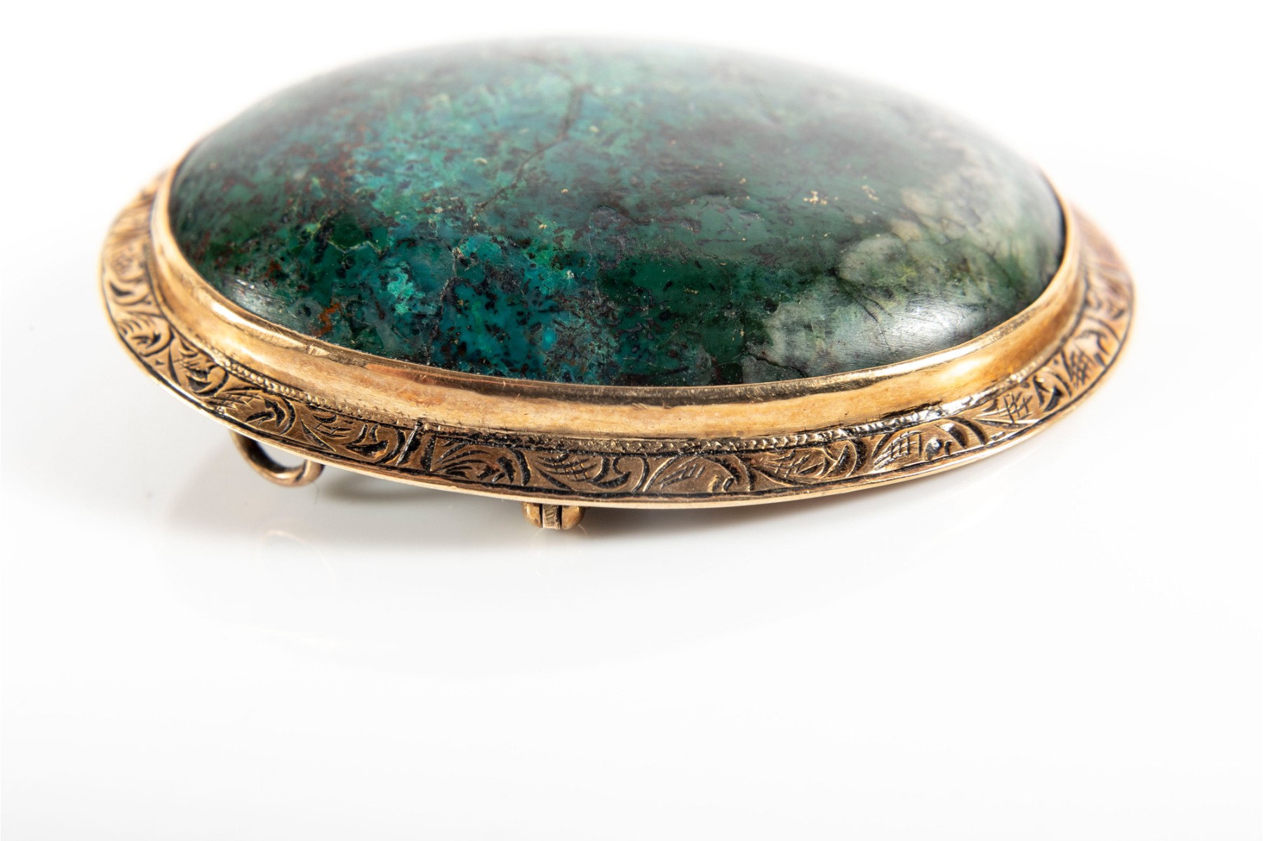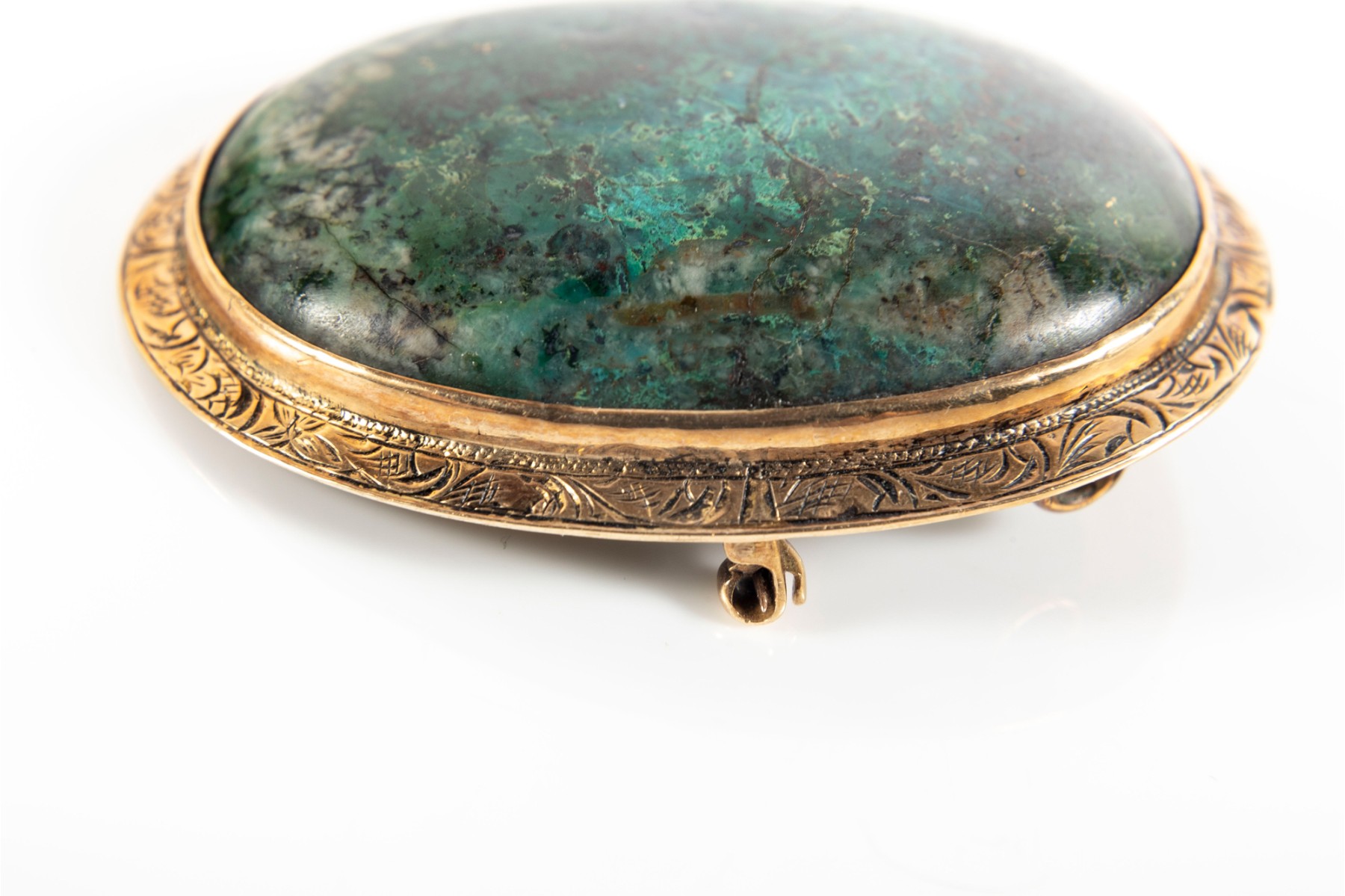A handsome yellow gold brooch with bails at the back for use as a pendant, displaying a chased bezel frame around an oval chrysocolla in mottled green with pyrite flecking.