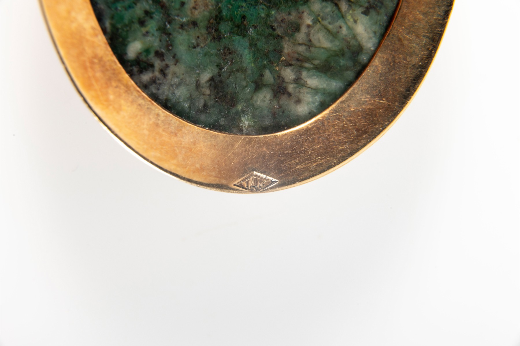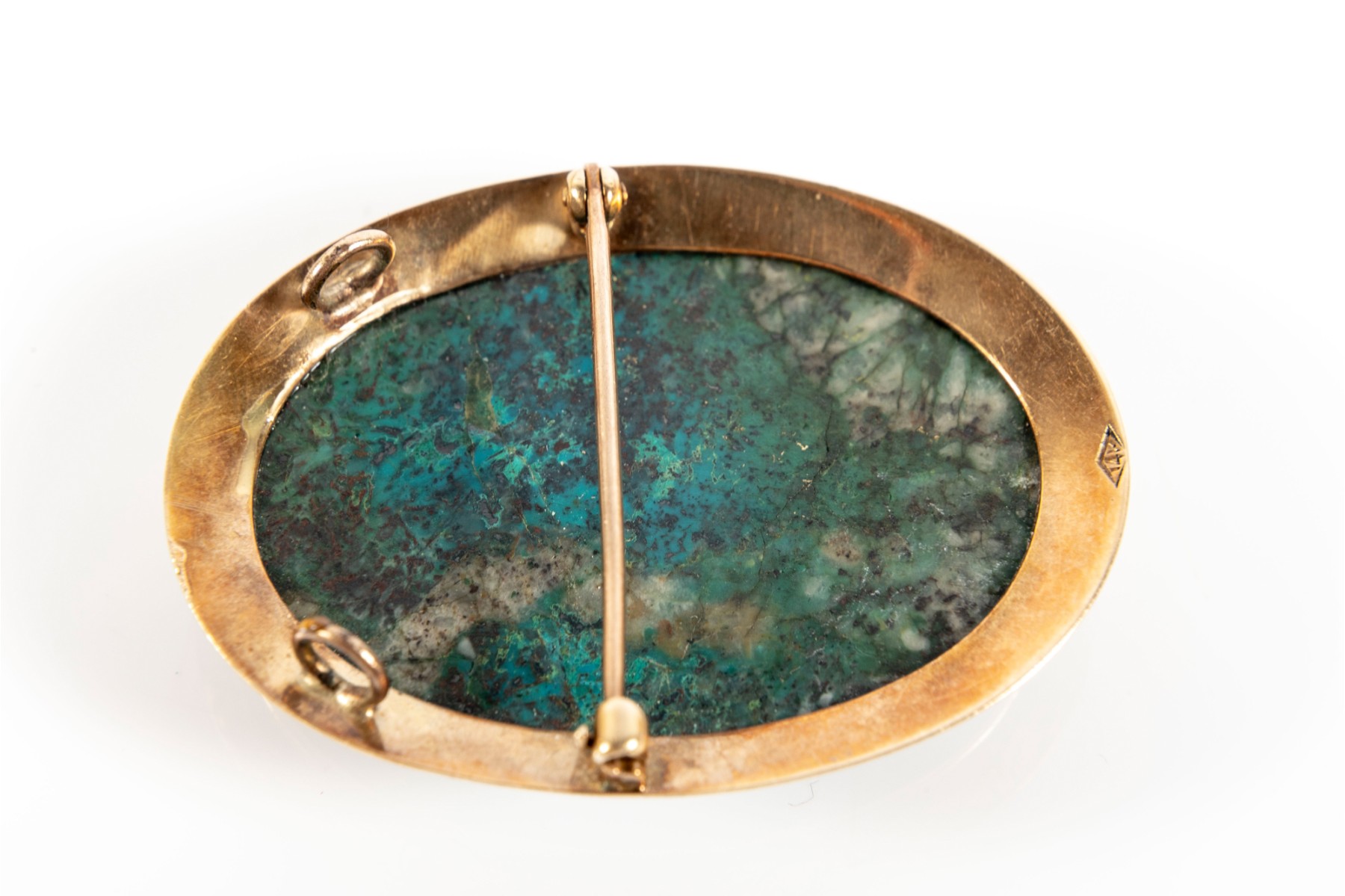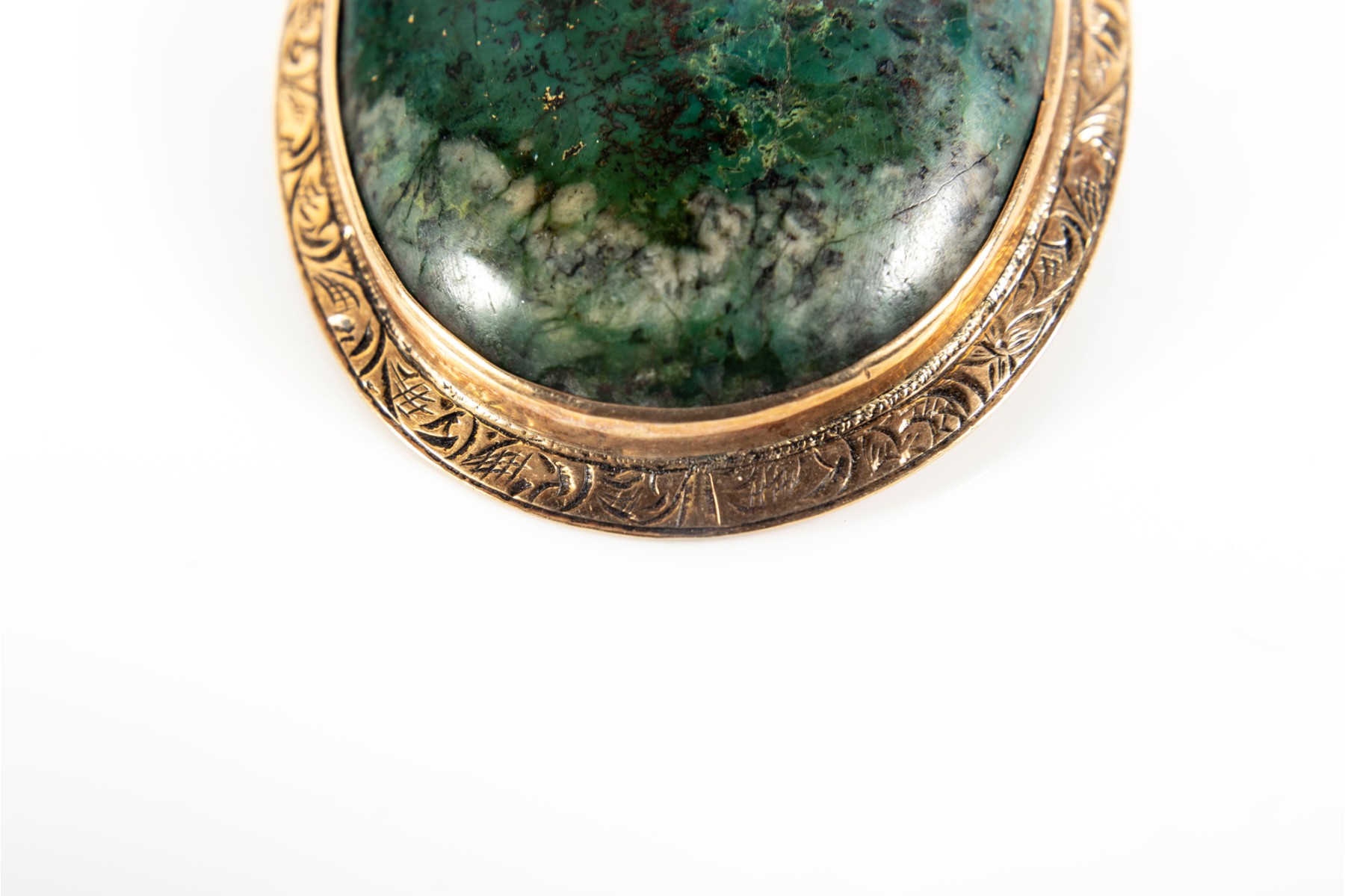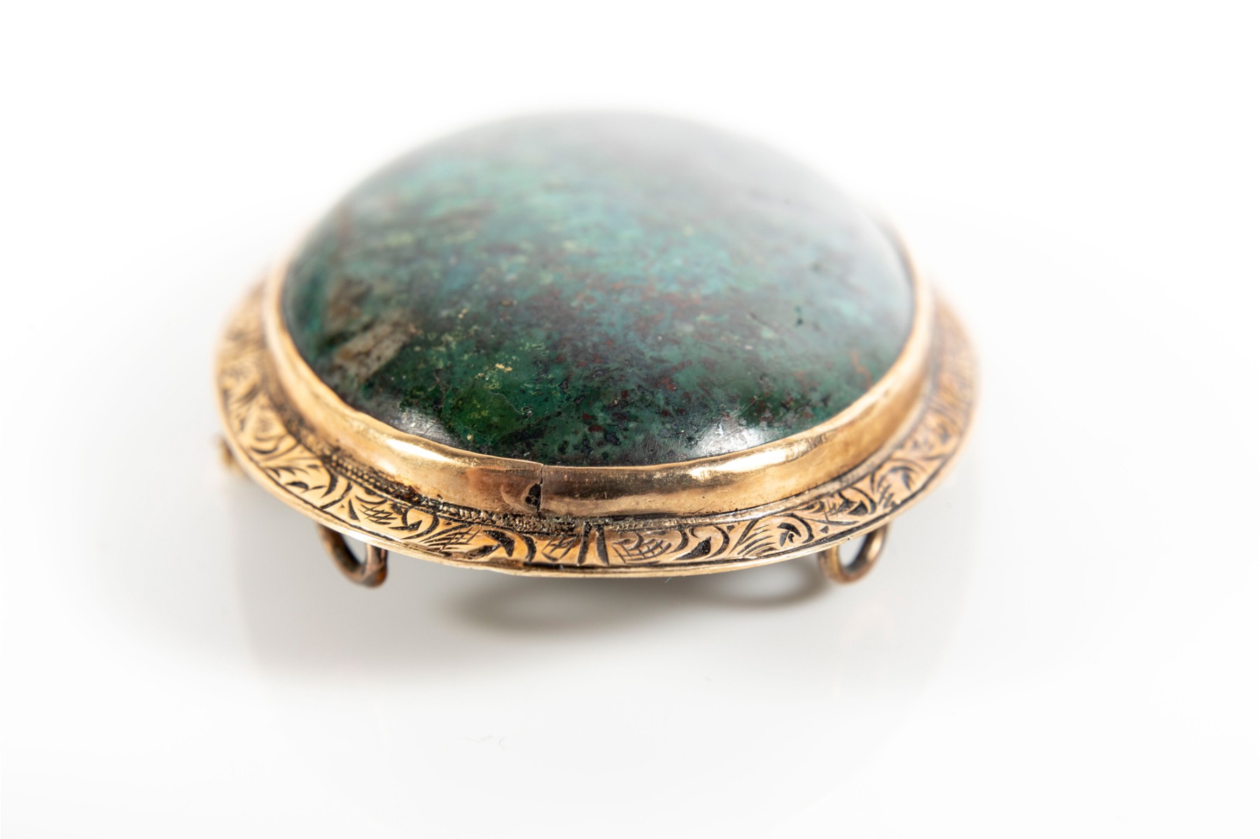 A handsome yellow gold brooch with bails at the back for use as a pendant, displaying a chased bezel frame around an oval chrysocolla in mottled green with pyrite flecking.