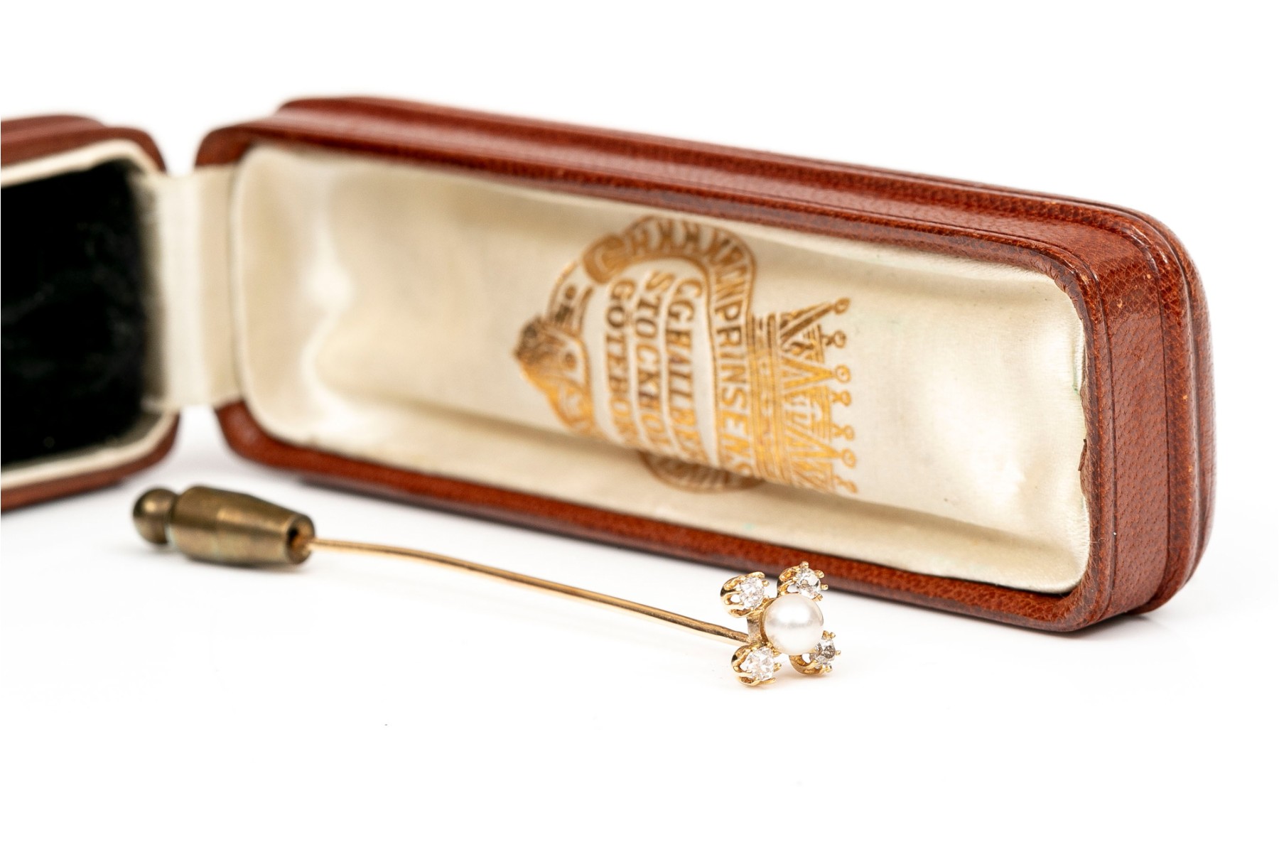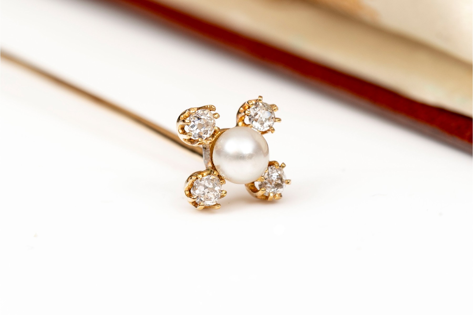 A vintage 18K yellow gold stick pin. Set at the top of the pin is a cluster of four round faceted diamonds surrounding a single 4mm bright white cultured freshwater pearl. The diamonds are approximately 0.12 TCW.