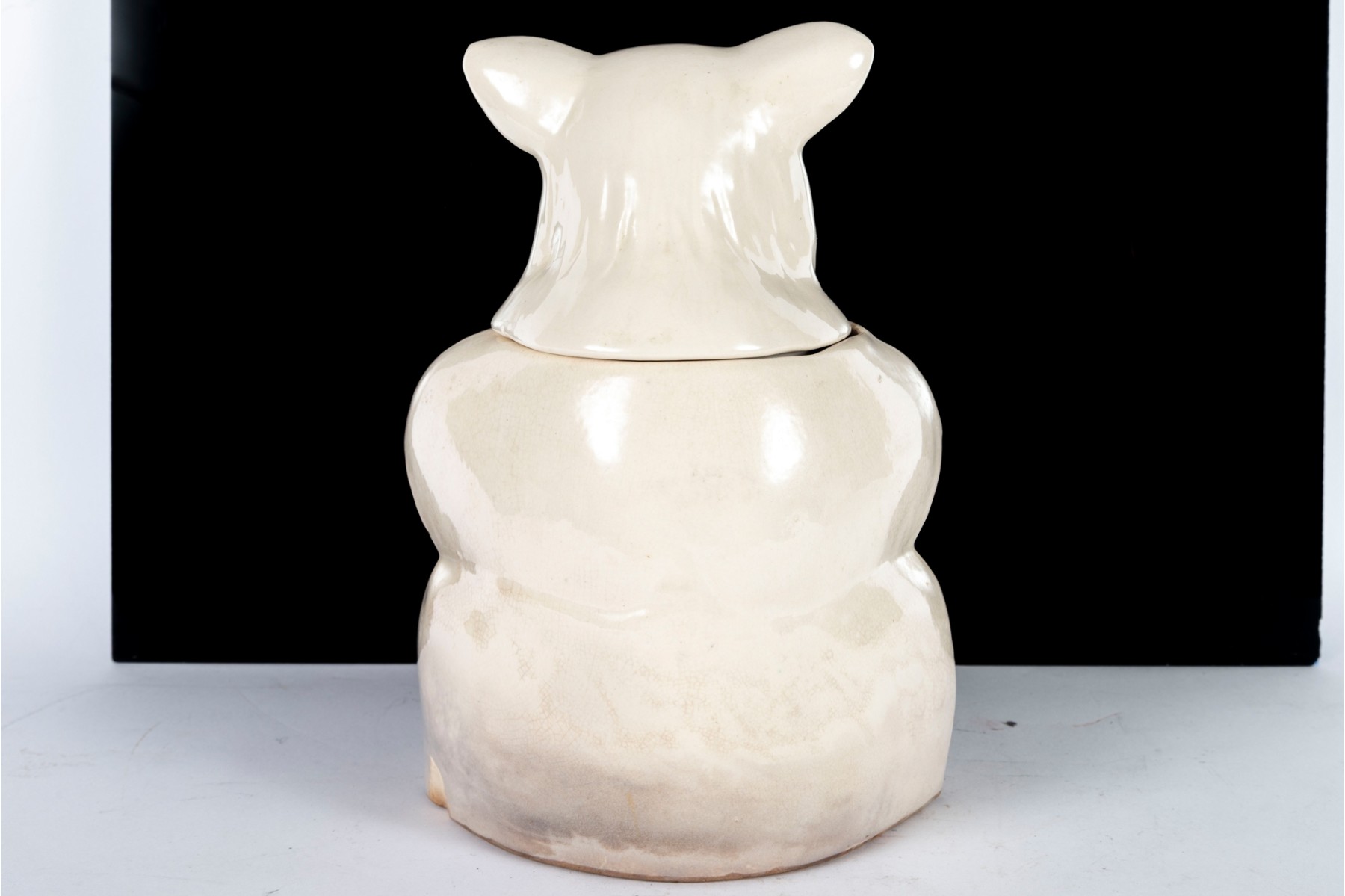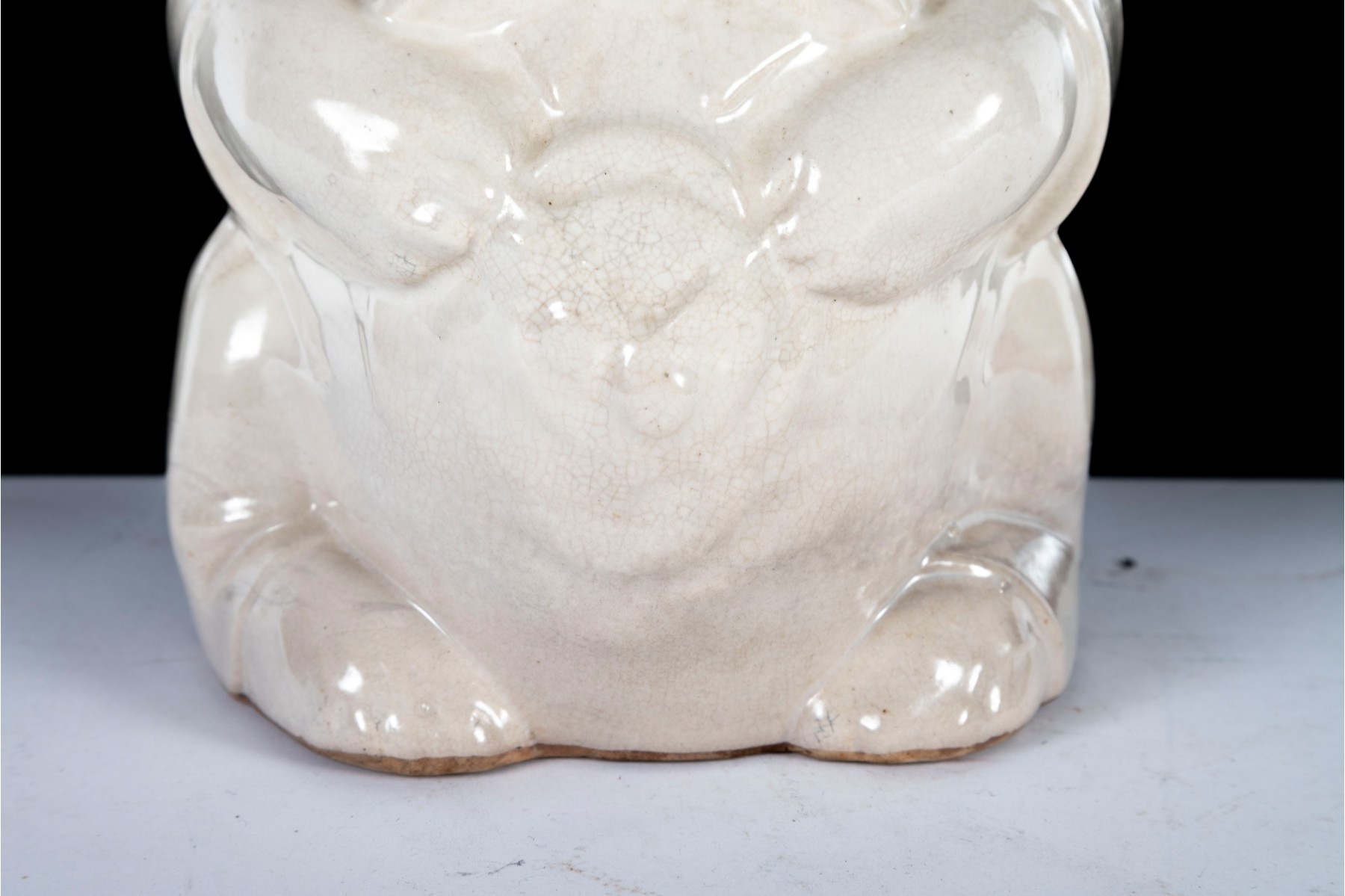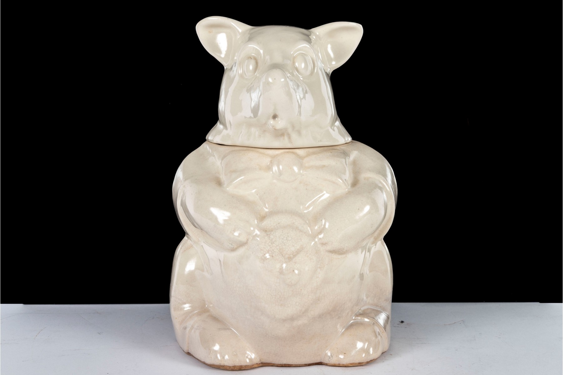 A charming 1940's ceramic cookie jar by McCoy Pottery, depicting a seated white bear with detailed facial features and bow tie, displaying a plain cream glaze with a crazed finish.