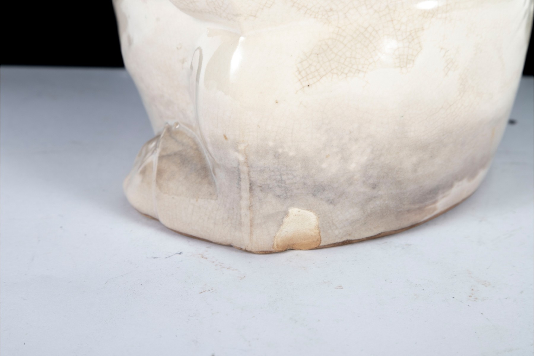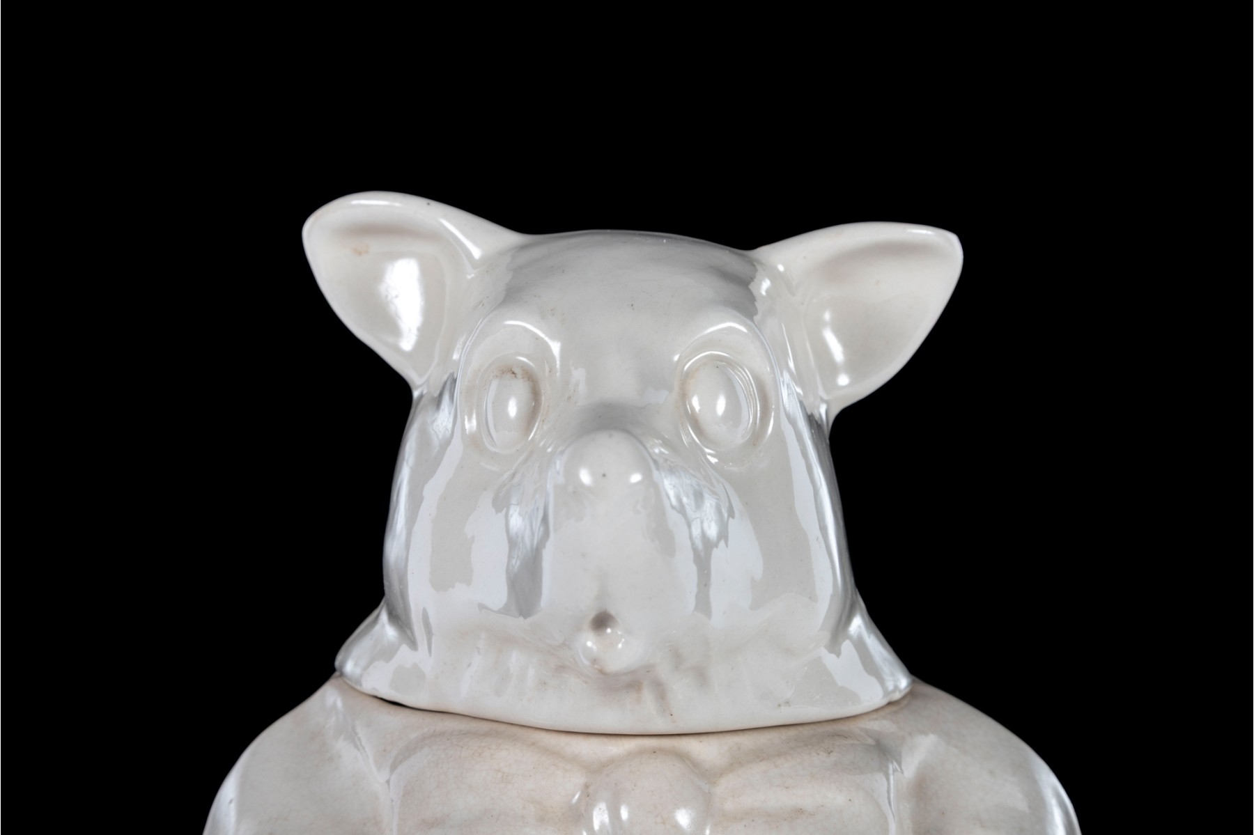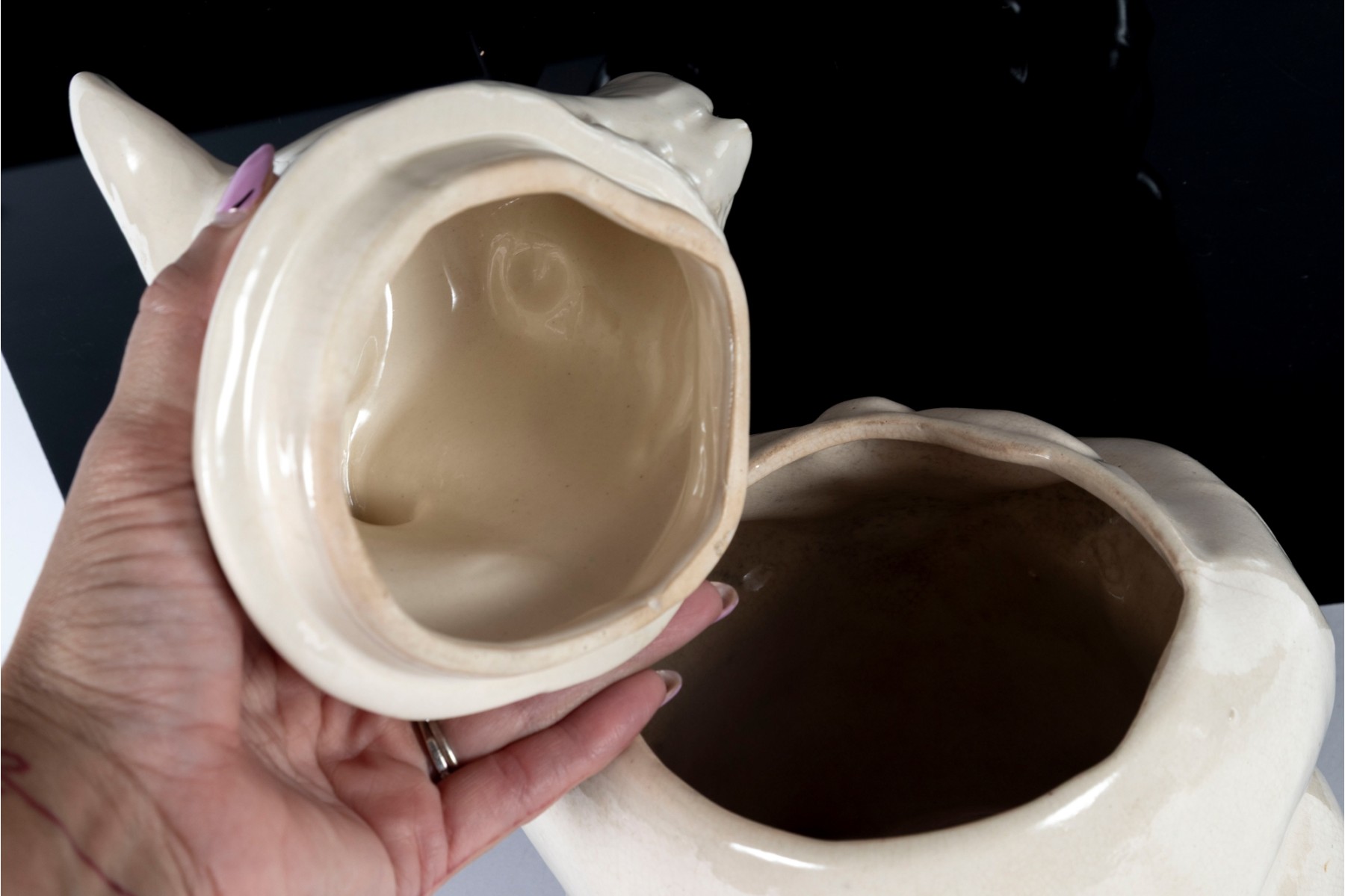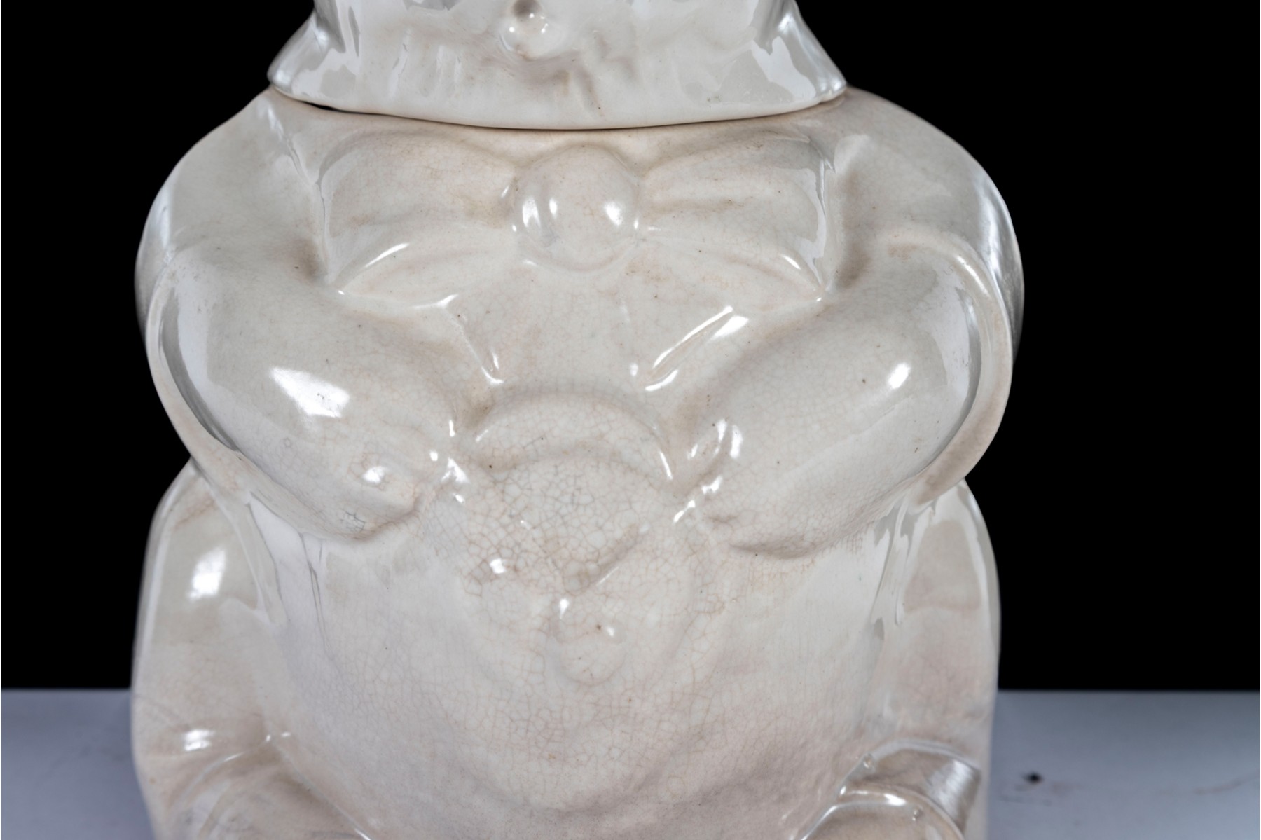 A charming 1940's ceramic cookie jar by McCoy Pottery, depicting a seated white bear with detailed facial features and bow tie, displaying a plain cream glaze with a crazed finish.