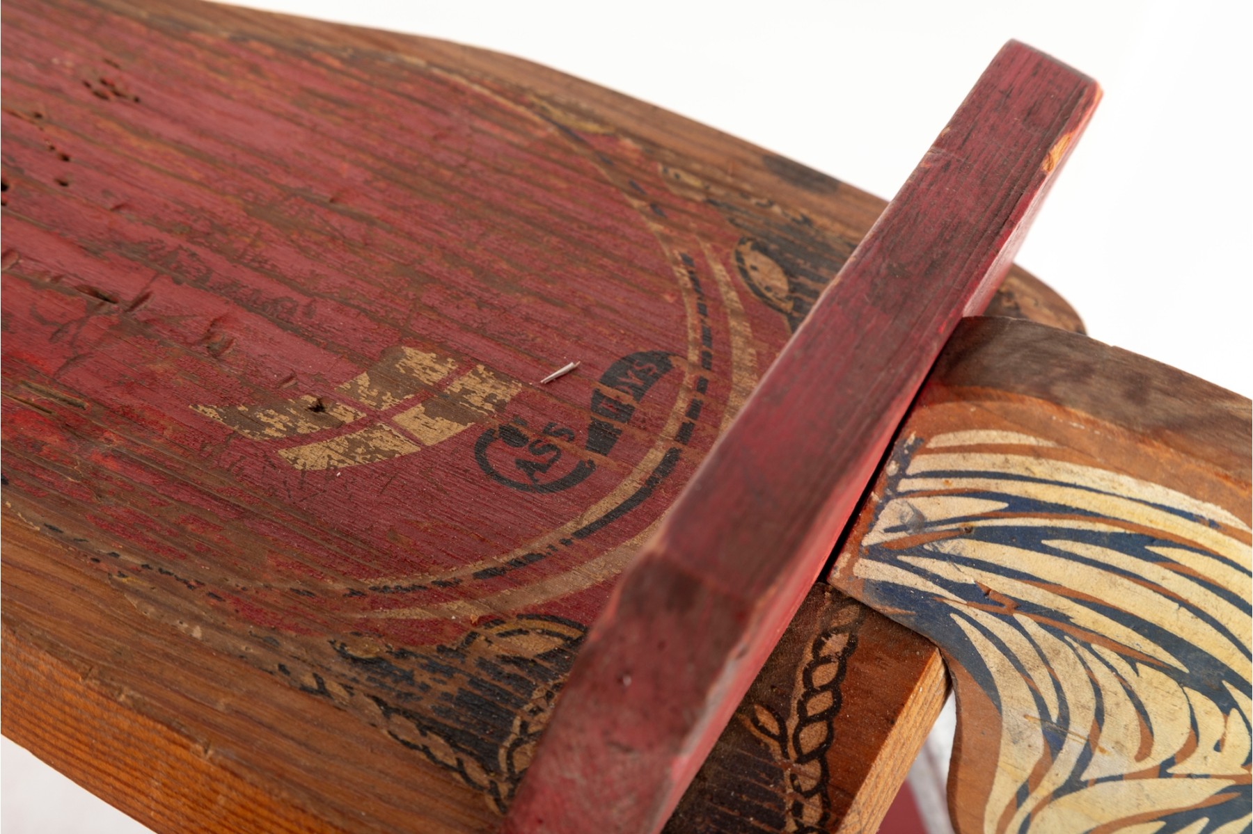 Consistent with age — stripped paint/stencil. Guages and chips to wood.
