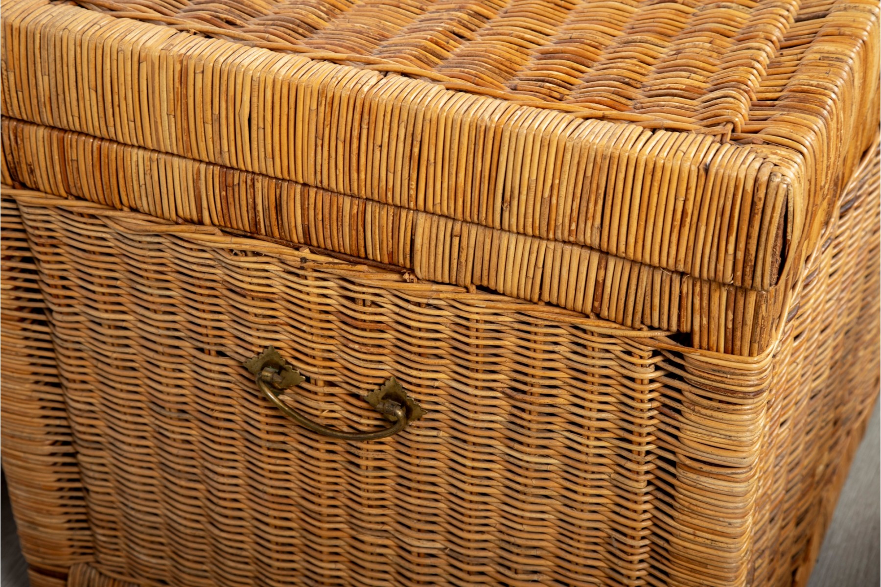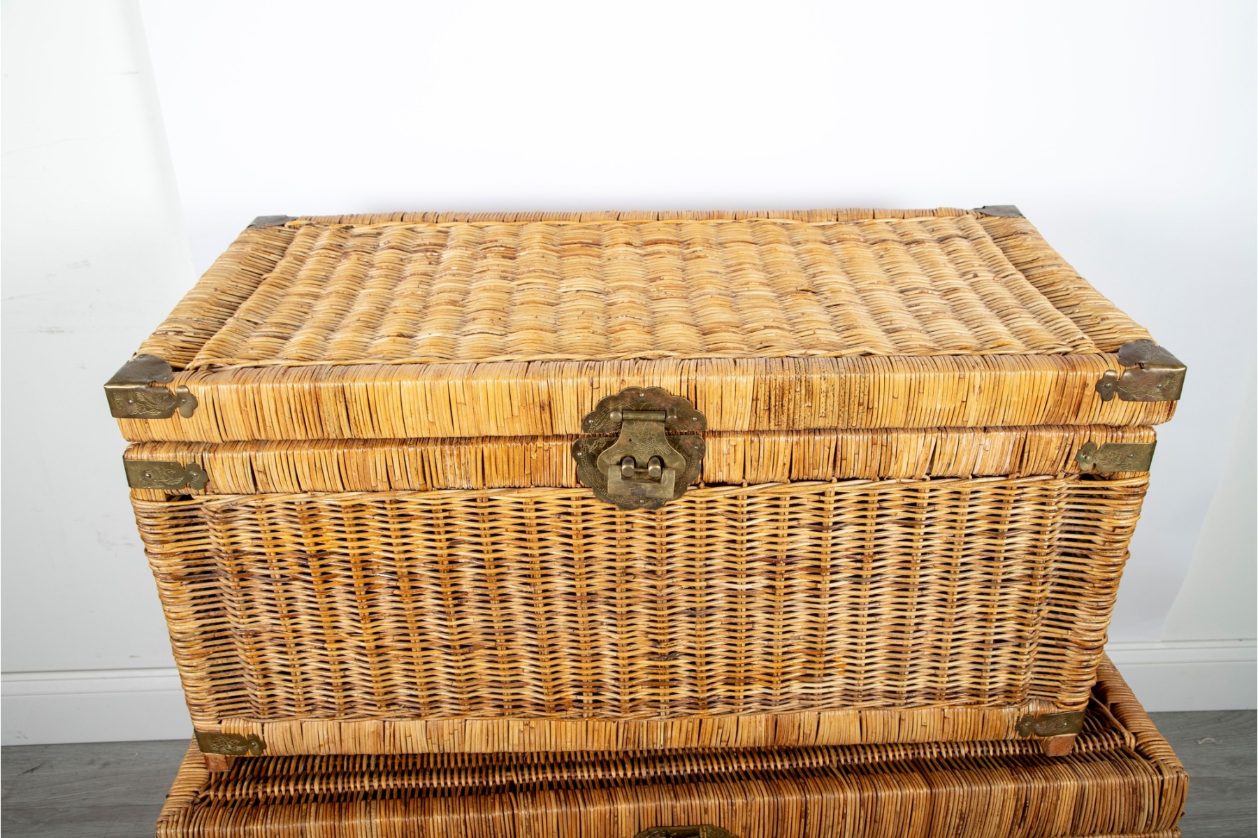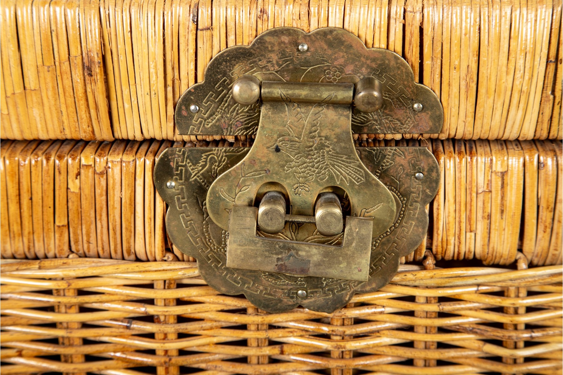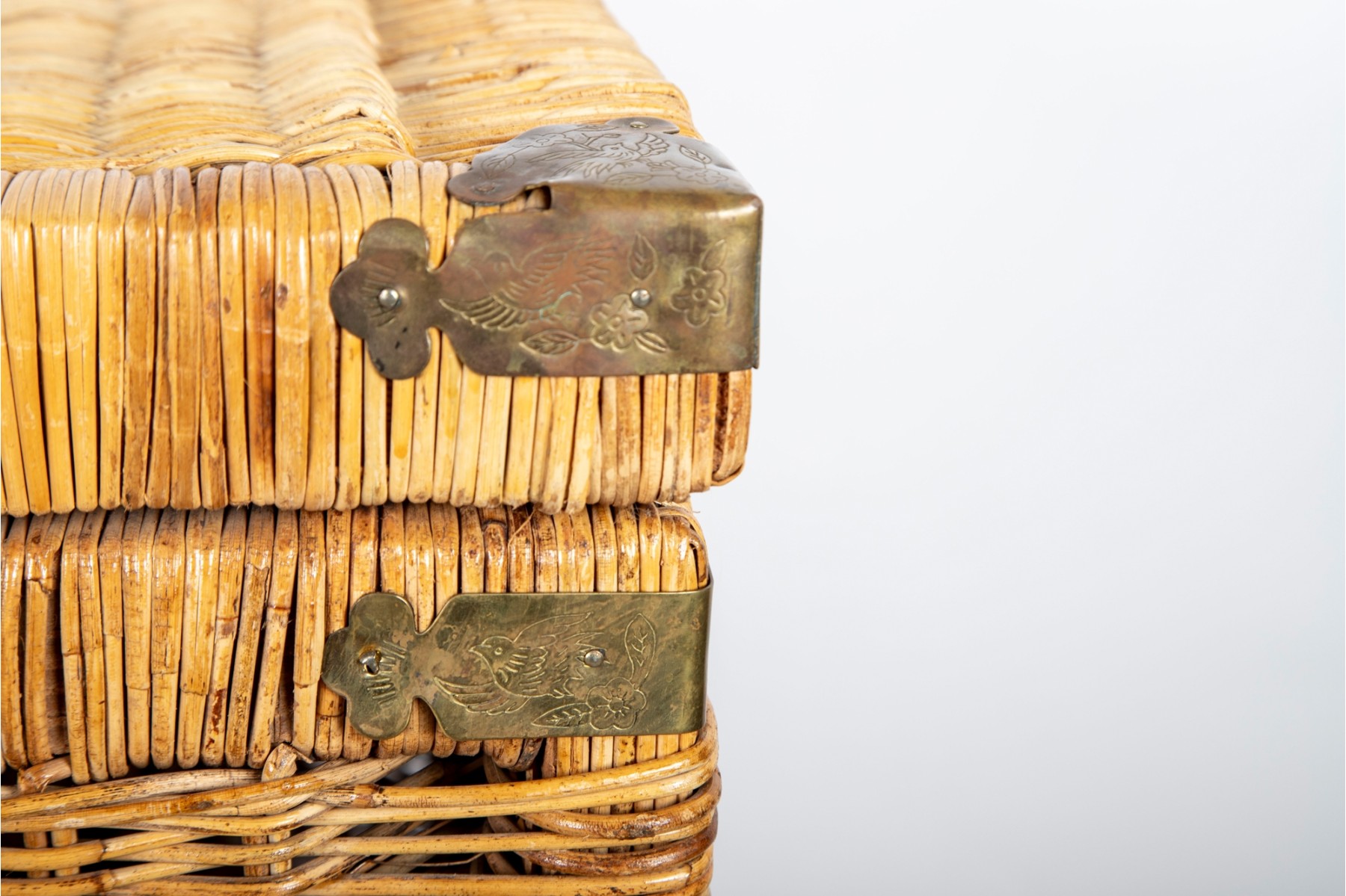 A pair of vintage 1970's rattan and brass chinoiserie trunks, featuring woven rattan panels accented by brass hardware and decorative corner brackets. These trunks embody a fusion of rustic charm and Asian-inspired elegance, perfect for storage or as statement decor pieces.