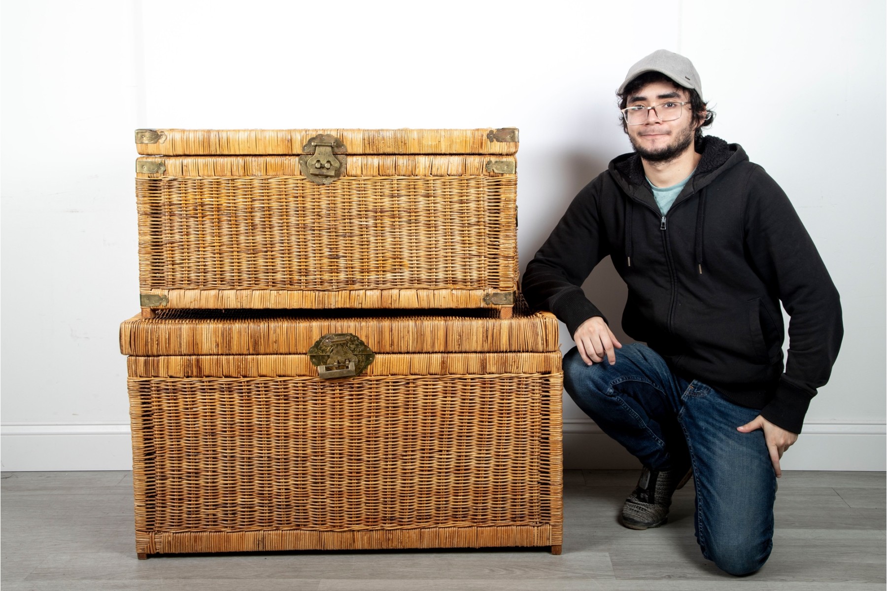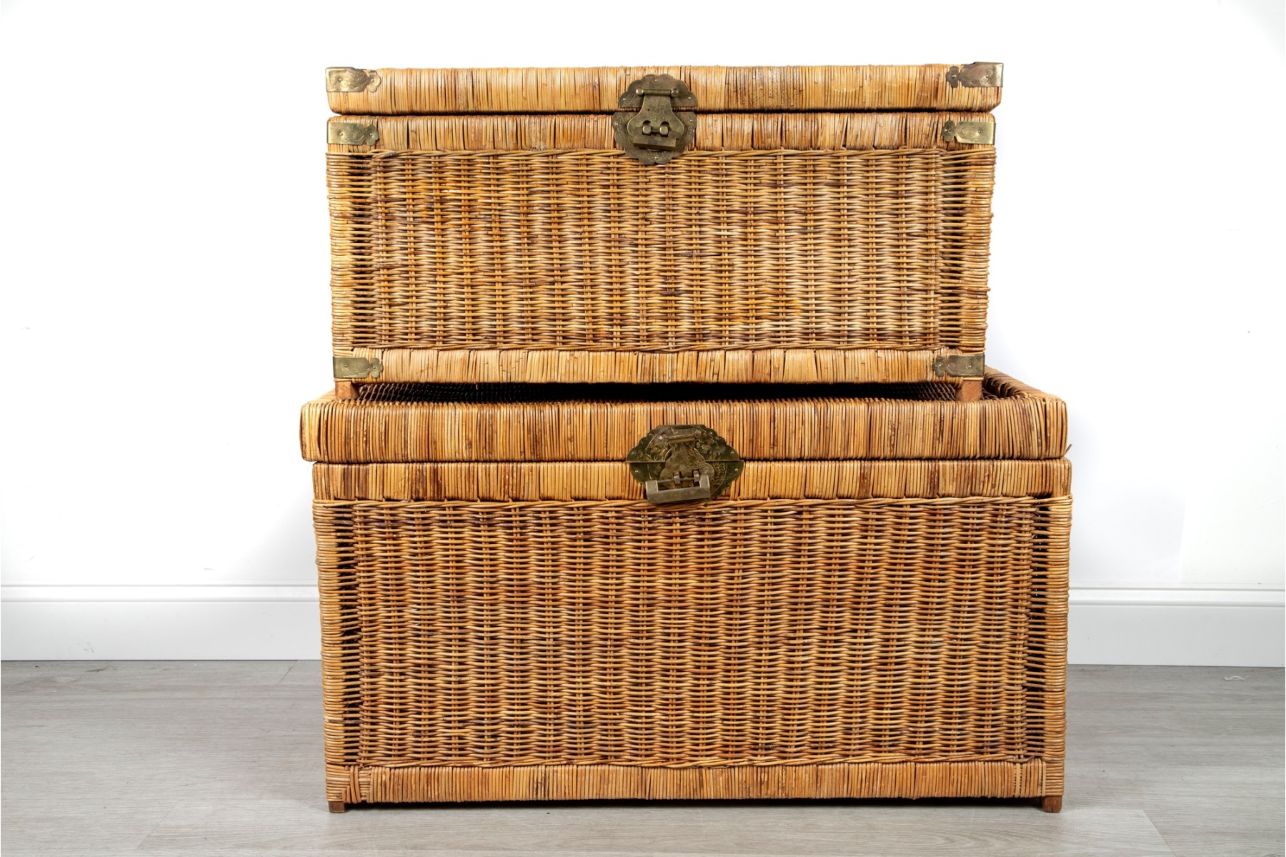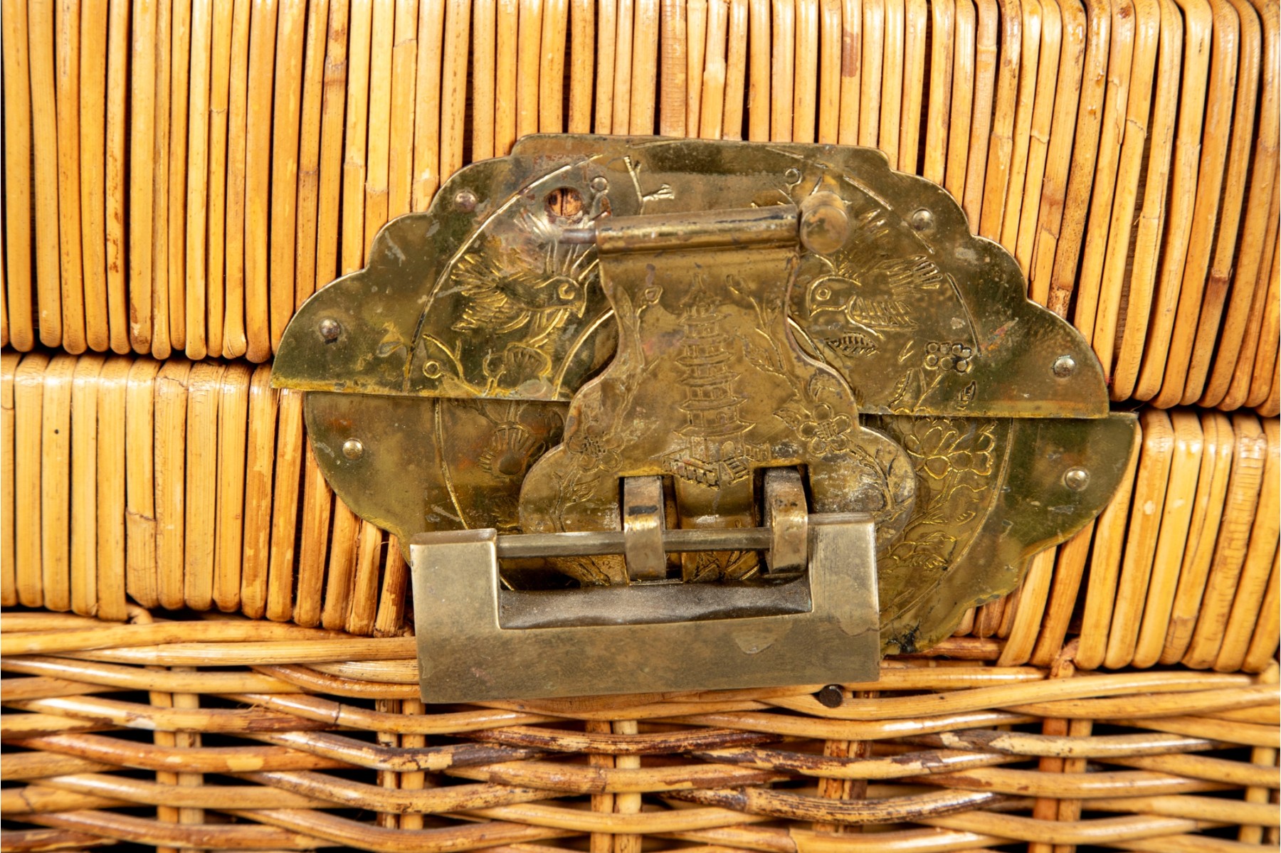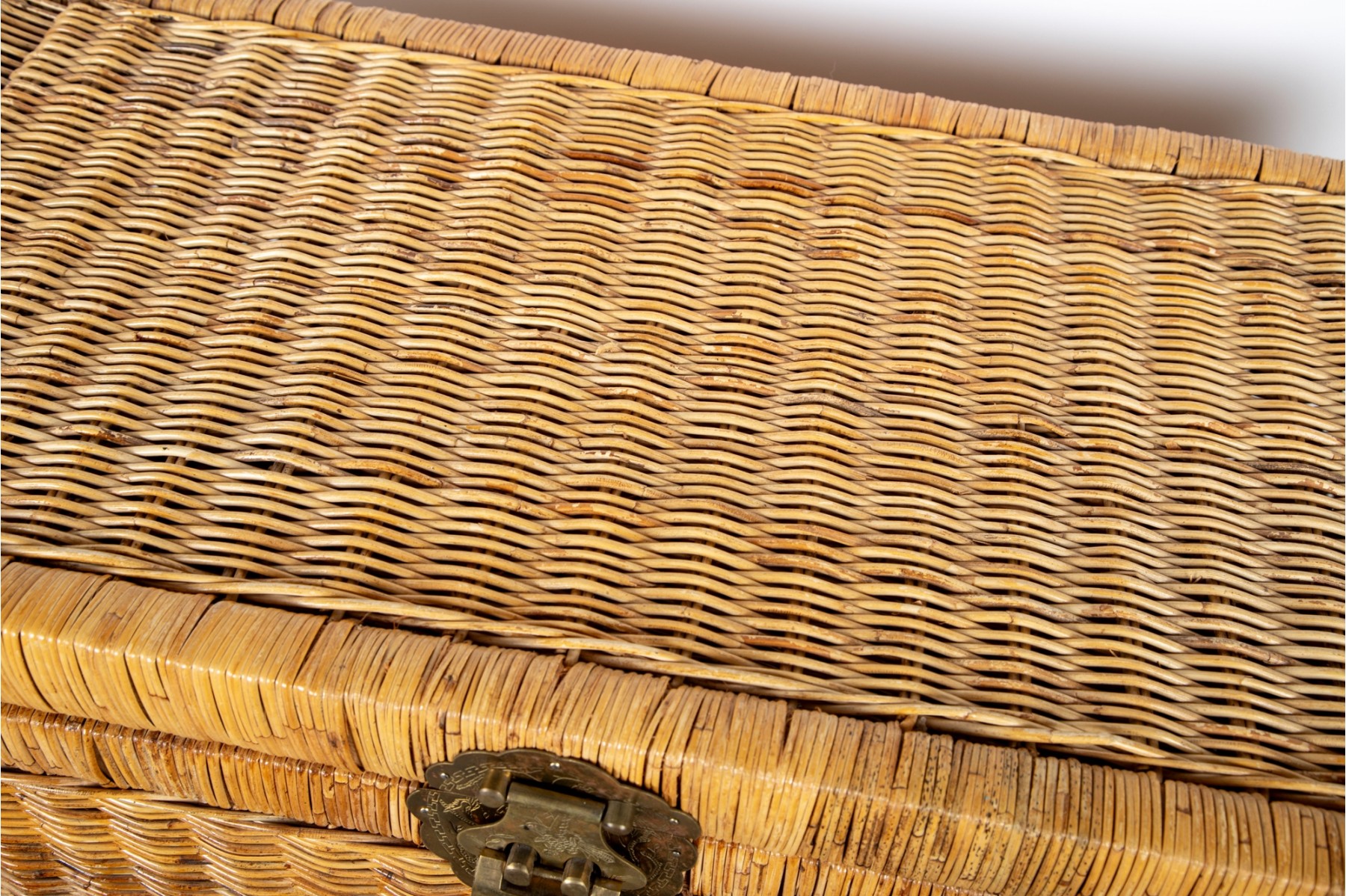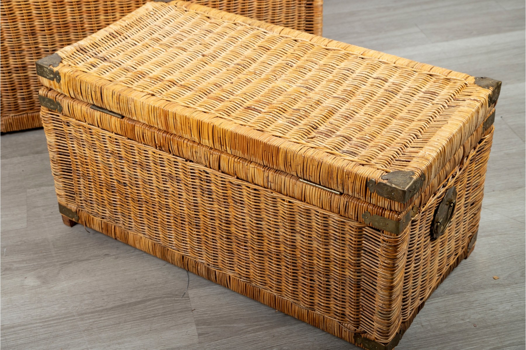 A pair of vintage 1970's rattan and brass chinoiserie trunks, featuring woven rattan panels accented by brass hardware and decorative corner brackets. These trunks embody a fusion of rustic charm and Asian-inspired elegance, perfect for storage or as statement decor pieces.