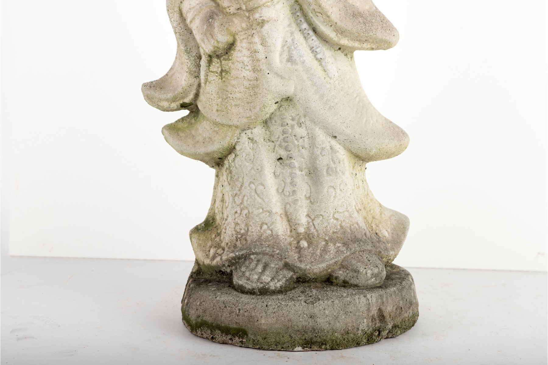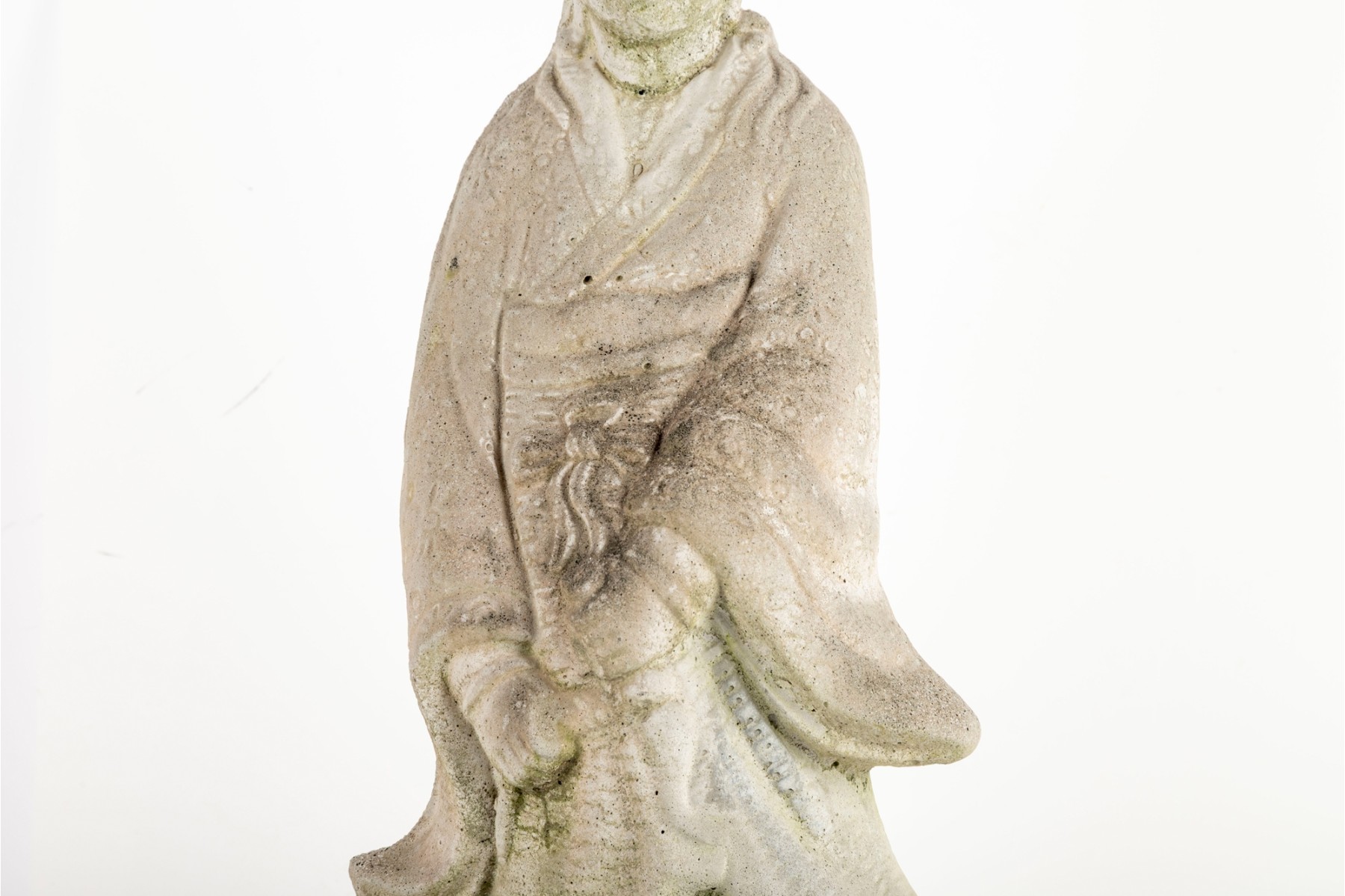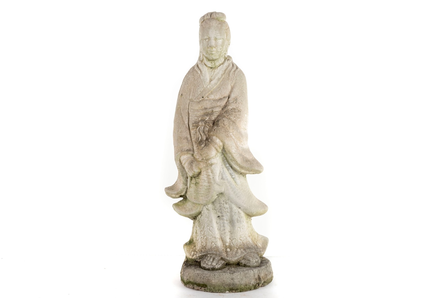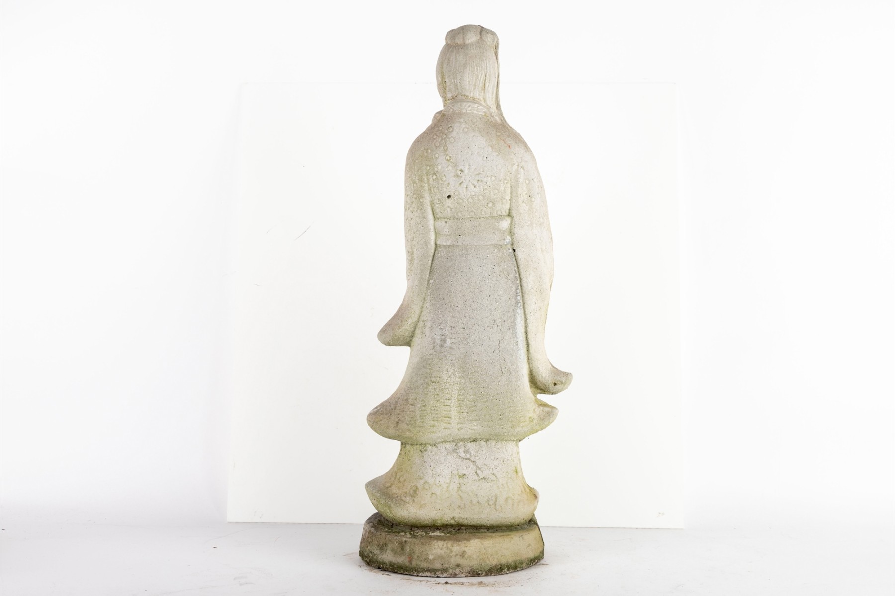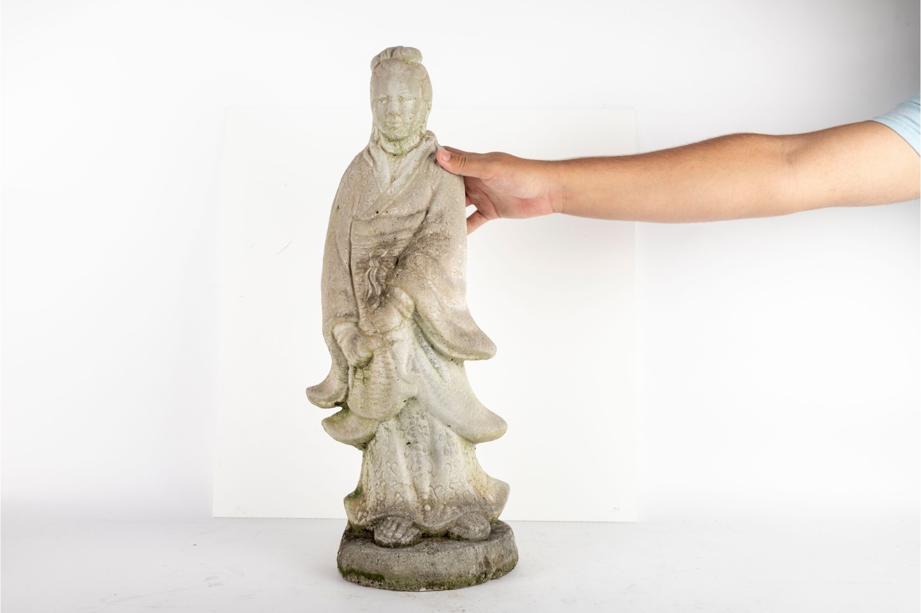 Graceful vintage cast stone statue depicting a robed woman in traditional Asian attire, ideal for indoor or garden display.