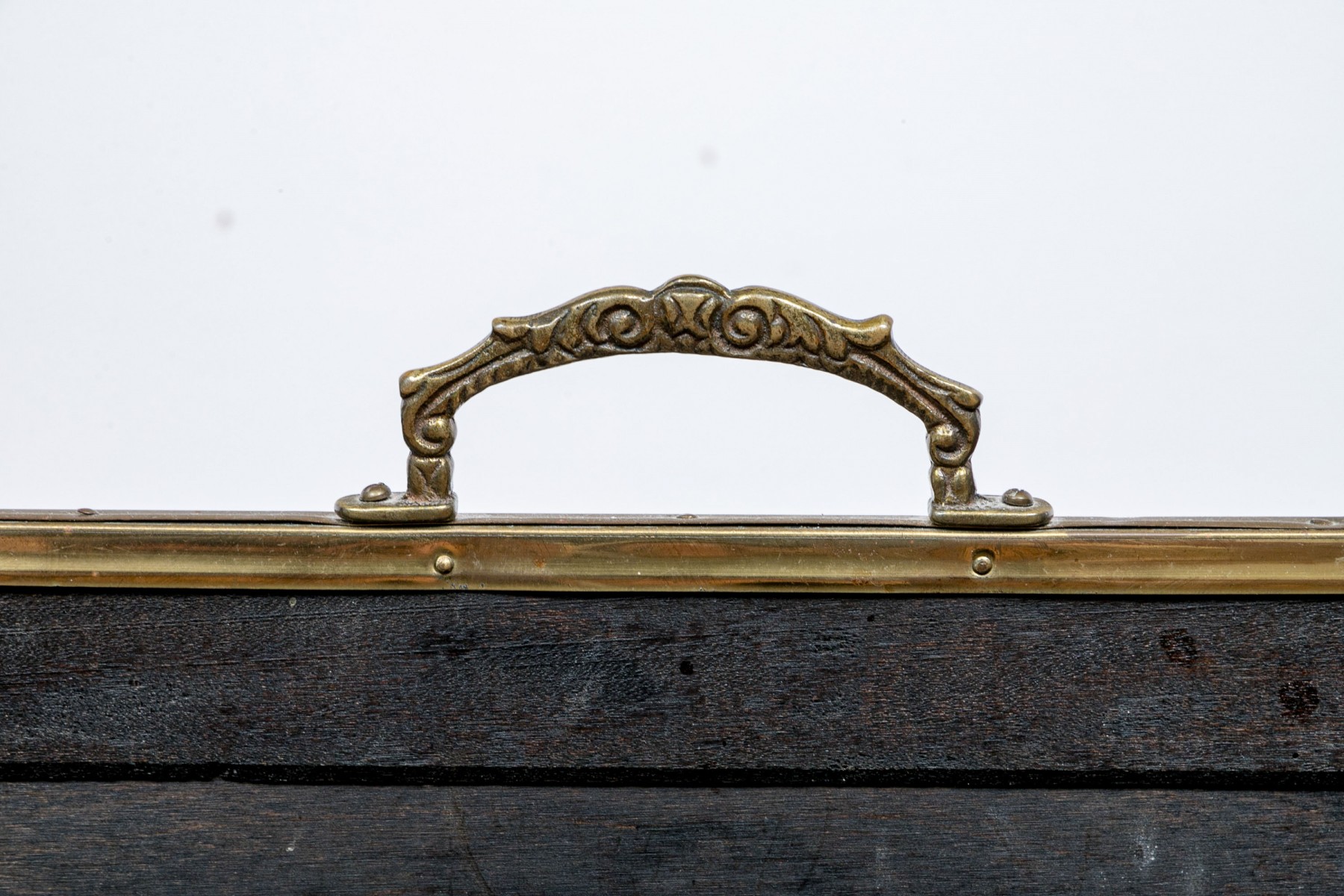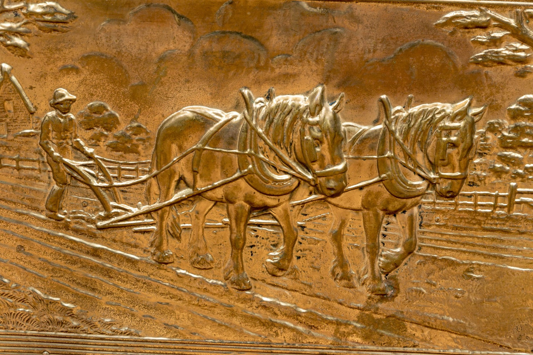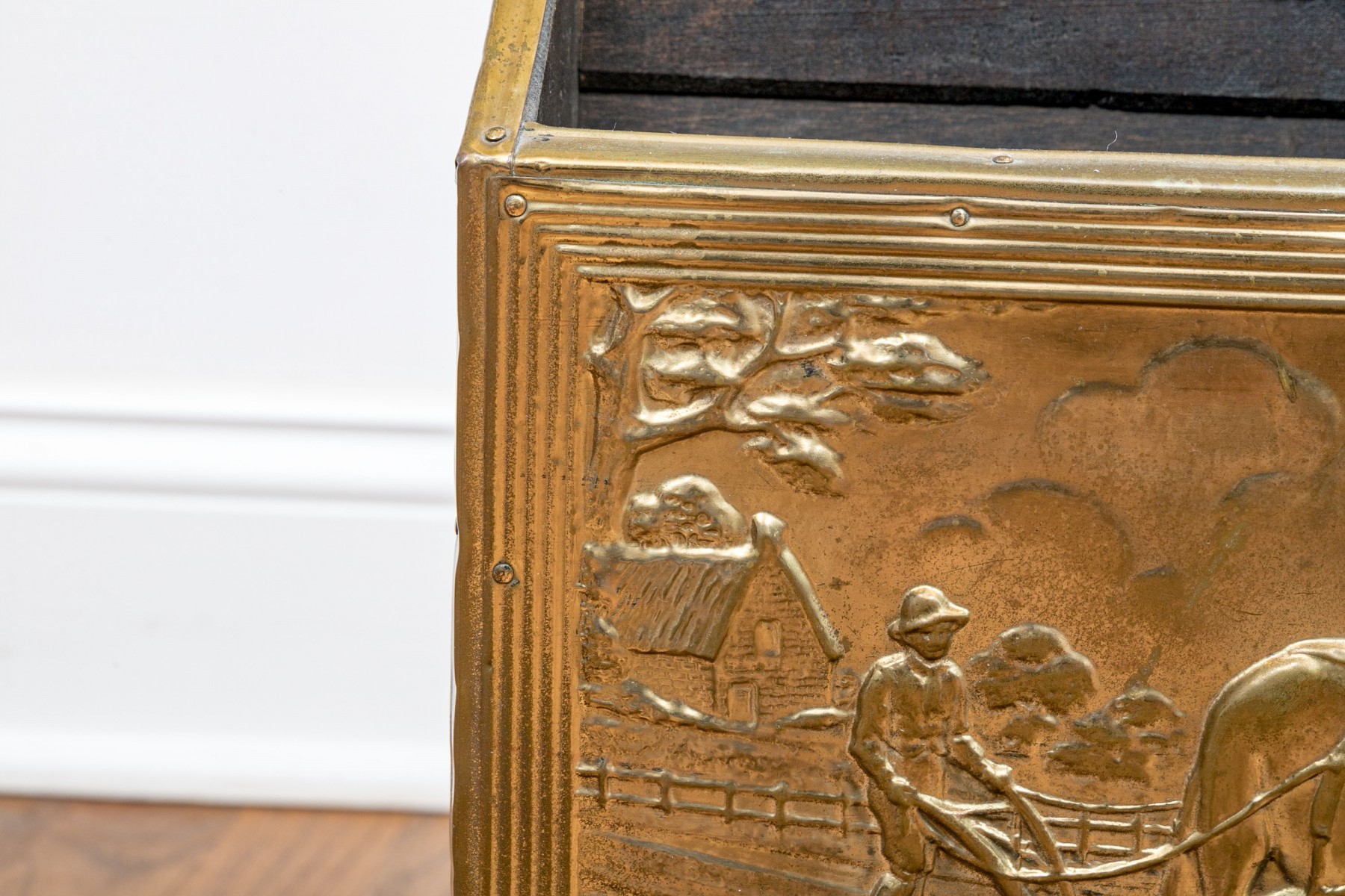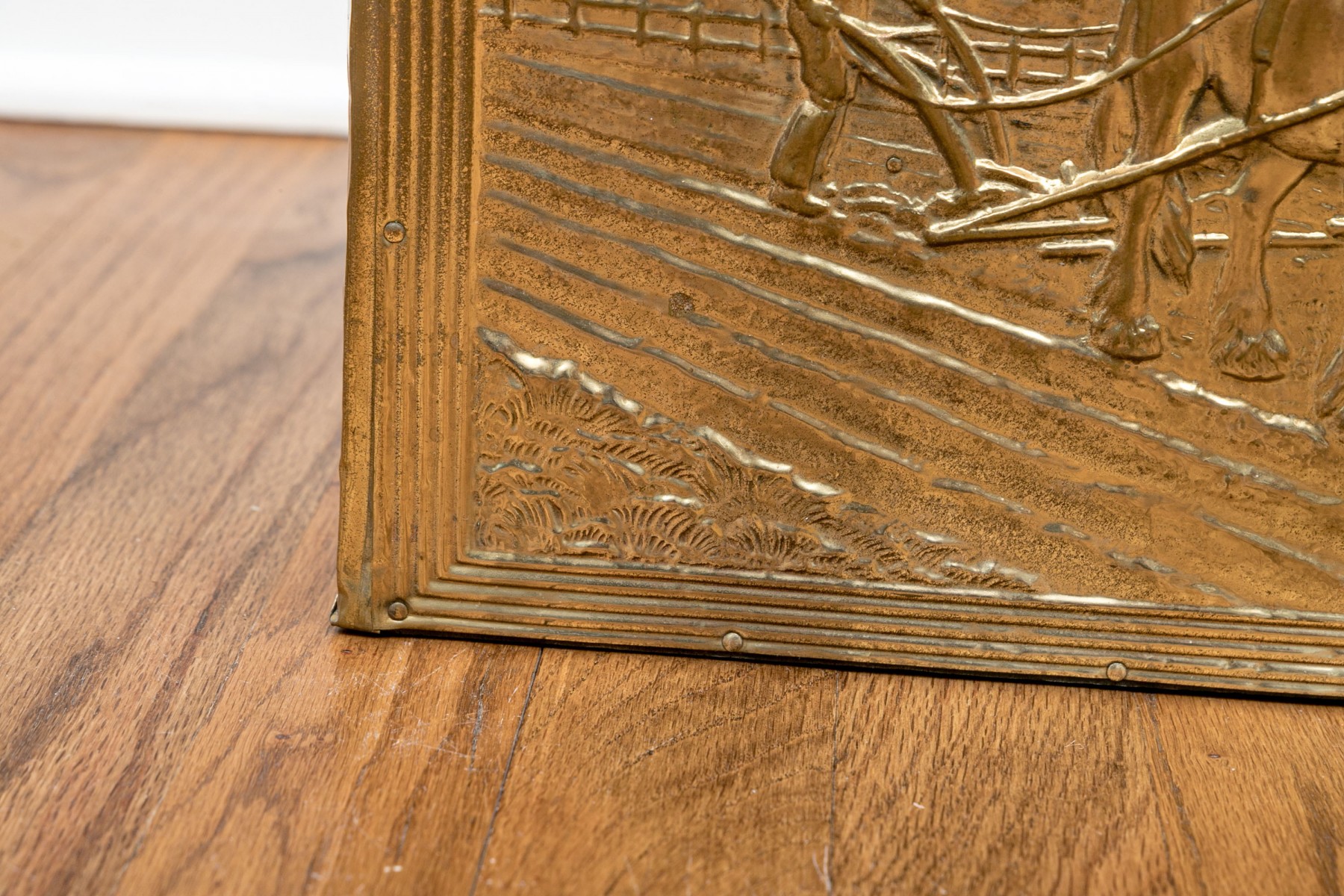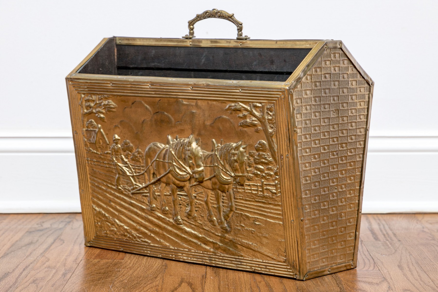 Vintage brass and wood magazine rack with embossed farmer & work horses, central handle.