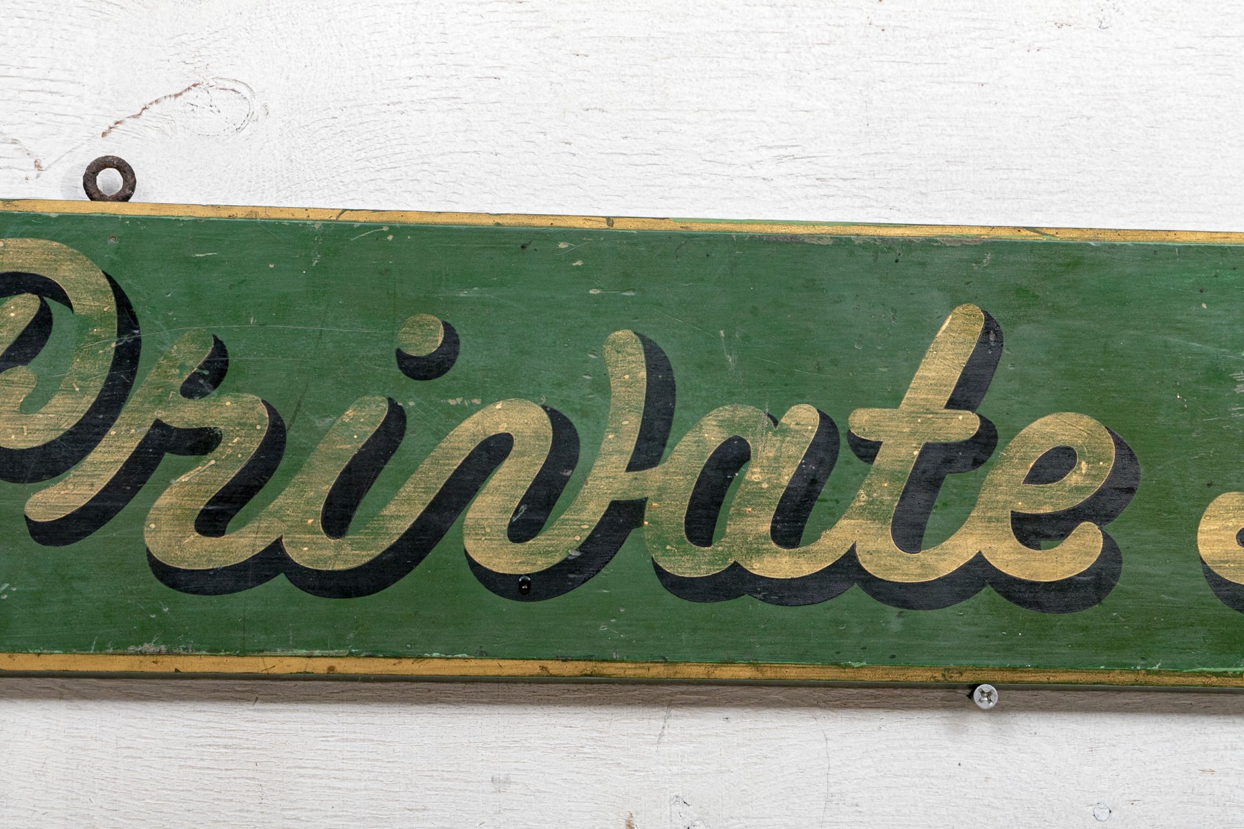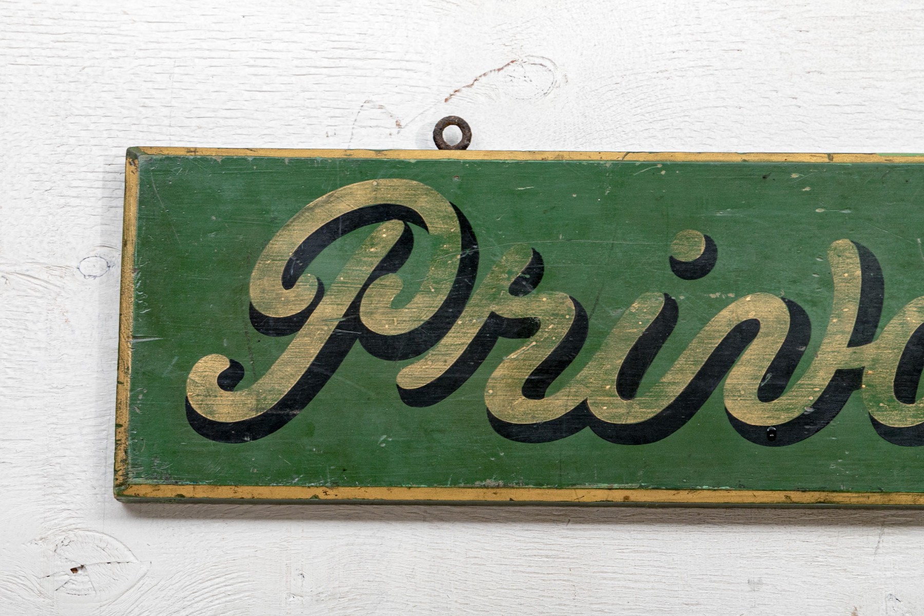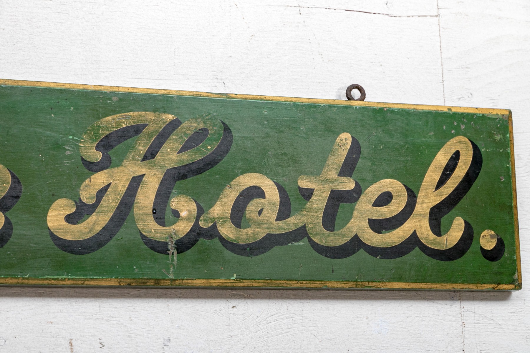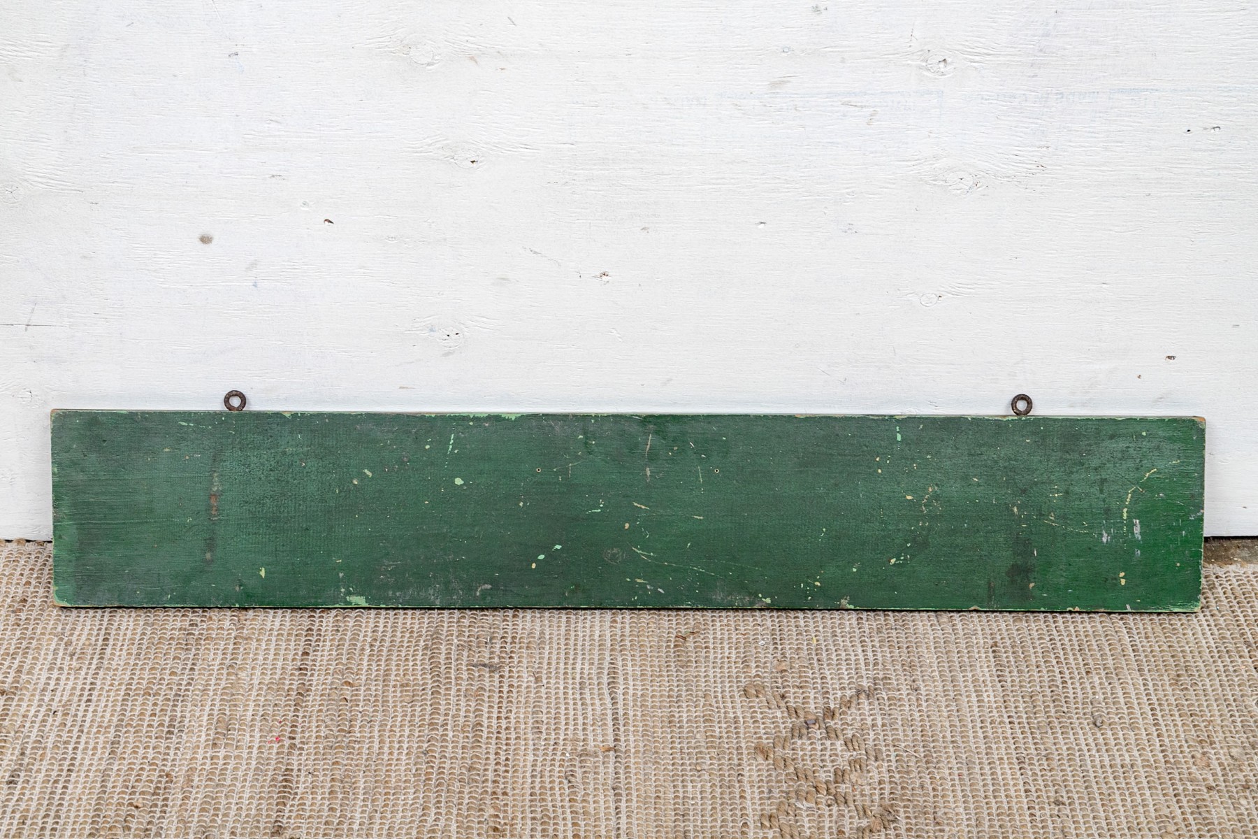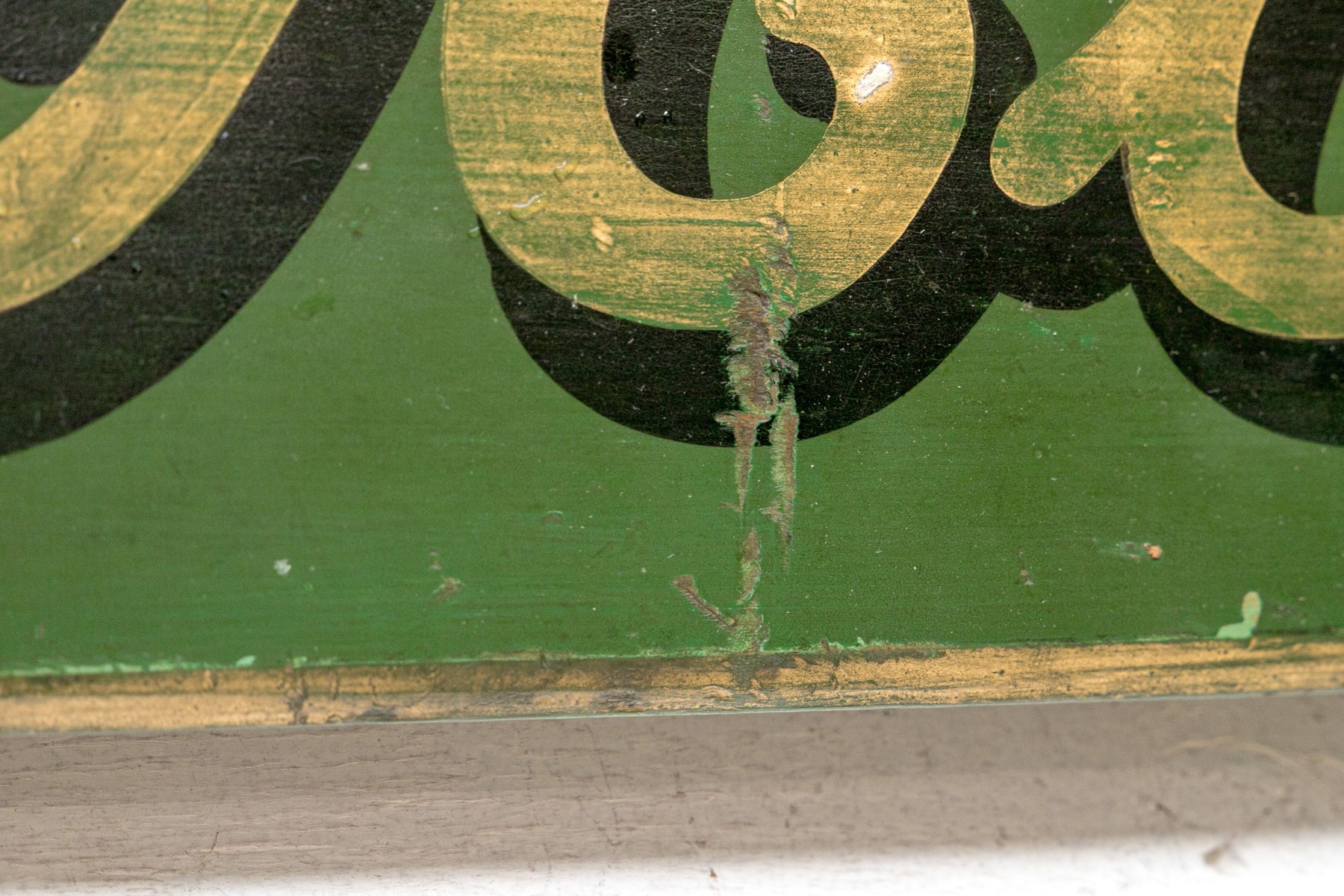 The long narrow sign in green paint with gilt and black lettering and gilt edges. Two hooks on the top for hanging,