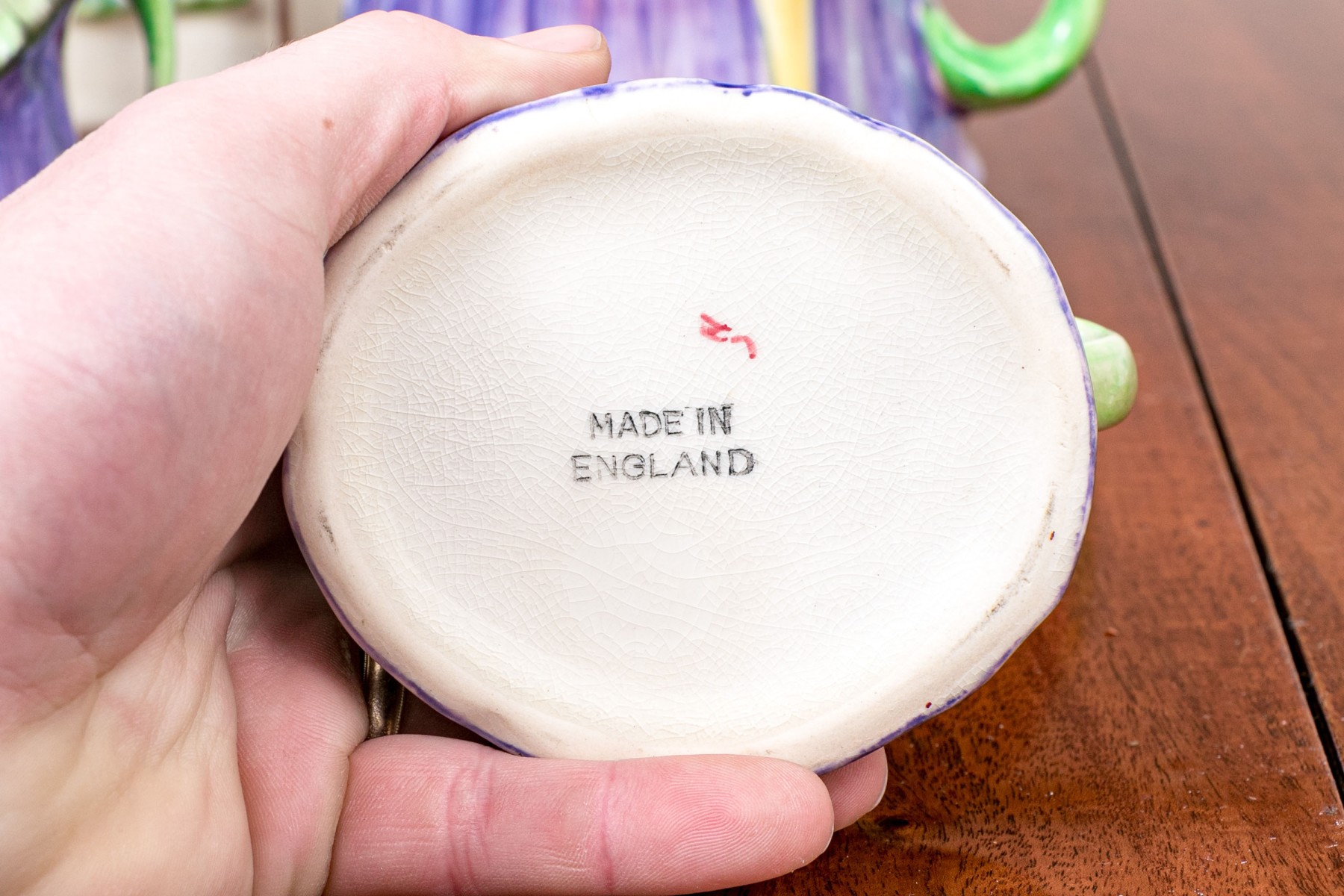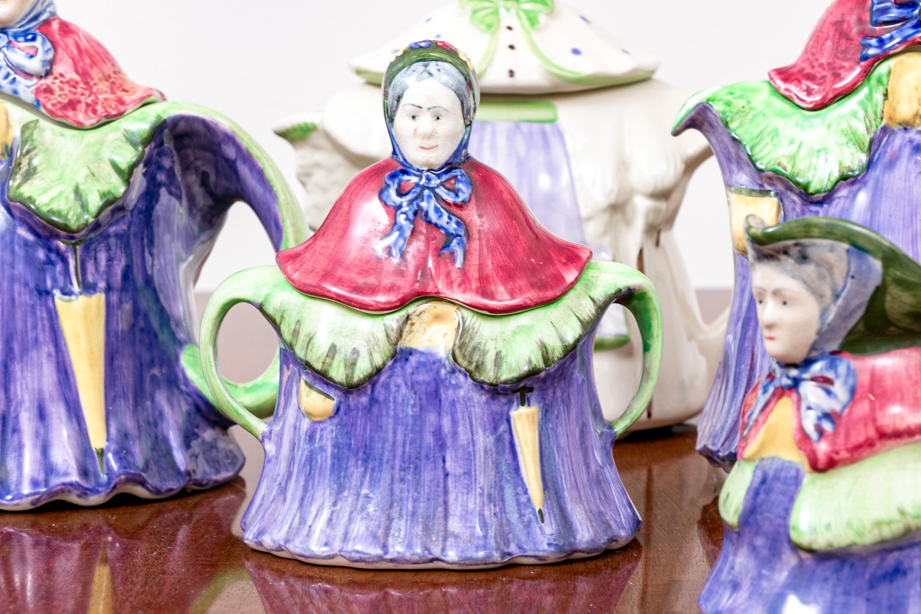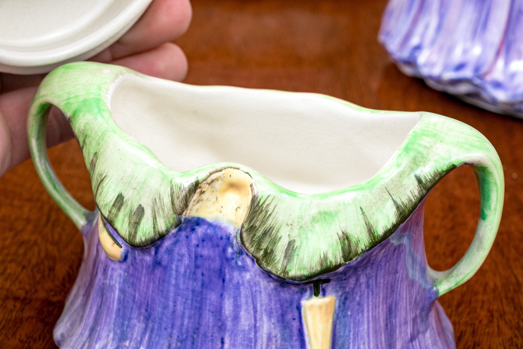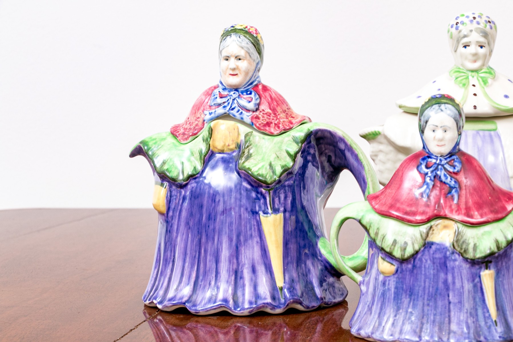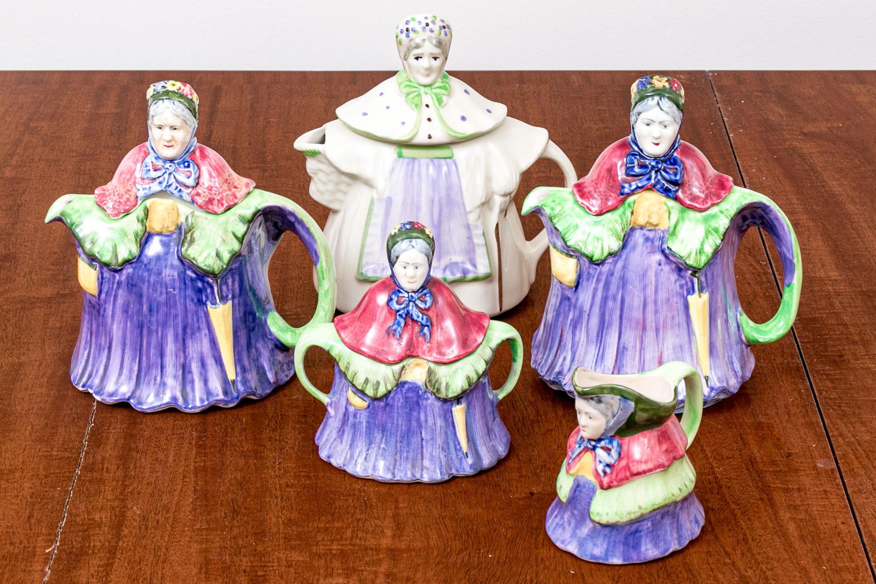 Includes two lidded teapots, a lidded coffee pot, a lidded two handled sugar and a creamer. 4 of the pieces are the same pattern with one being unique to the others. All made by "HJ Wood." The largest purple teapot is a musical teapot with crank to foot.