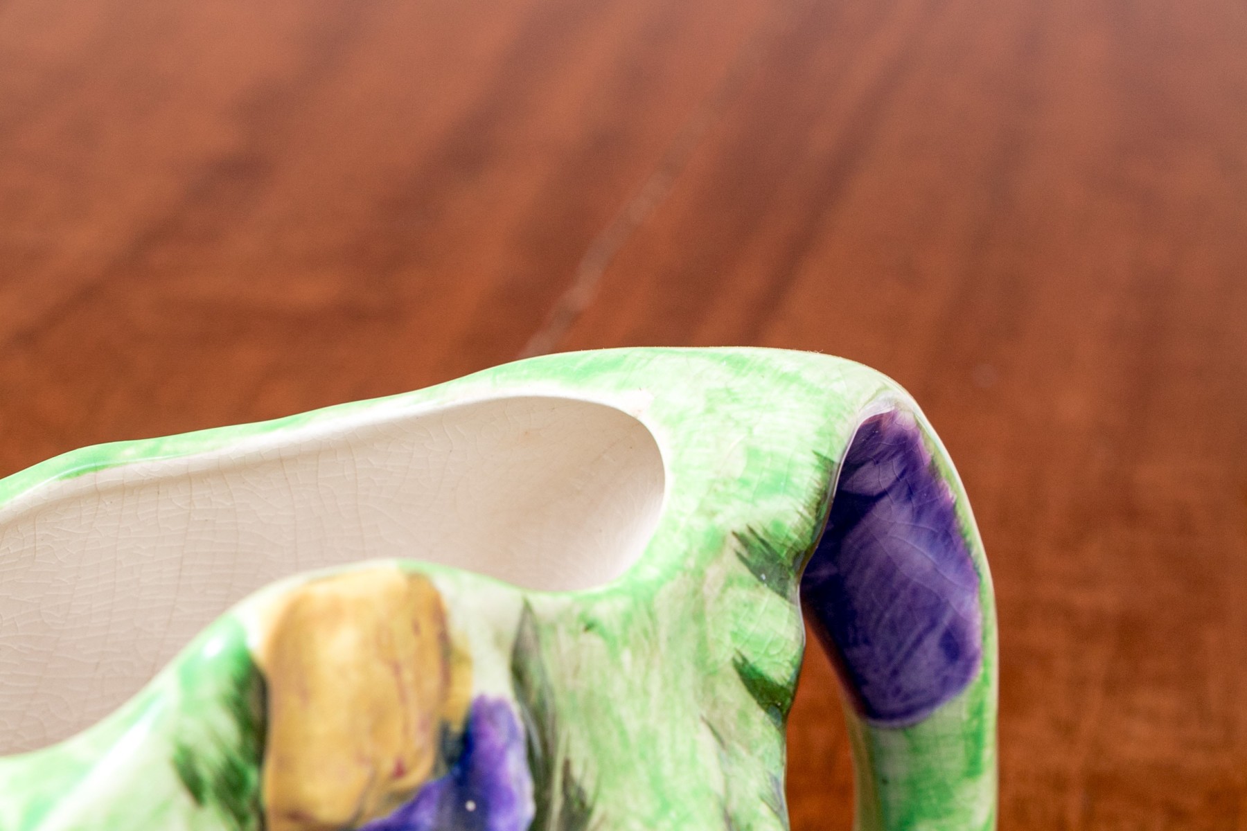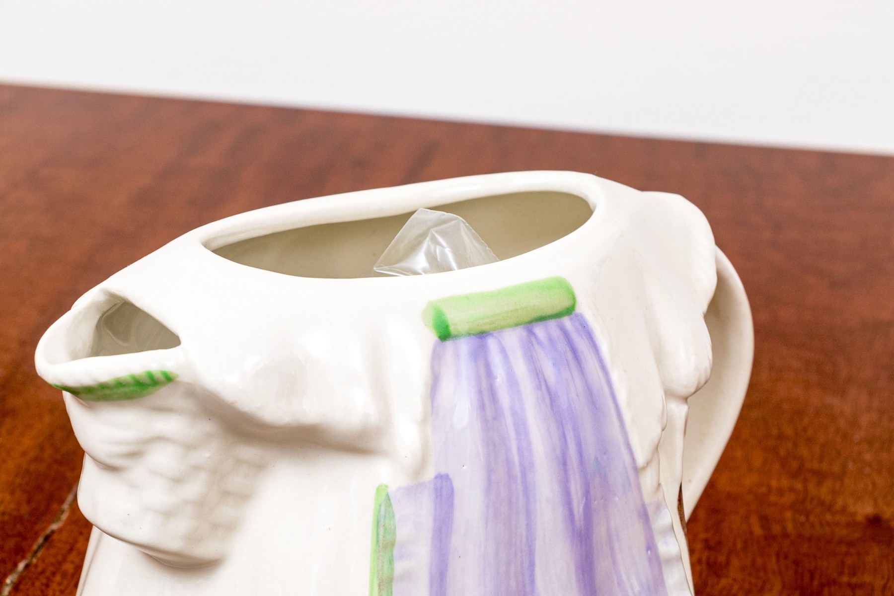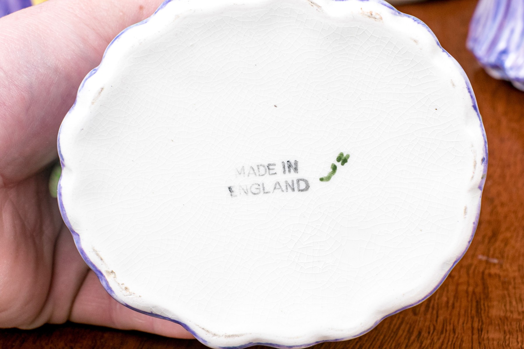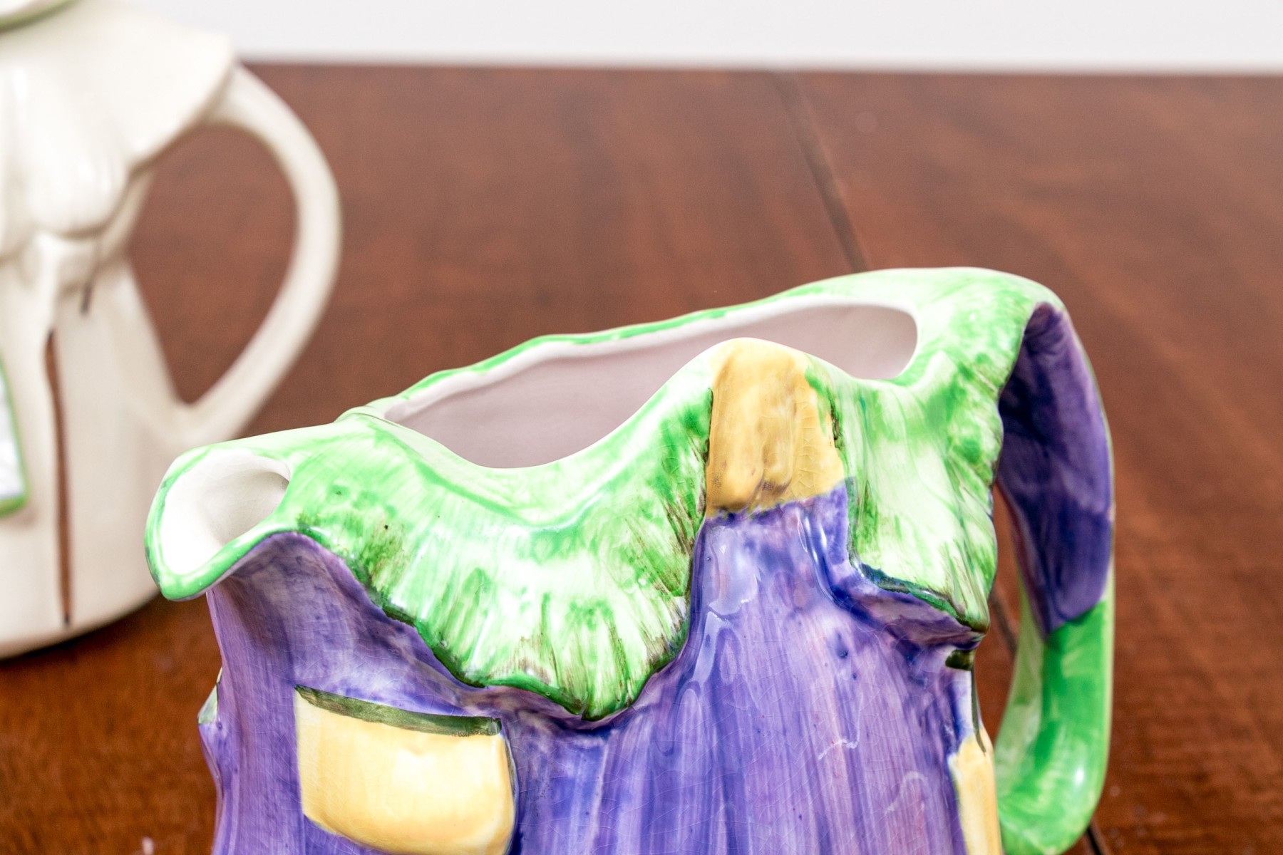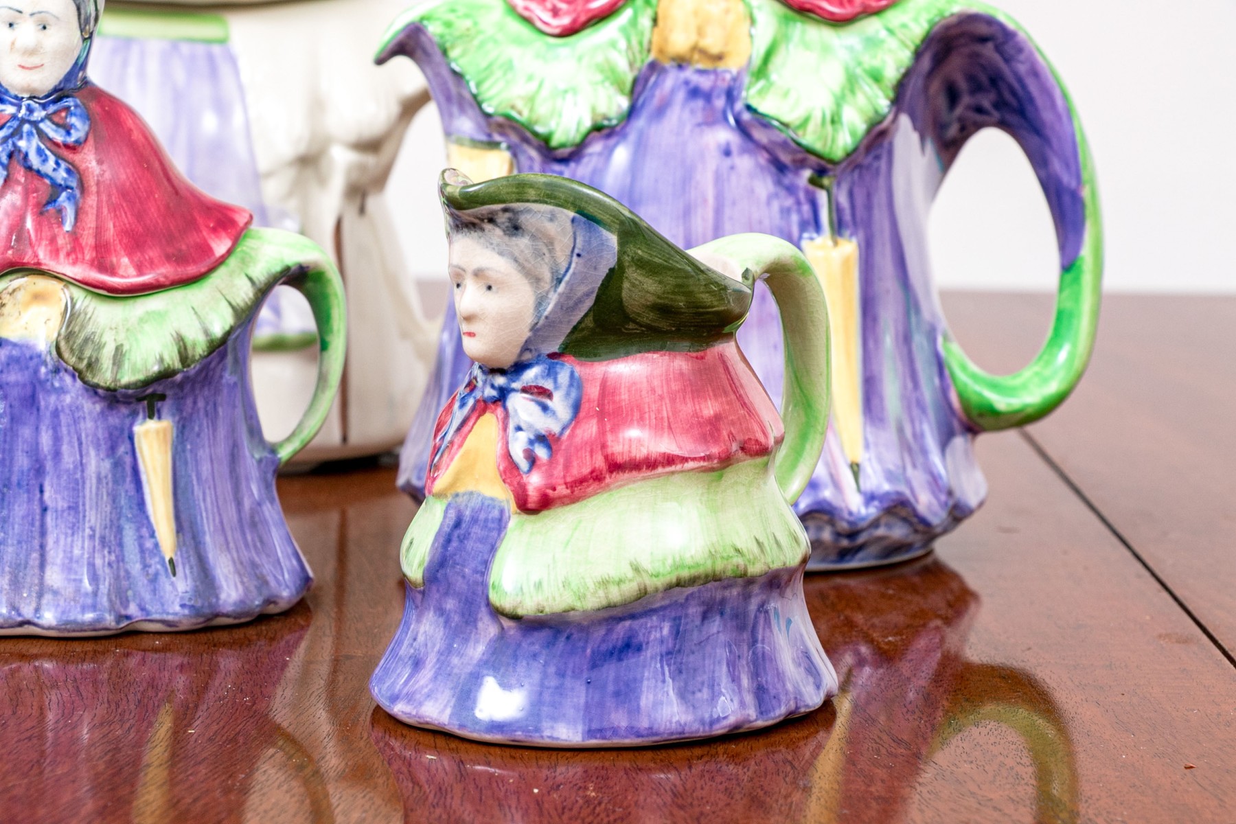 Includes two lidded teapots, a lidded coffee pot, a lidded two handled sugar and a creamer. 4 of the pieces are the same pattern with one being unique to the others. All made by "HJ Wood." The largest purple teapot is a musical teapot with crank to foot.