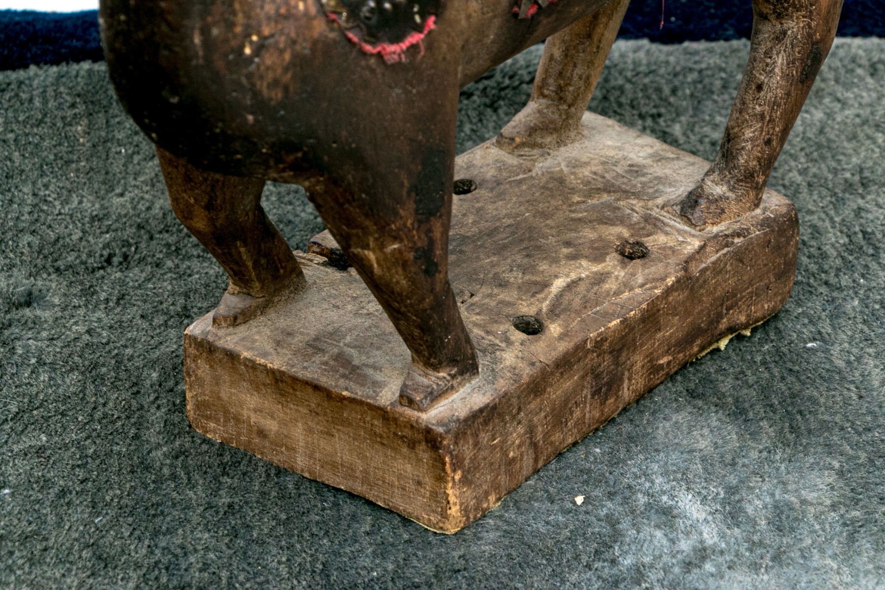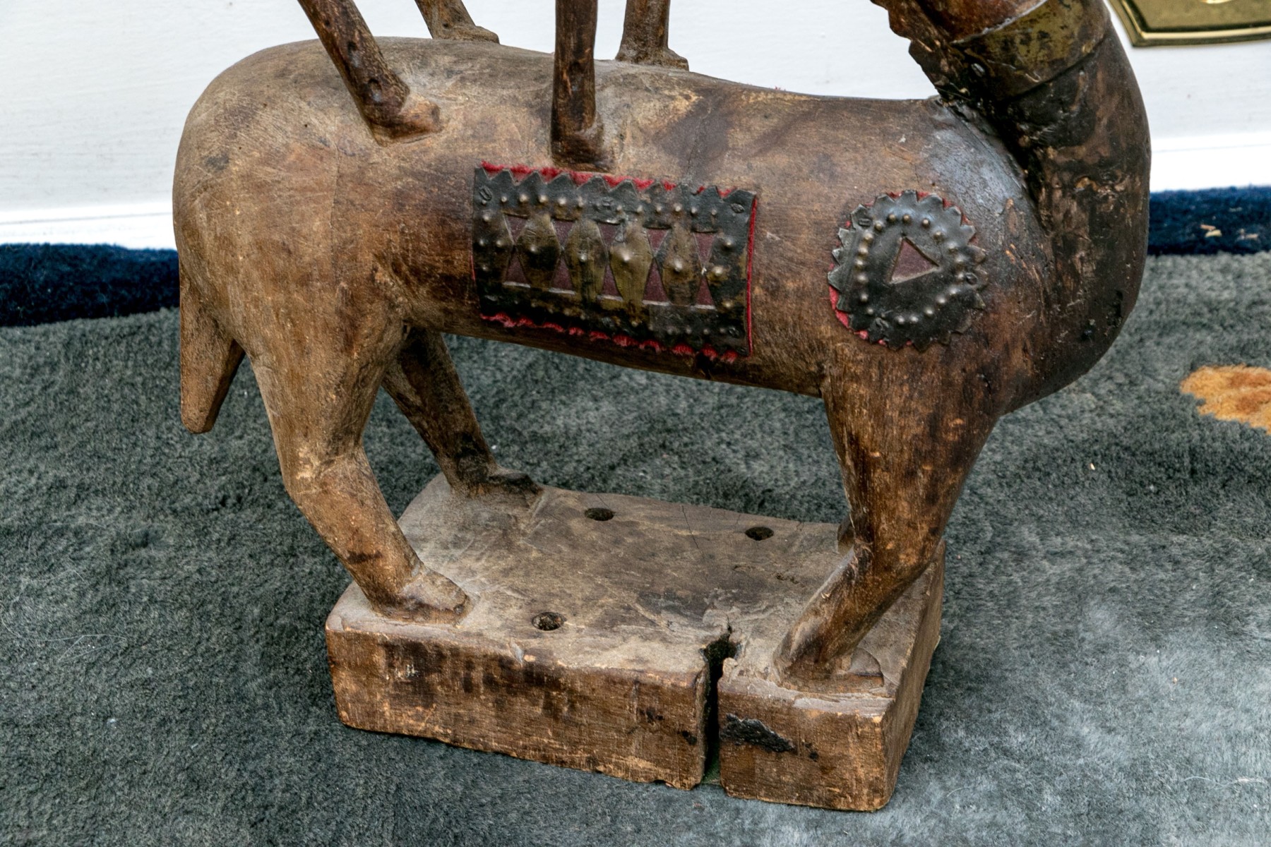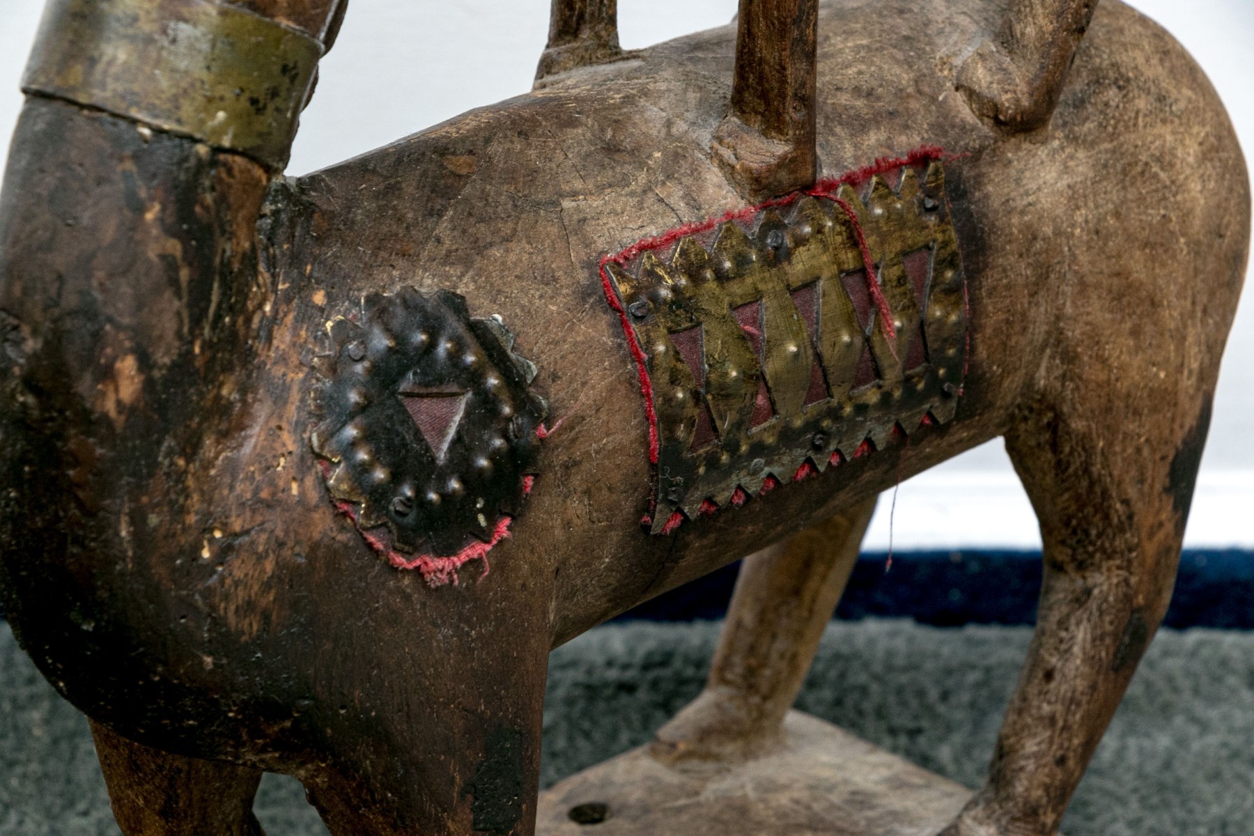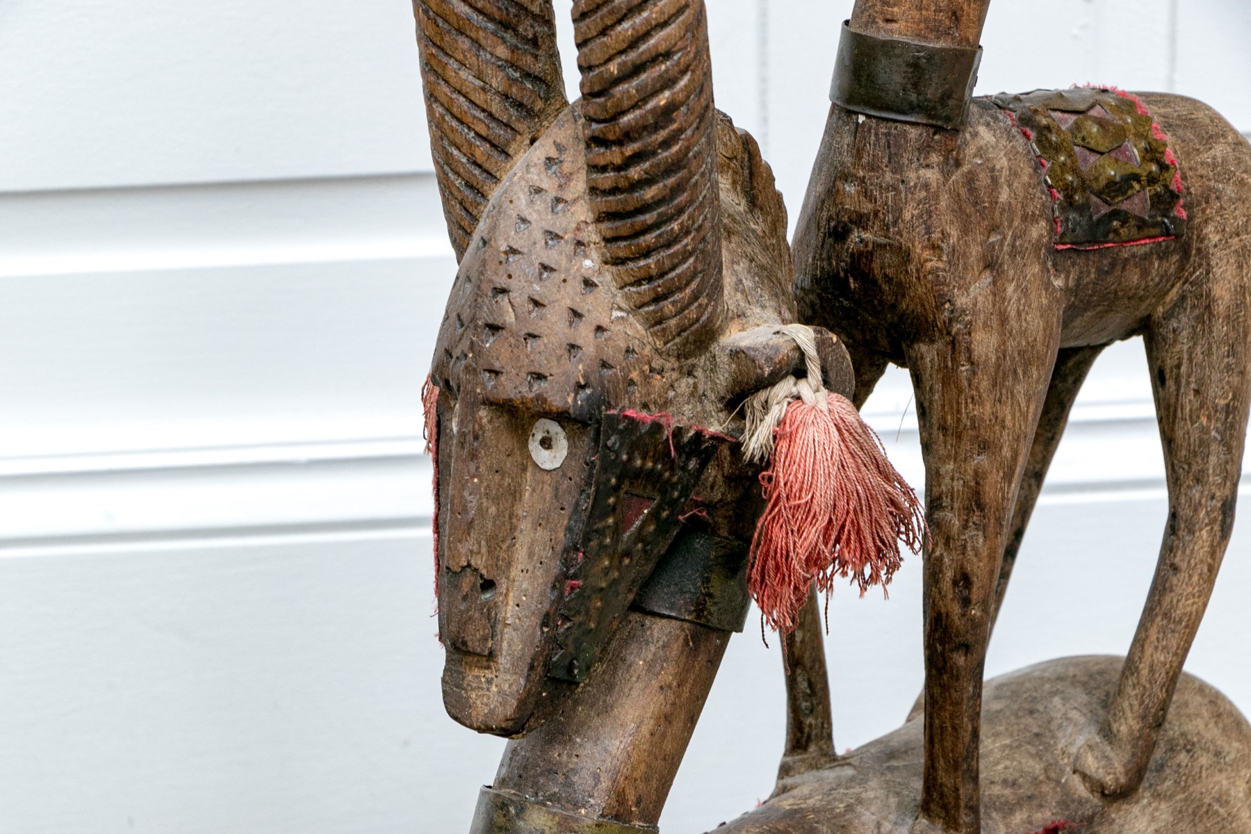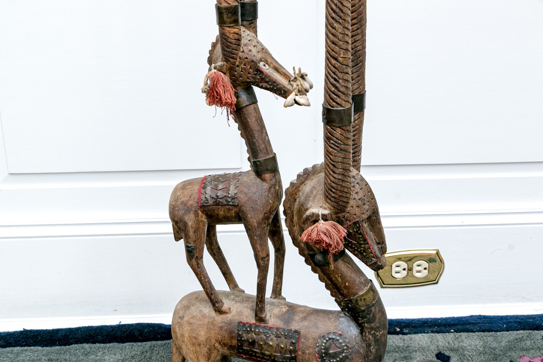 Well carved wooden sculptural headdress depicting two antelopes, with one standing atop the larger's back.