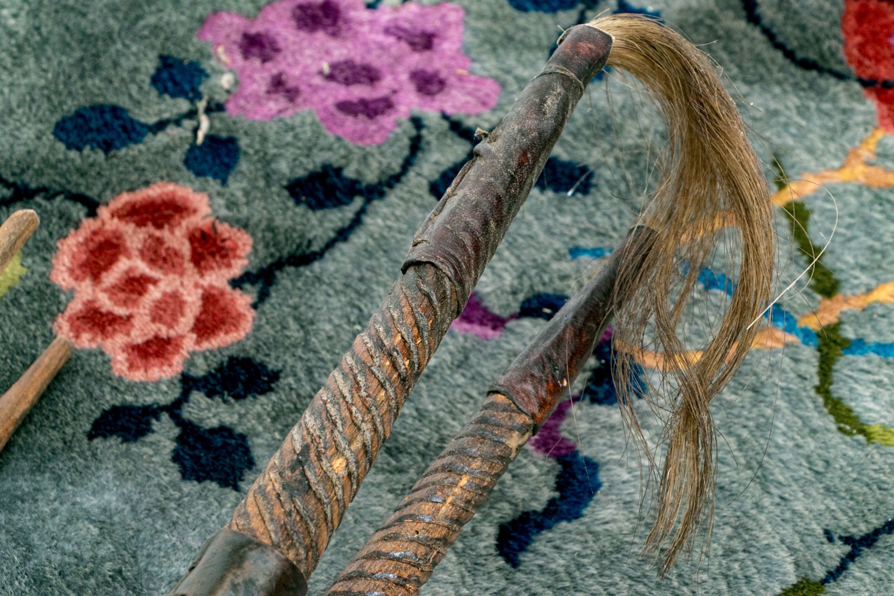 Intricatly carved with spiral fluted horns that rise up majestically.