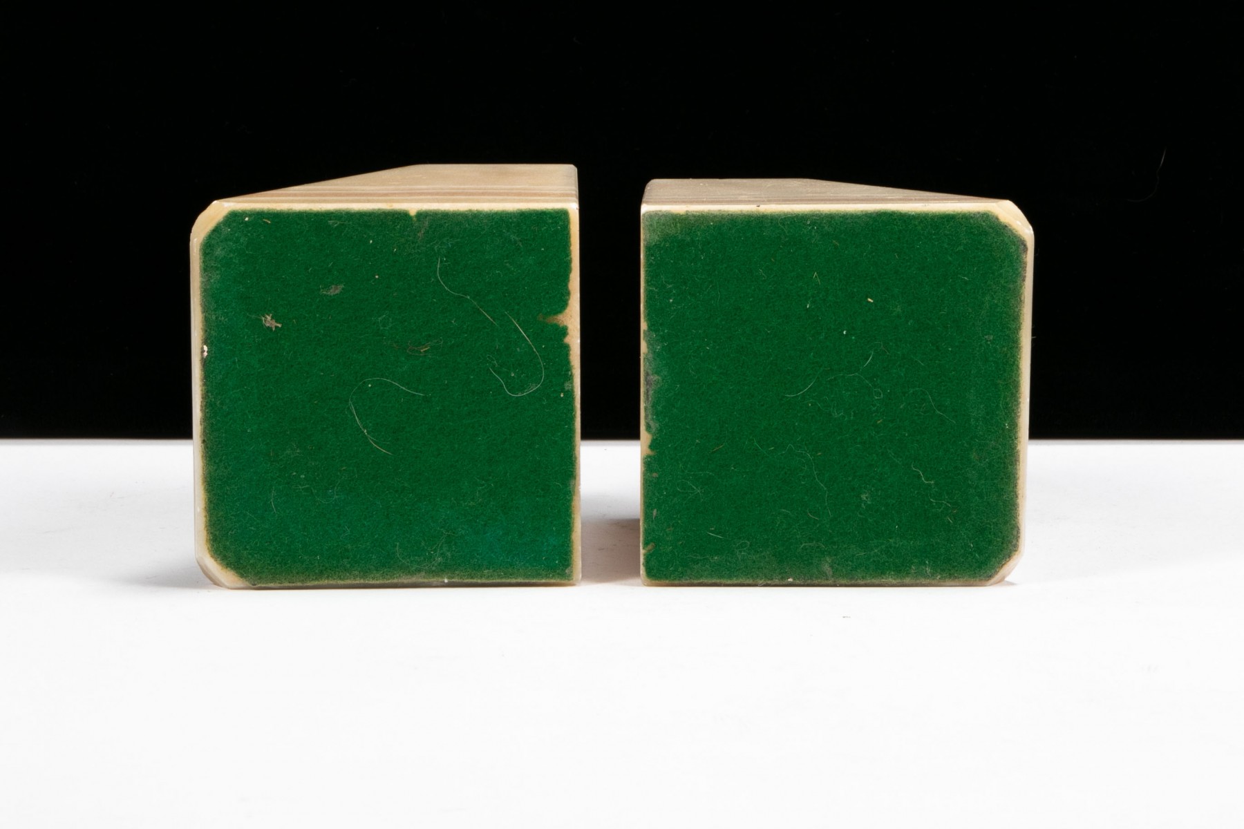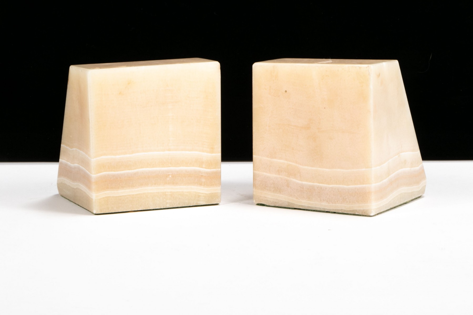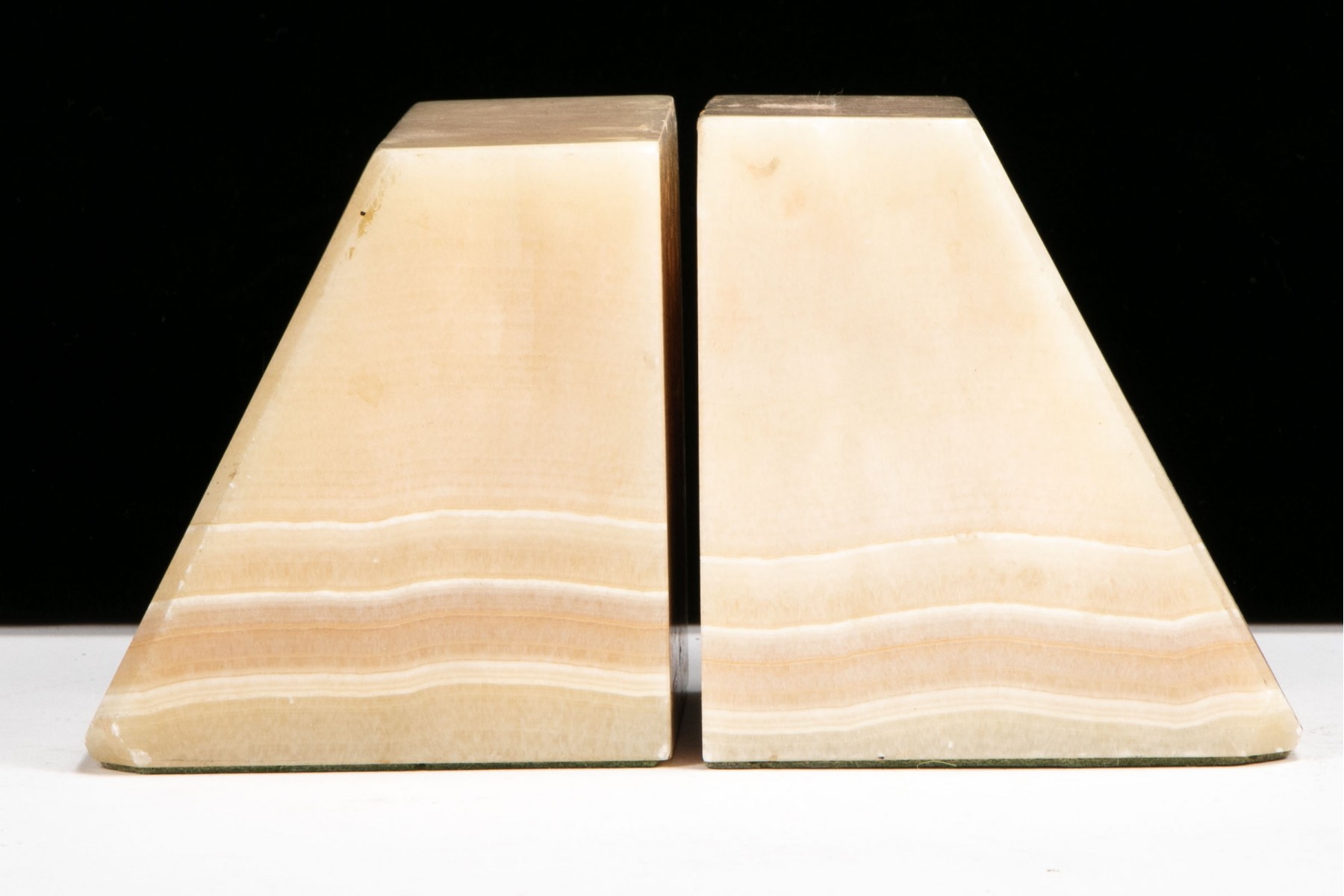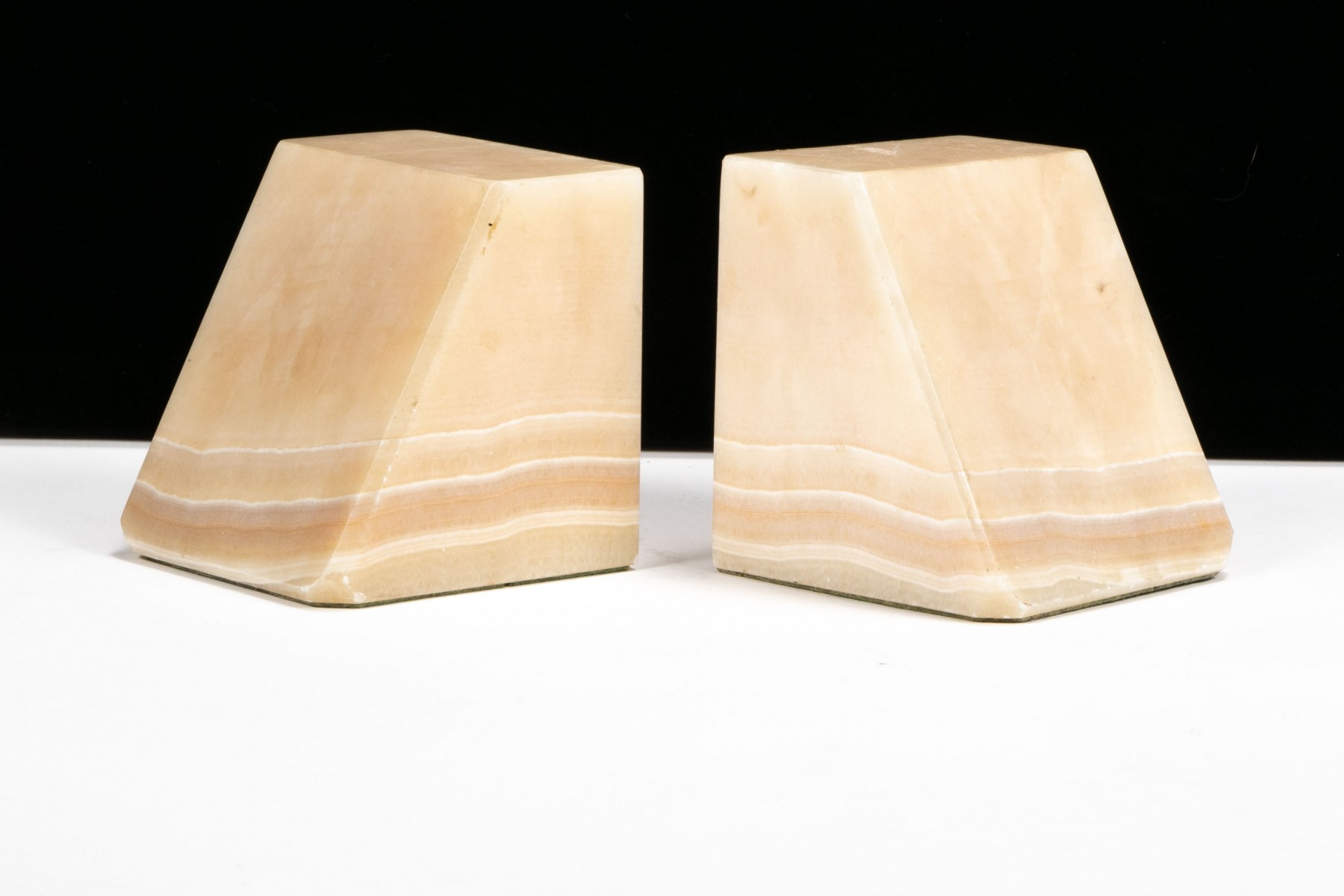 A pair of vintage alabaster bookends with flat tops leading to one steeply raked side and two straight sides, with lovely veining towards the bottom. Lined with green felt on bottoms.