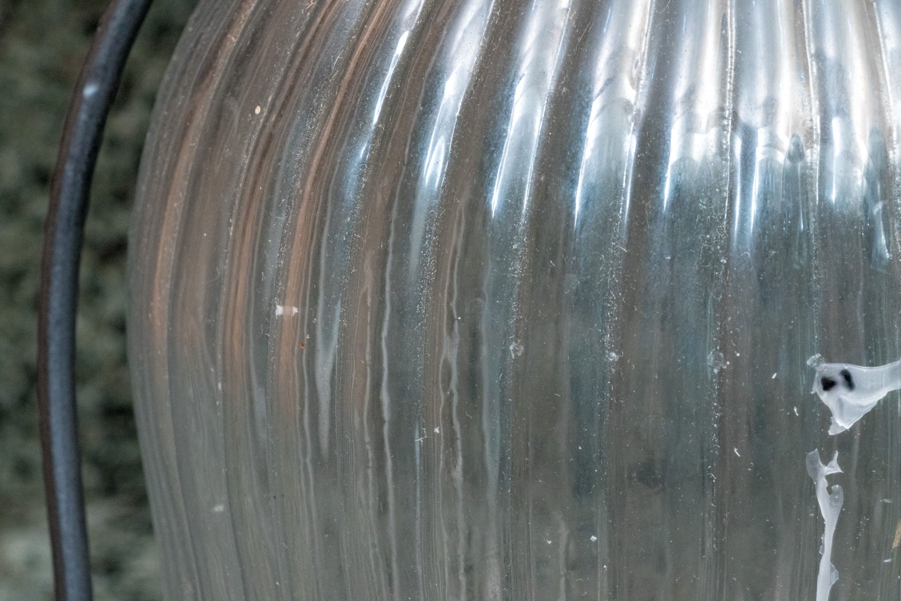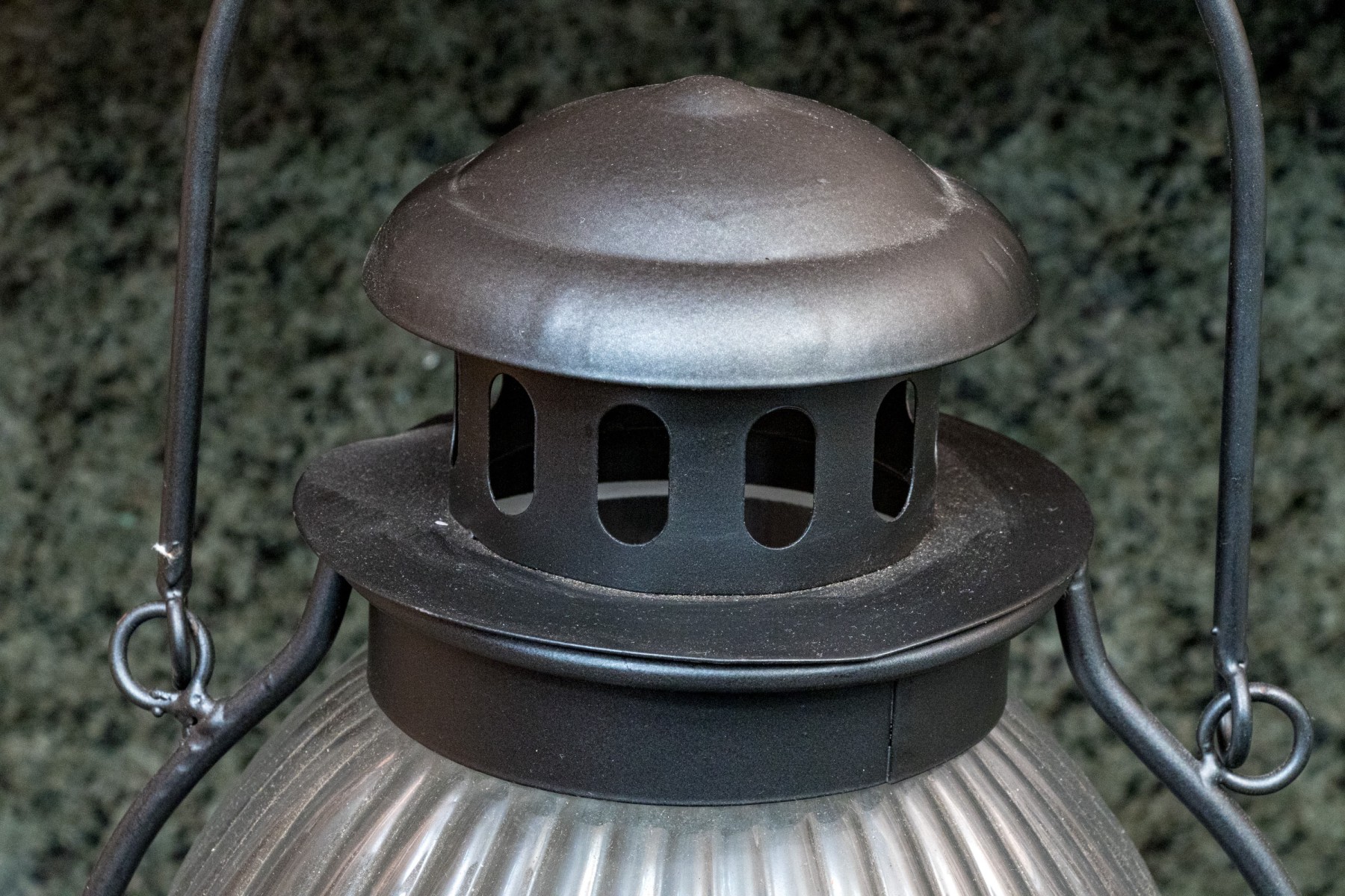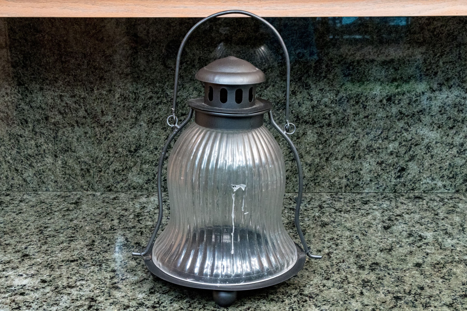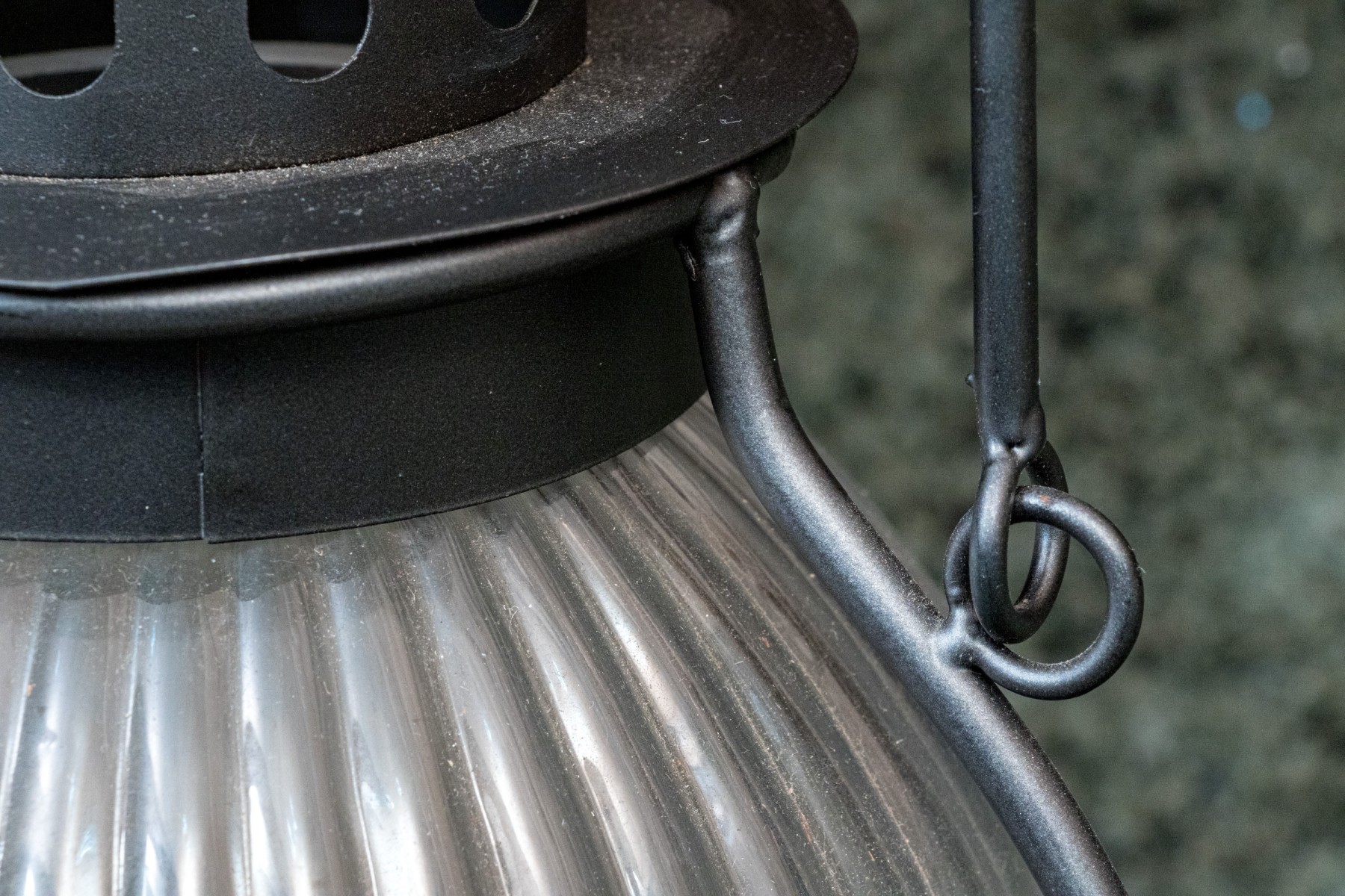 The glass is bell form with reeded decoration on a footed lantern base with sides, a cap and swing handle.