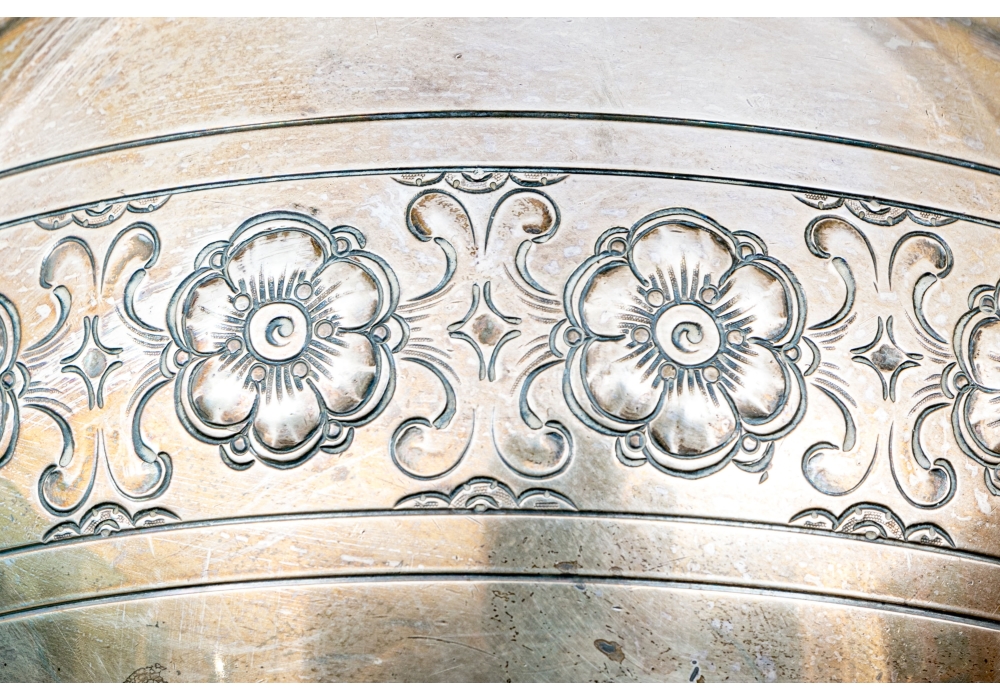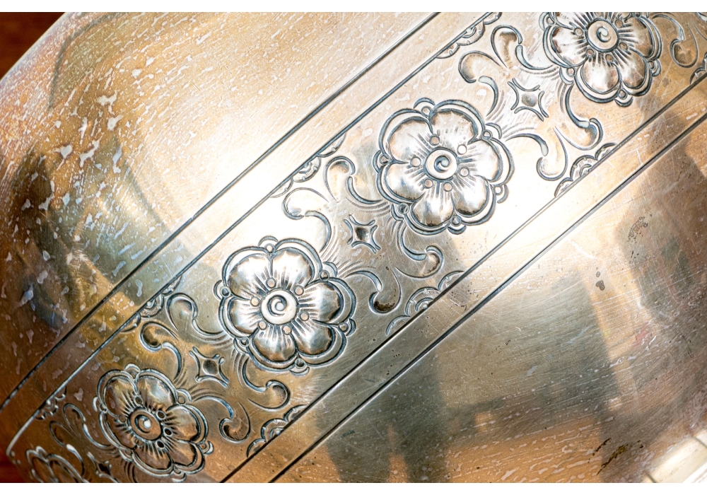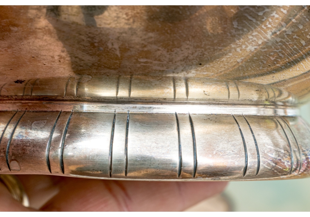 Tarnished and in need of polishing but overall in good form. Very slight bend to foot ring but overall the bowl is a wonderful size and presents beautifully.