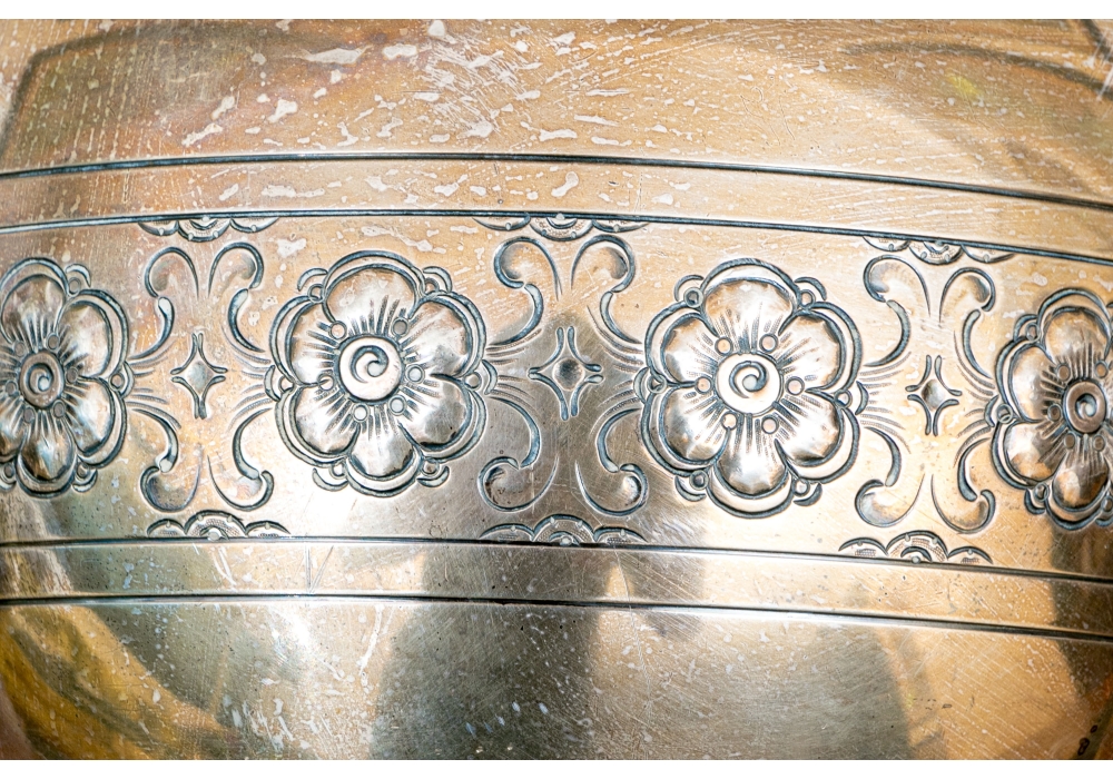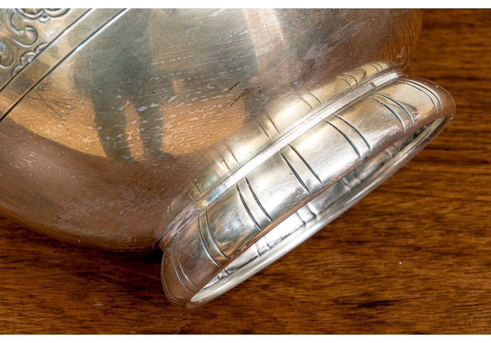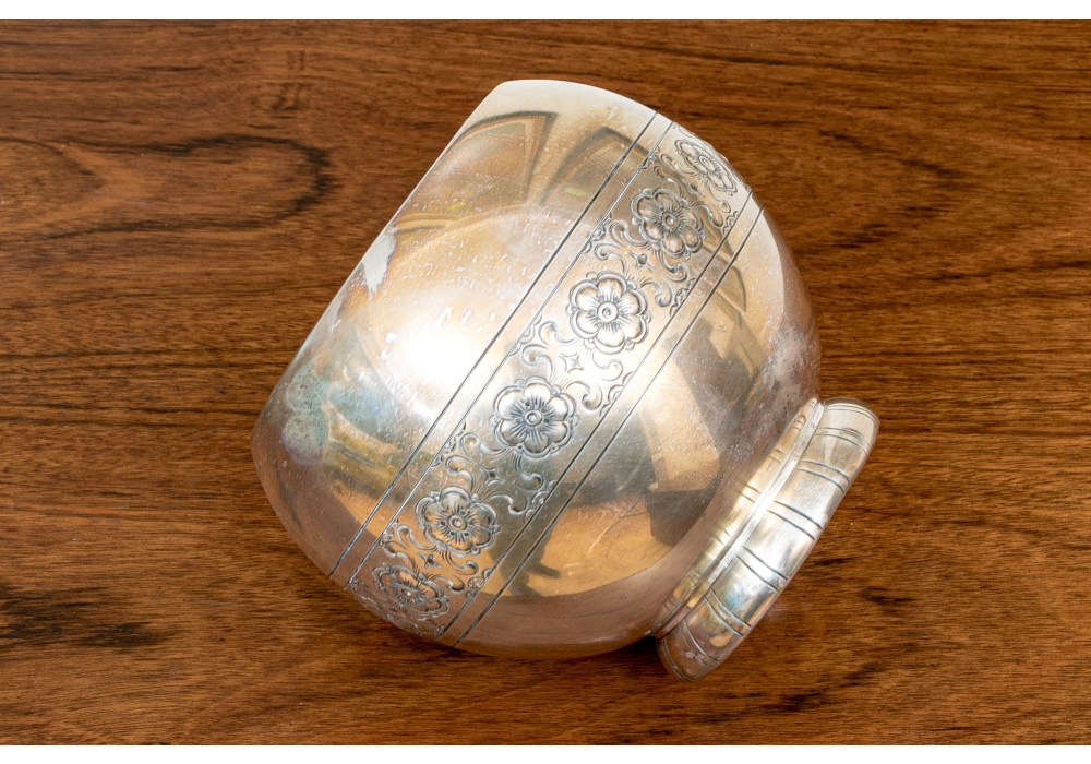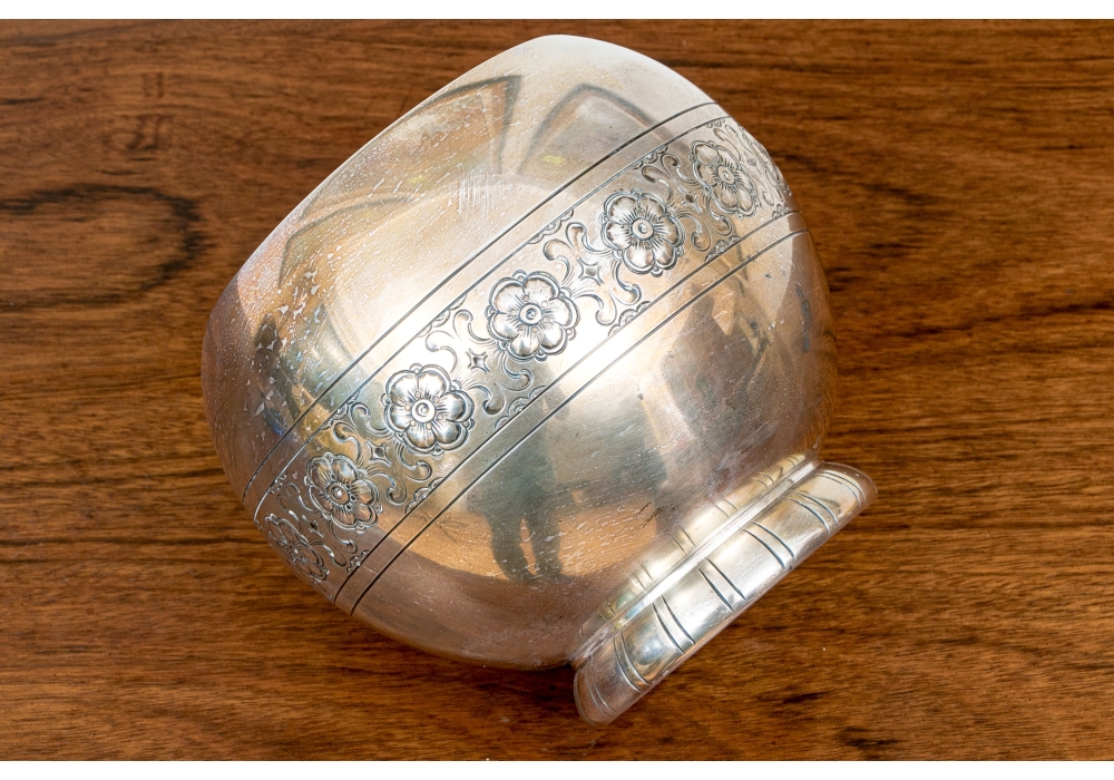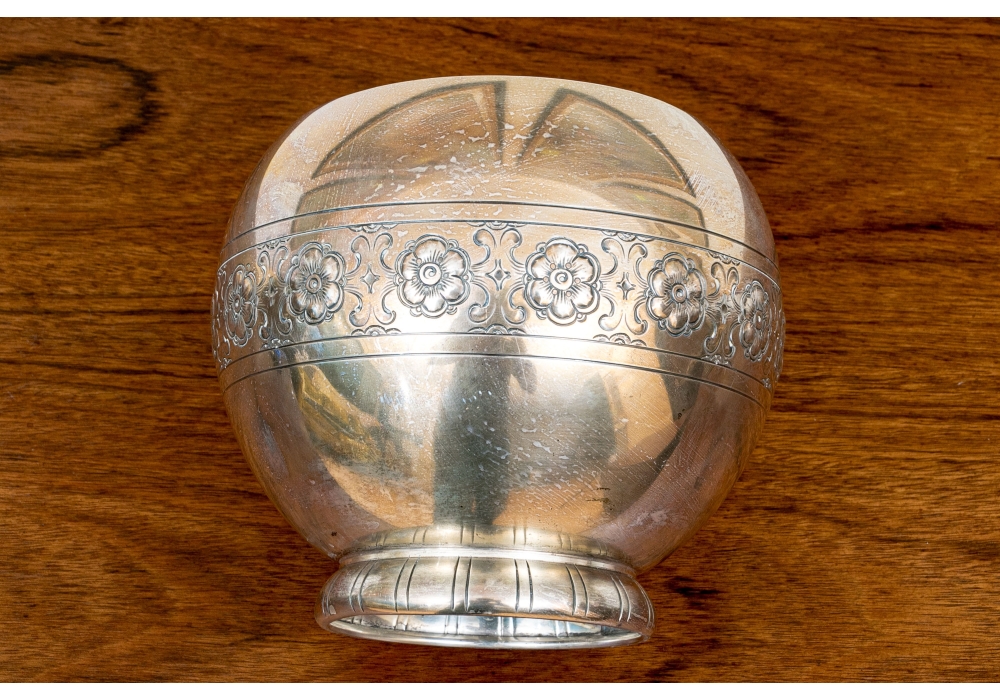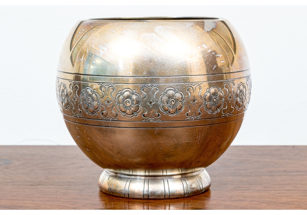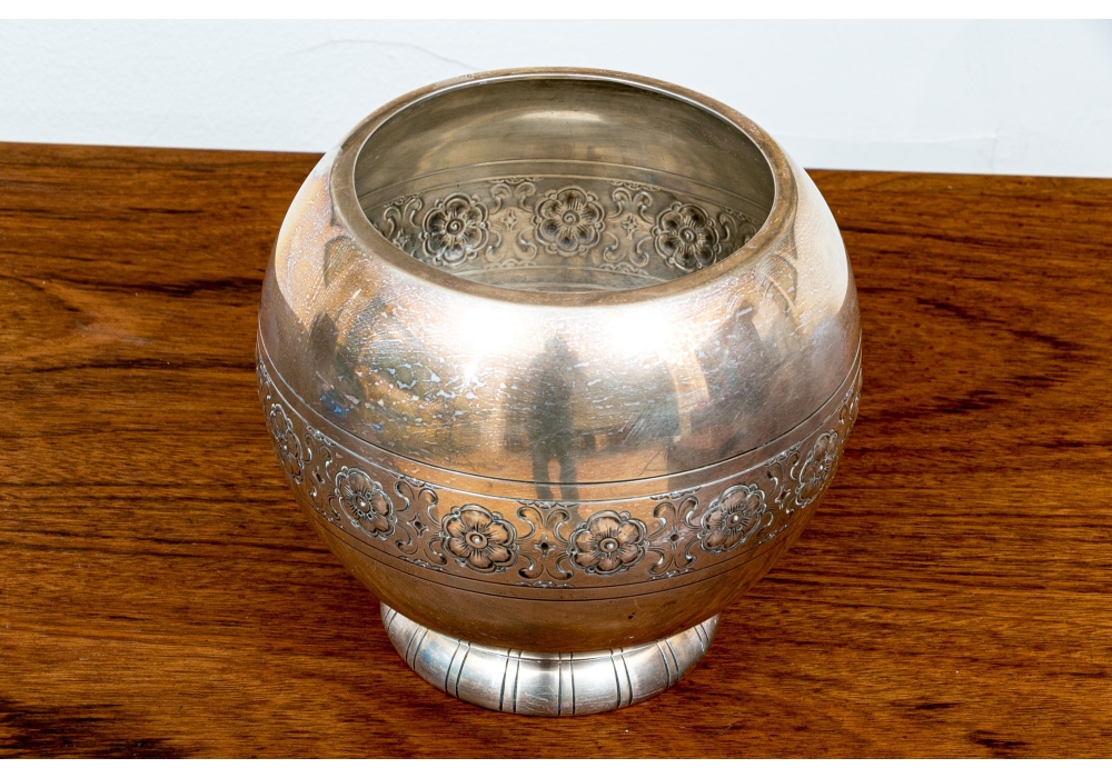 Supported on a short foot ring with vertical lines as decoration, the globular form bowl has a repousse decorated foliate band around the mid section.