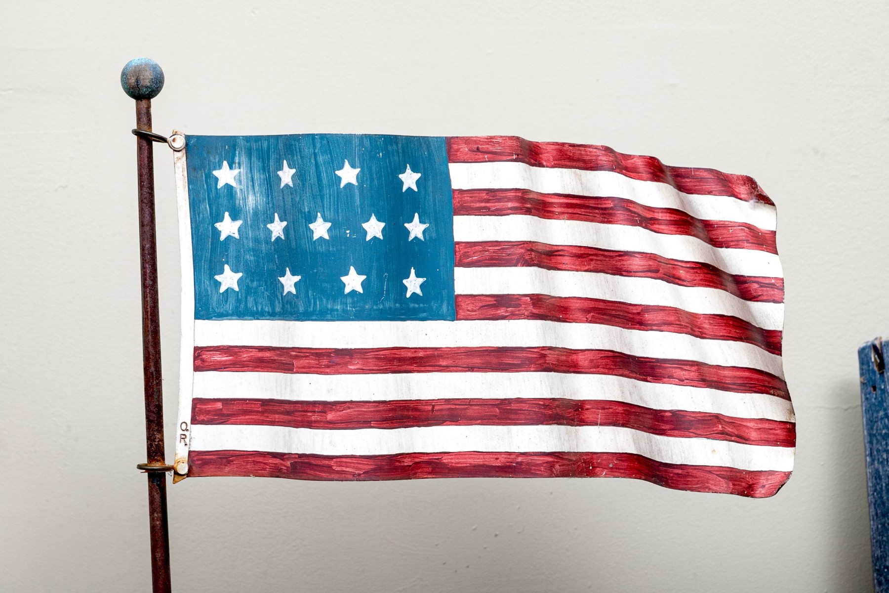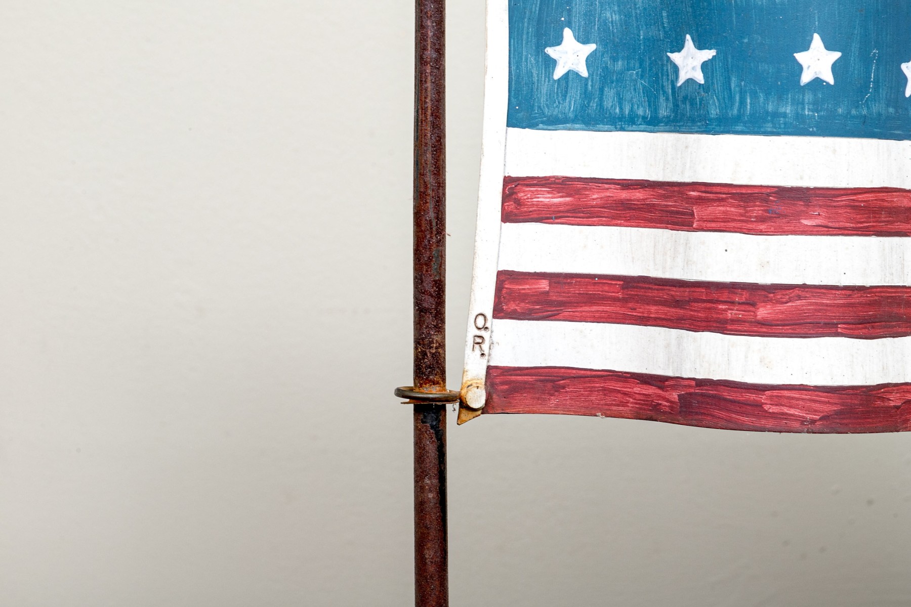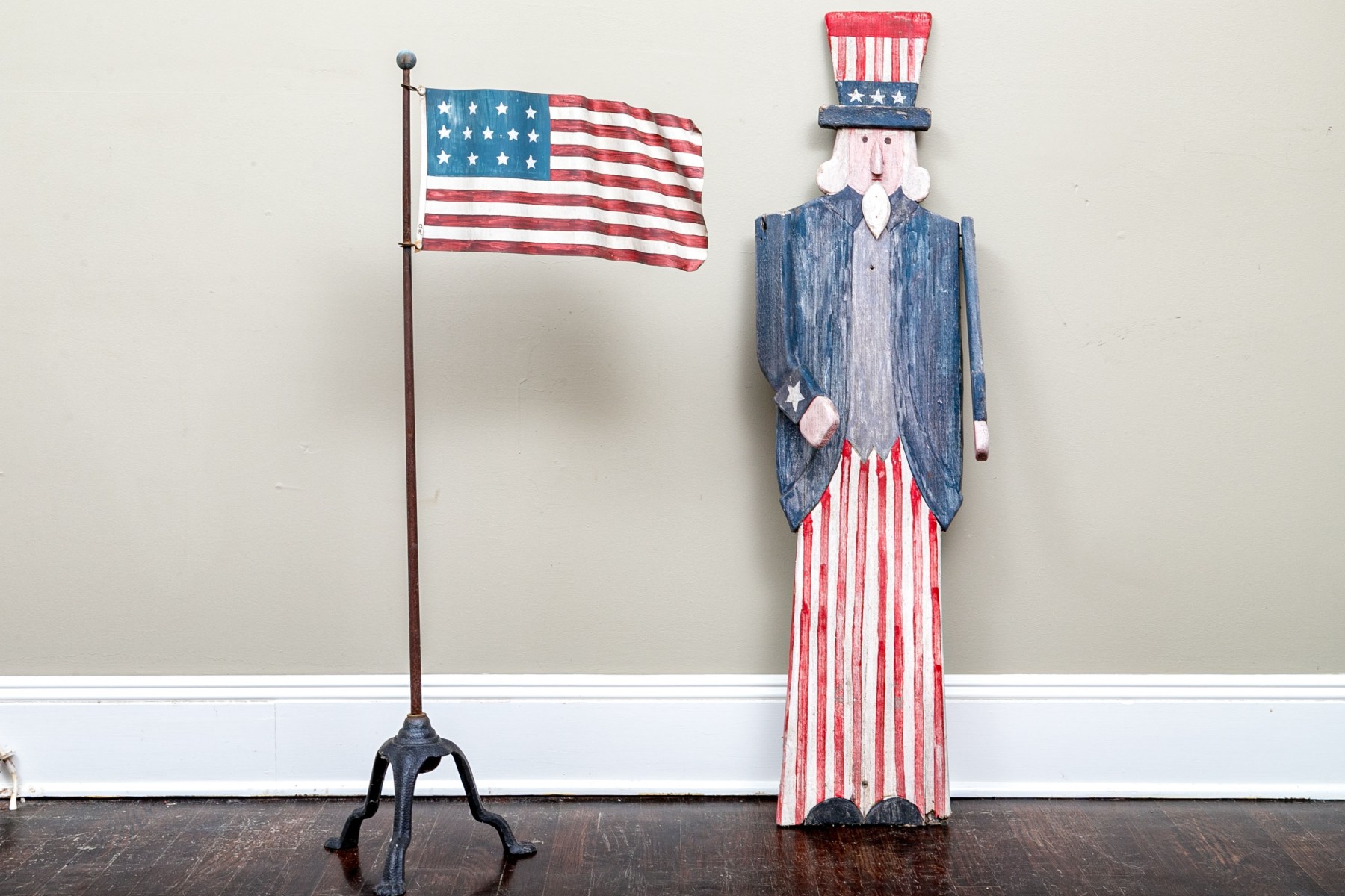 Comprised of carved and polychrome painted wooden figure of Uncle Sam, together with a metal flag having a tin panel, signed O.R.