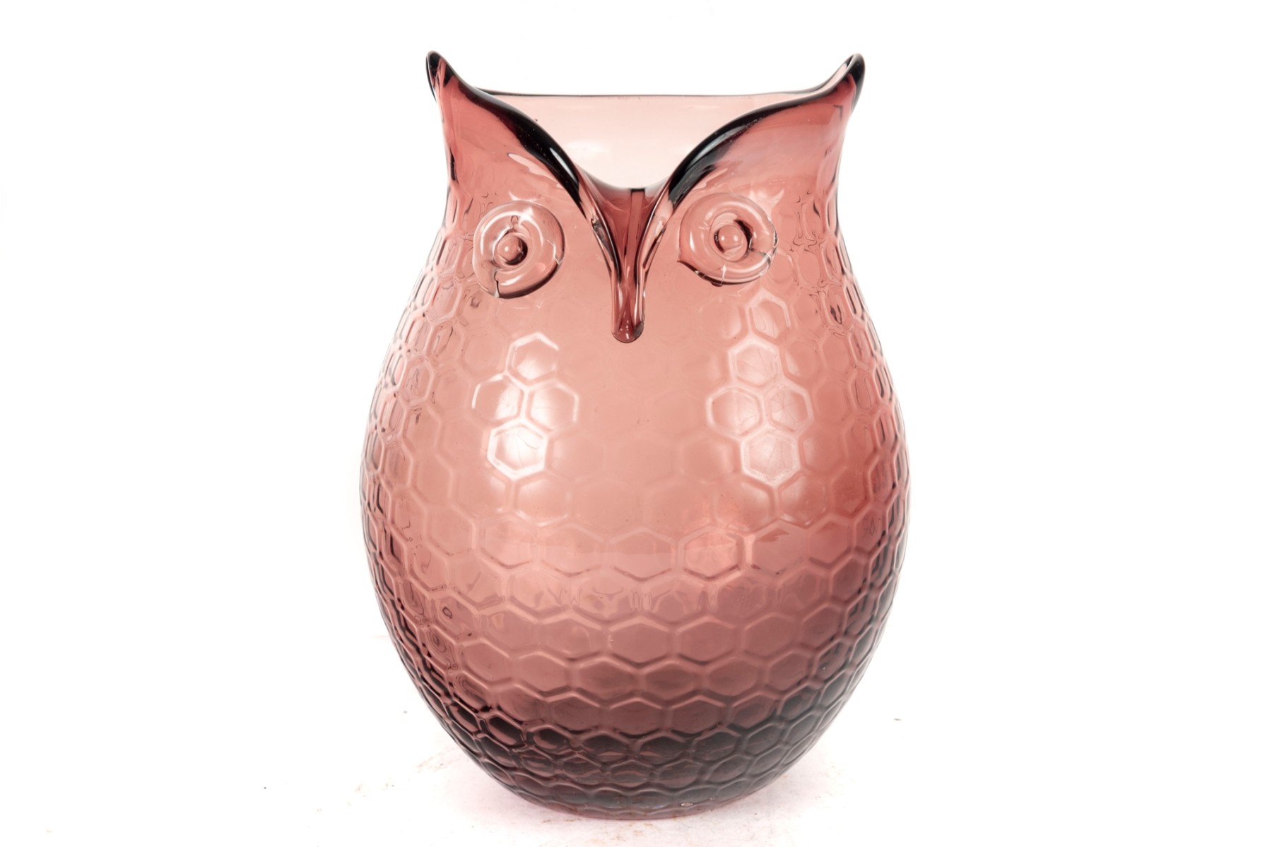 Charming vintage art glass vase in the form of an owl, rendered in a rich amethyst purple tone. The body features a honeycomb-textured surface for additional depth.