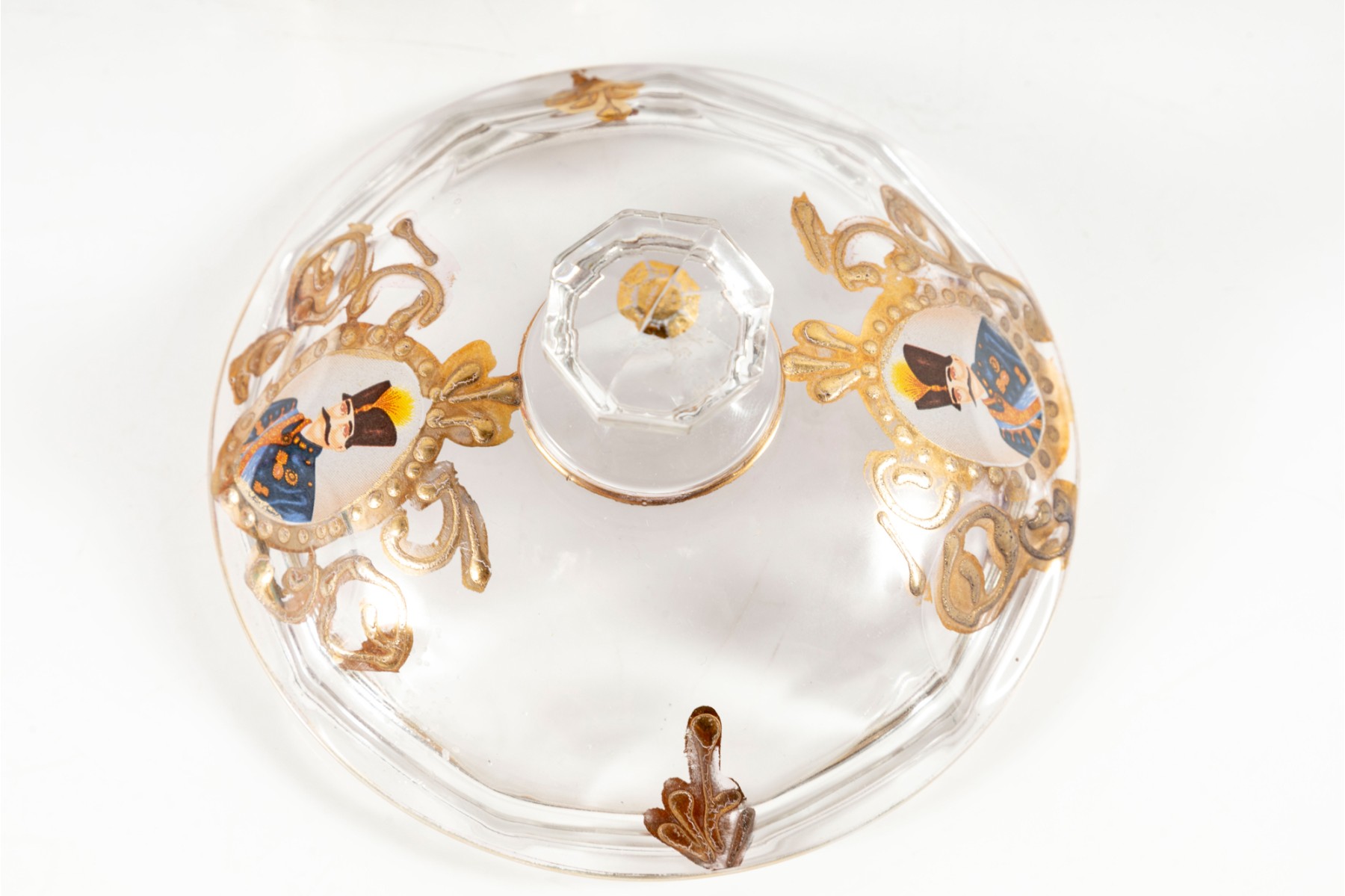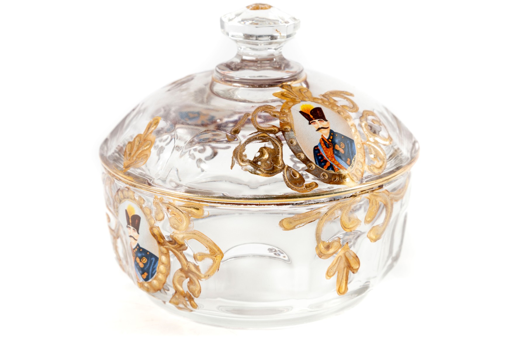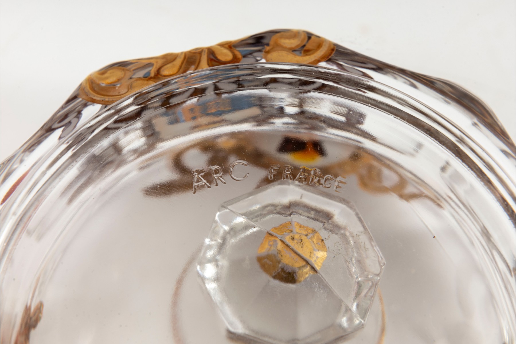 A small vintage ARC France (Arc Holdings Glassware) gilded glass candy dish capsule emblazoned with a depiction of the Persian King Nasar. See photos for details.