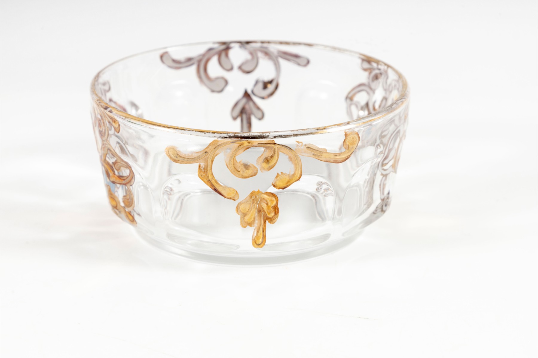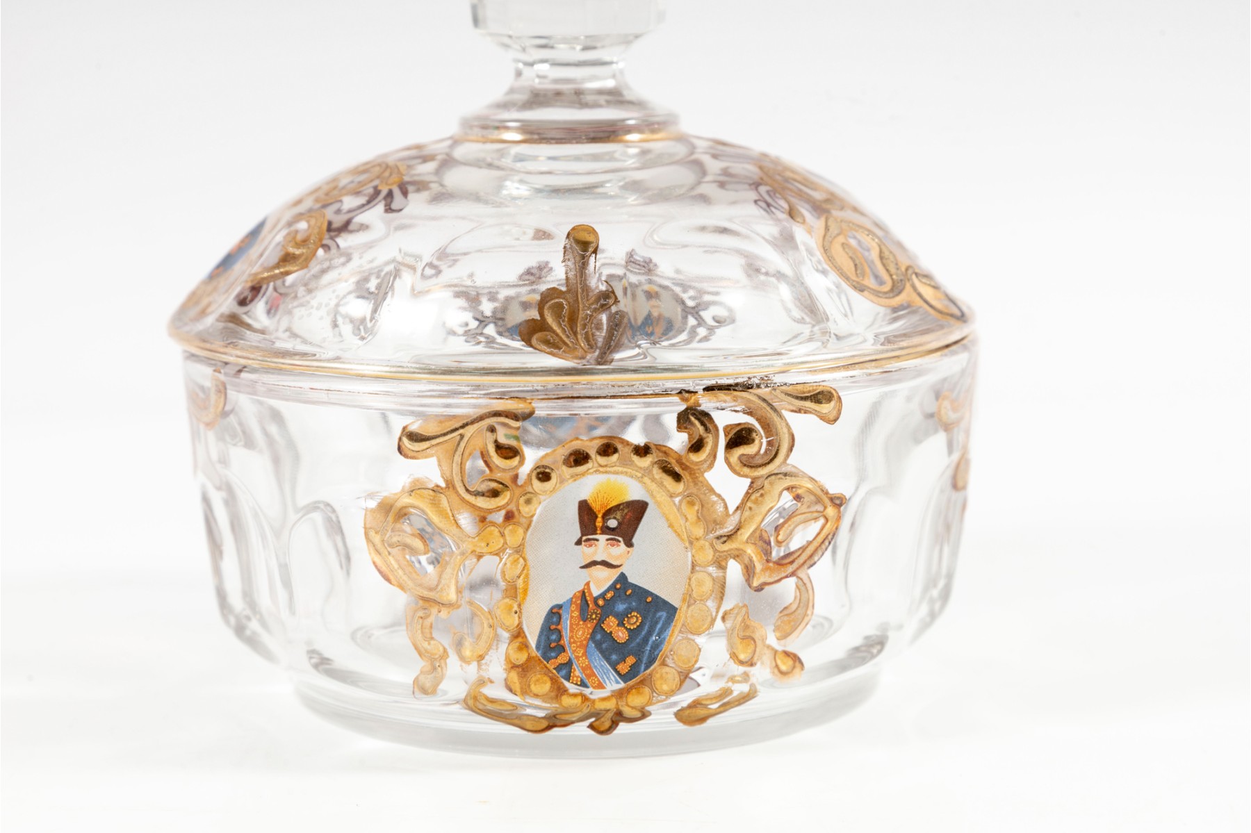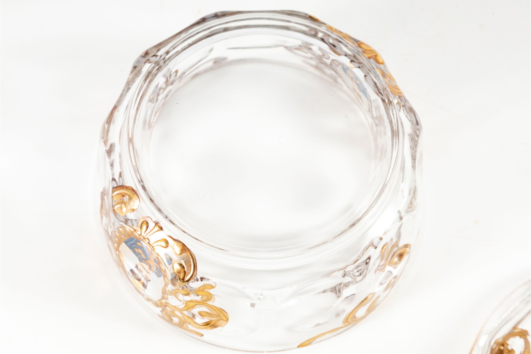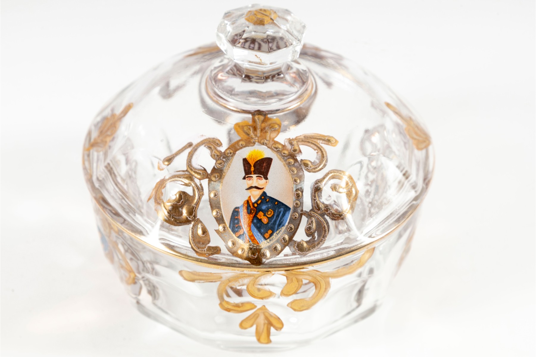 A small vintage ARC France (Arc Holdings Glassware) gilded glass candy dish capsule emblazoned with a depiction of the Persian King Nasar. See photos for details.