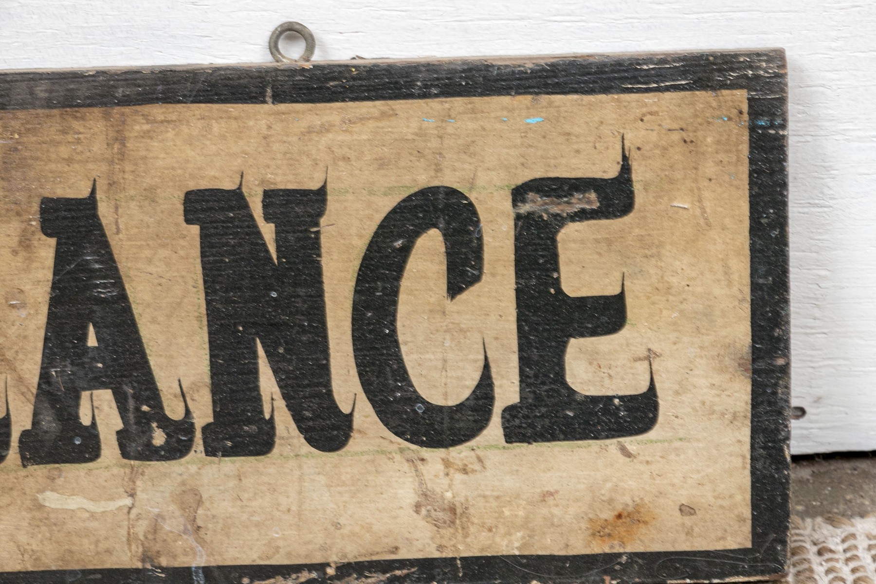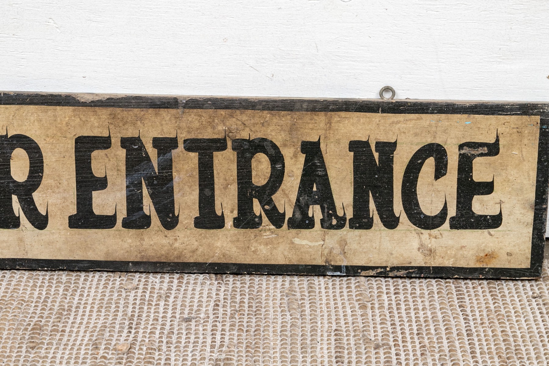 Painted in white with black lettering on both sides. Loops on the top for hanging.