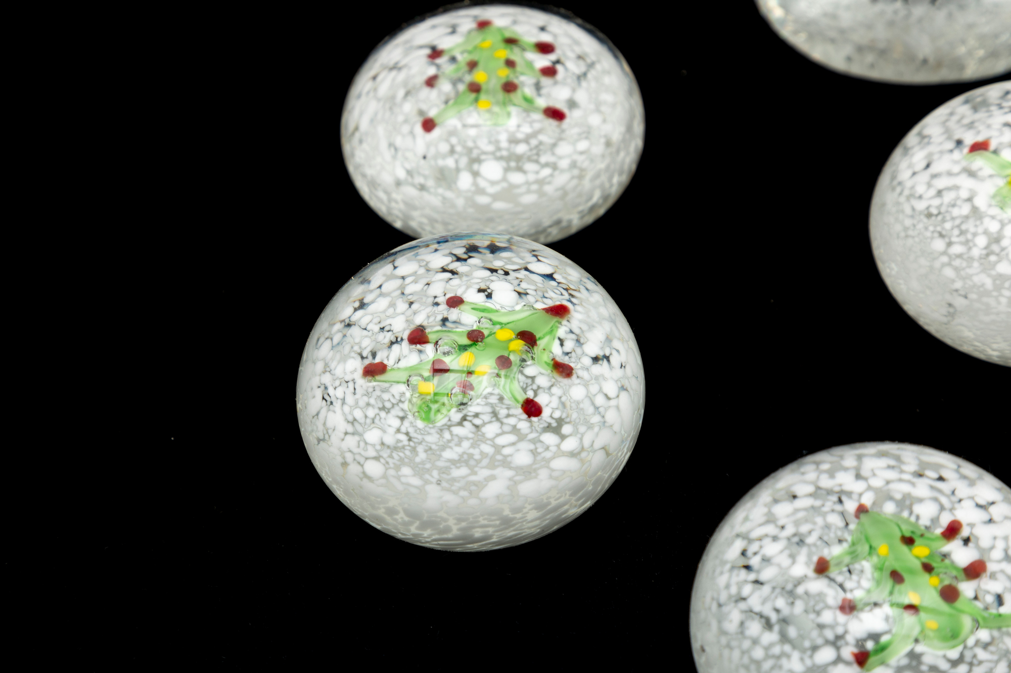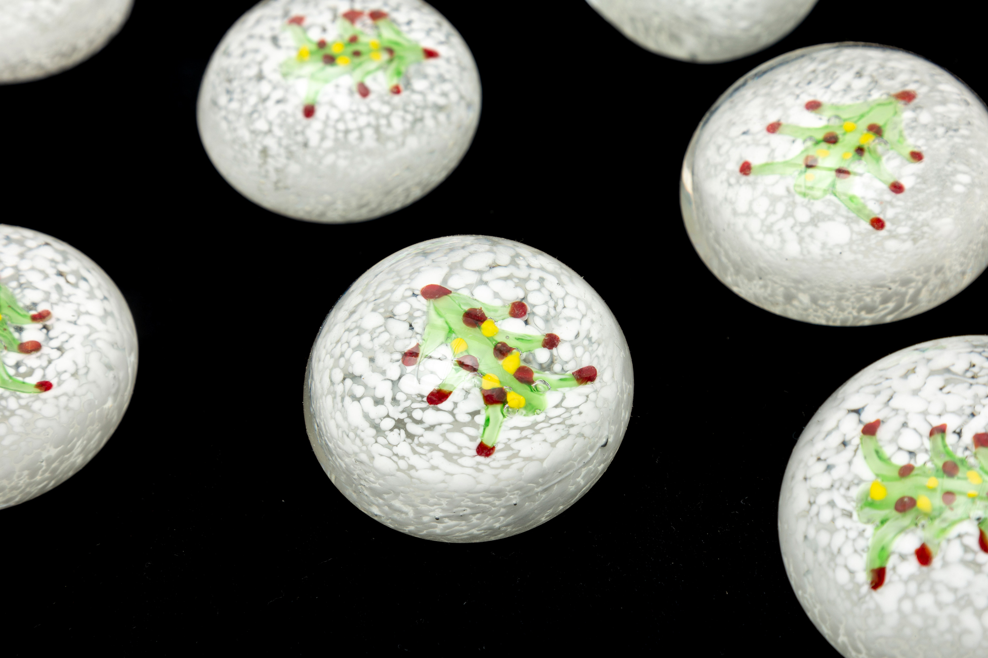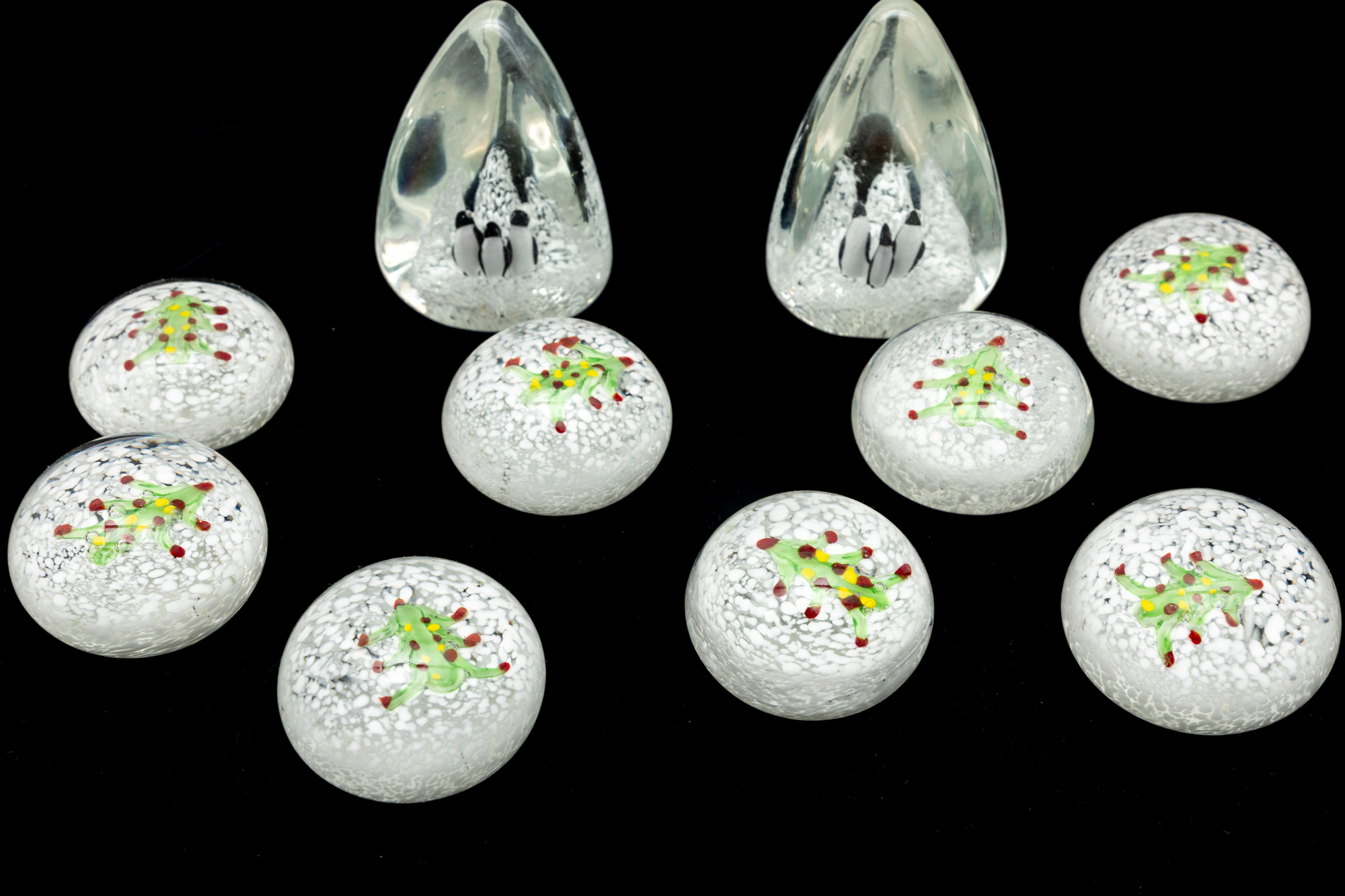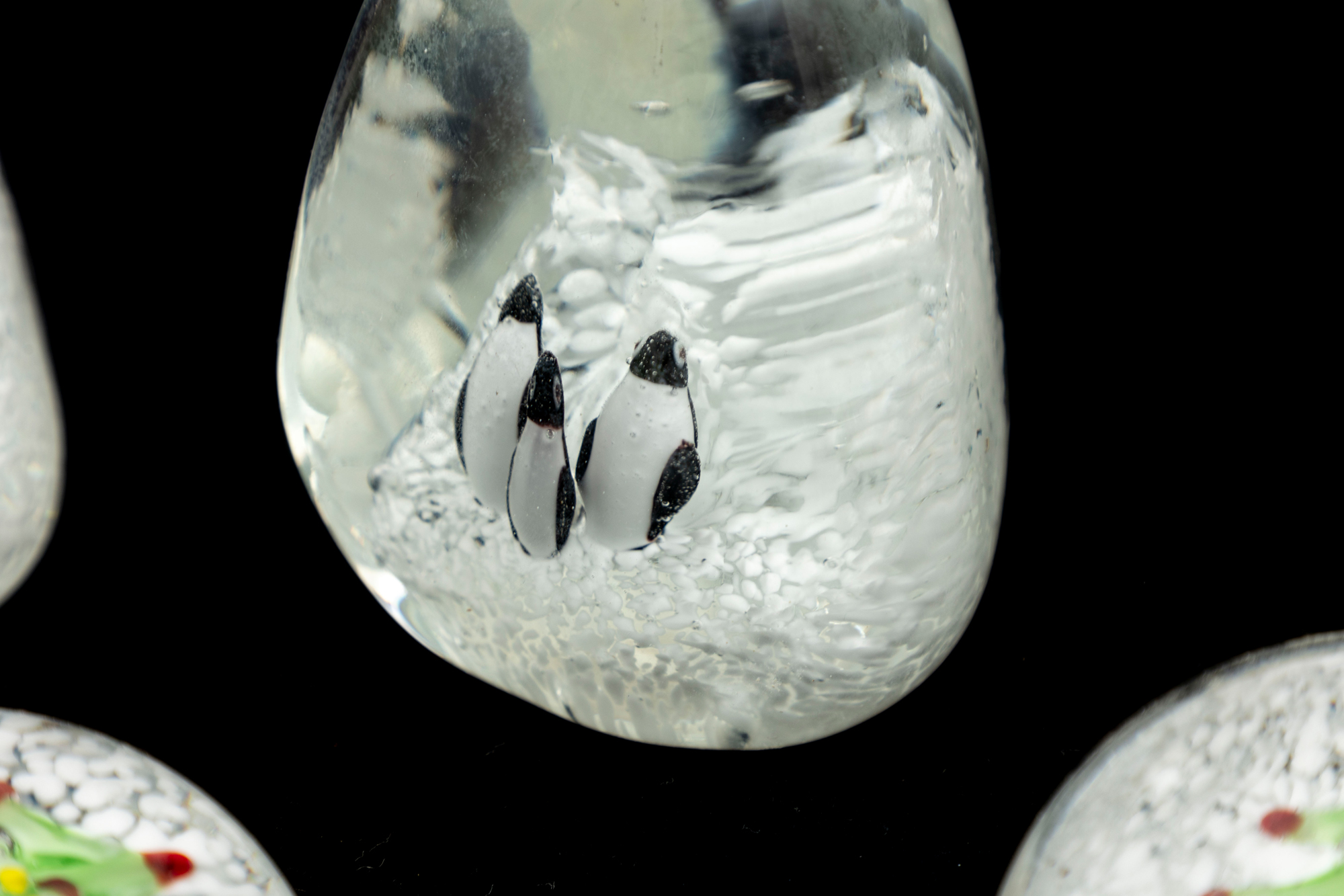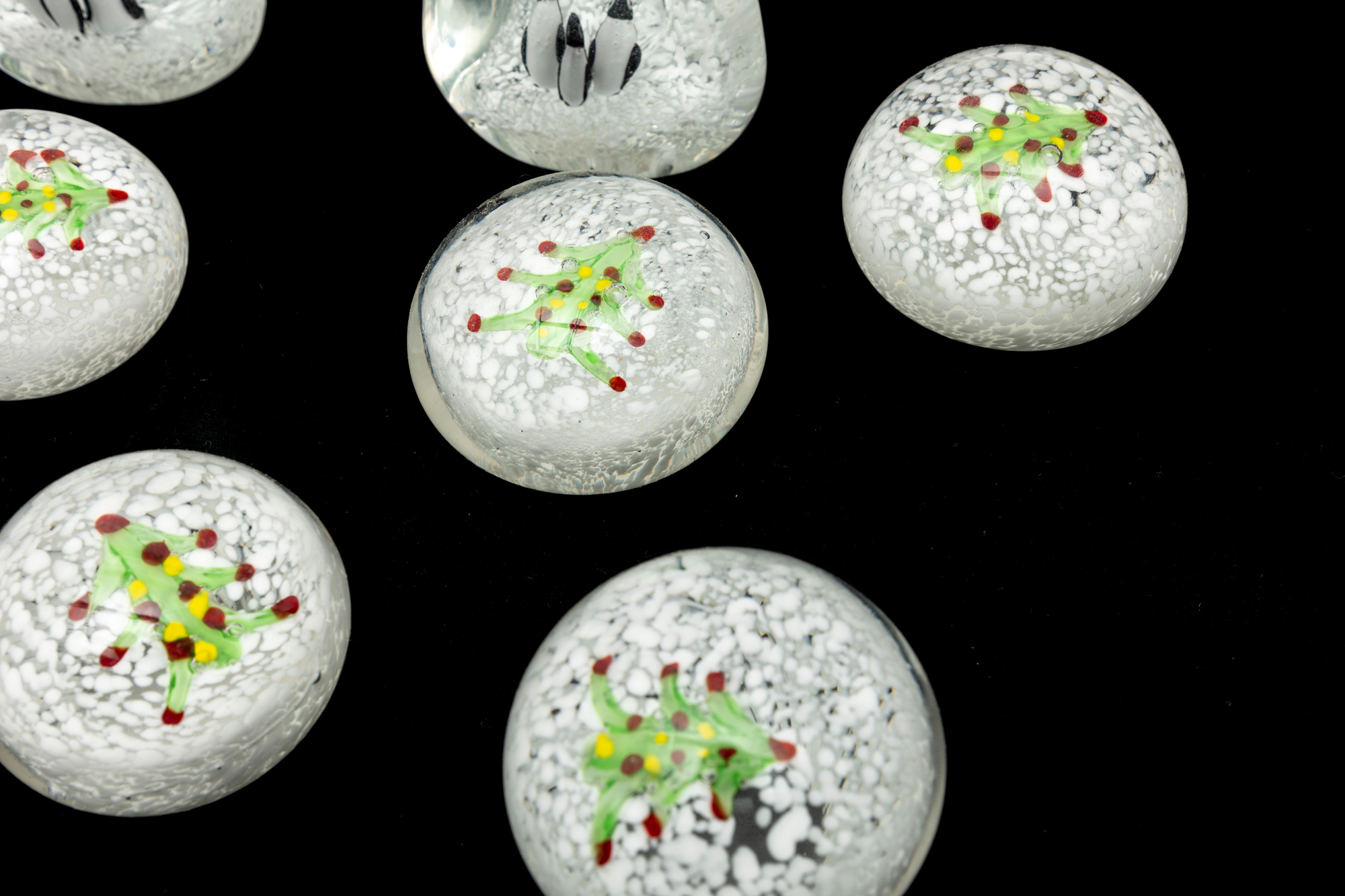 A collection of seasonal holiday art glass paperweights, eight of which are embedded with Christmas tree motifs. Two larger examples are detailed with a family of three penguins. All items are unmarked & unsigned.