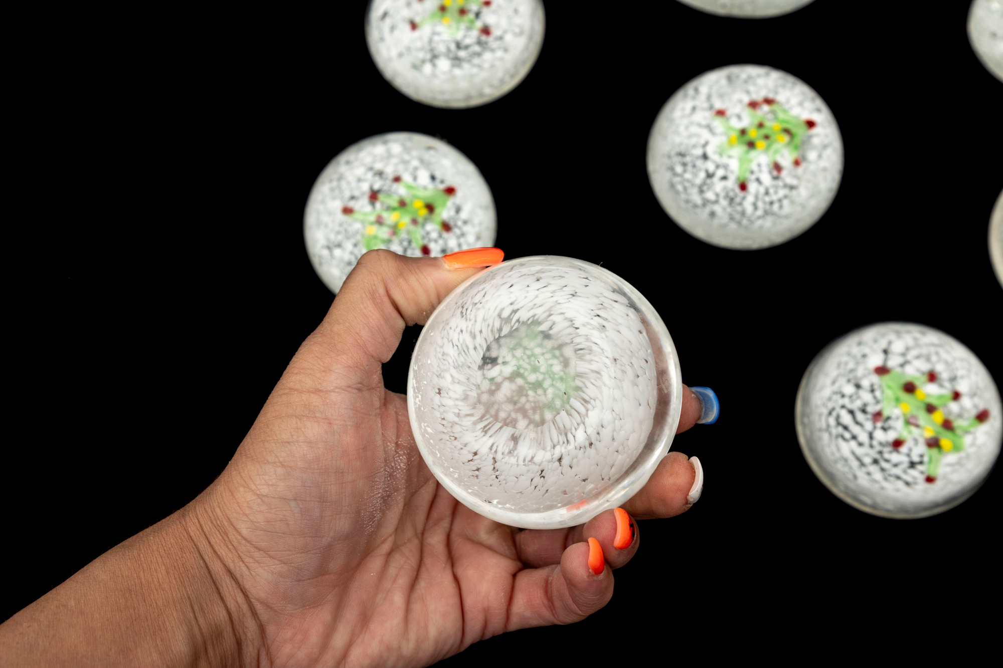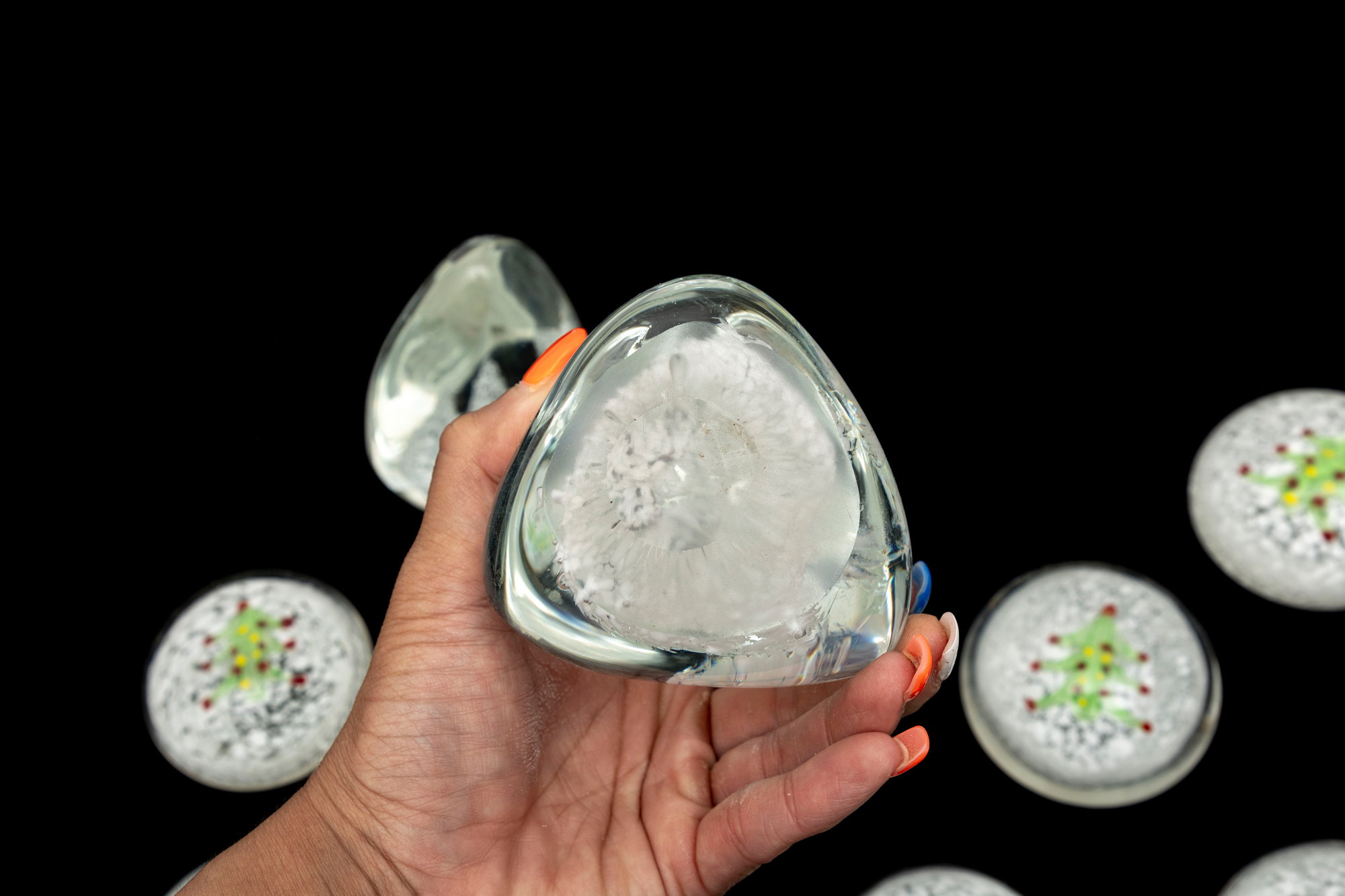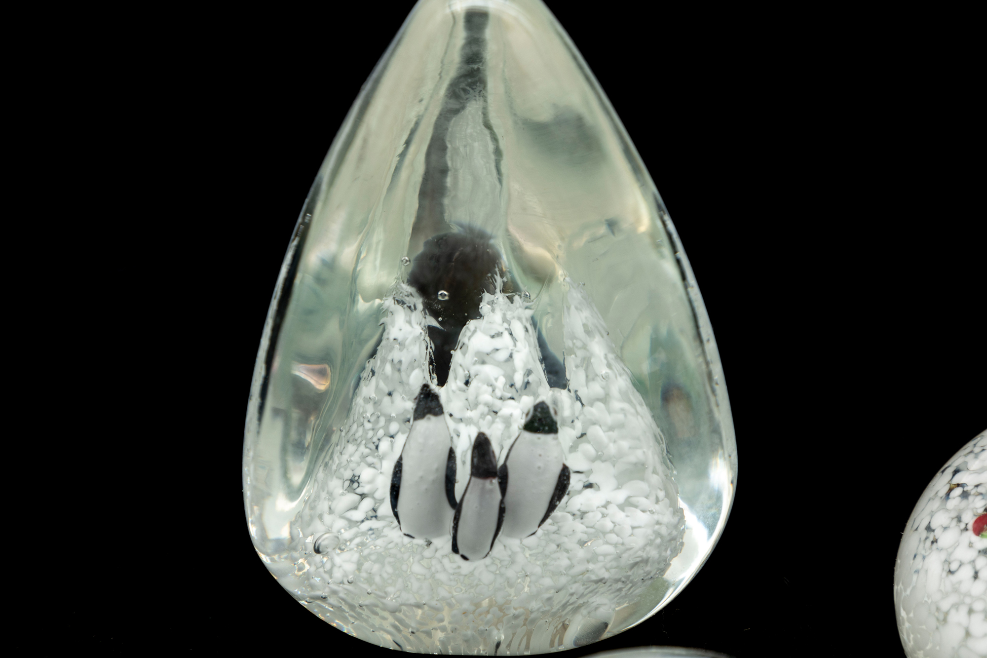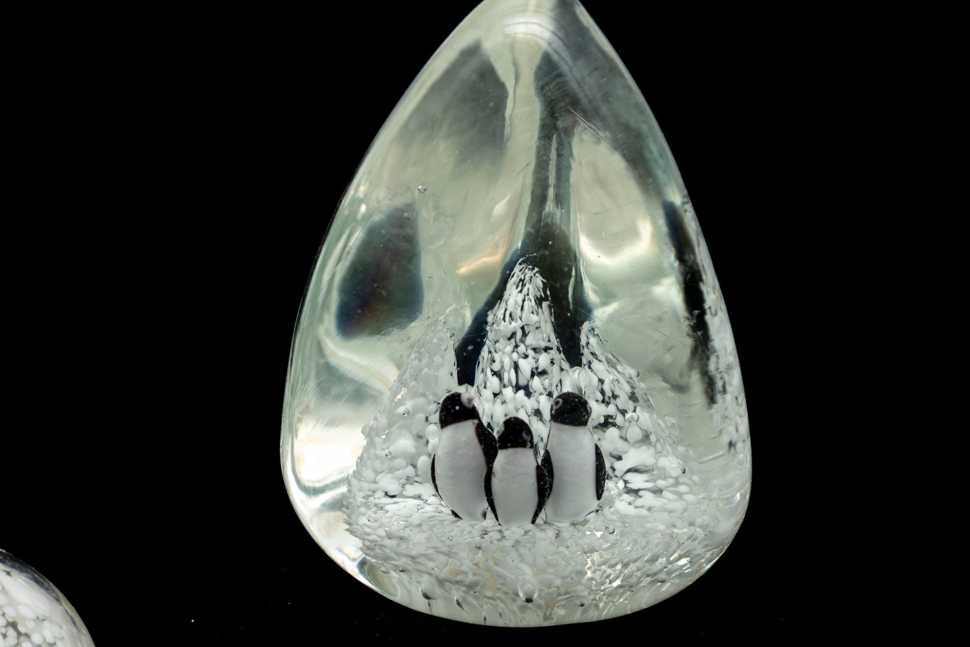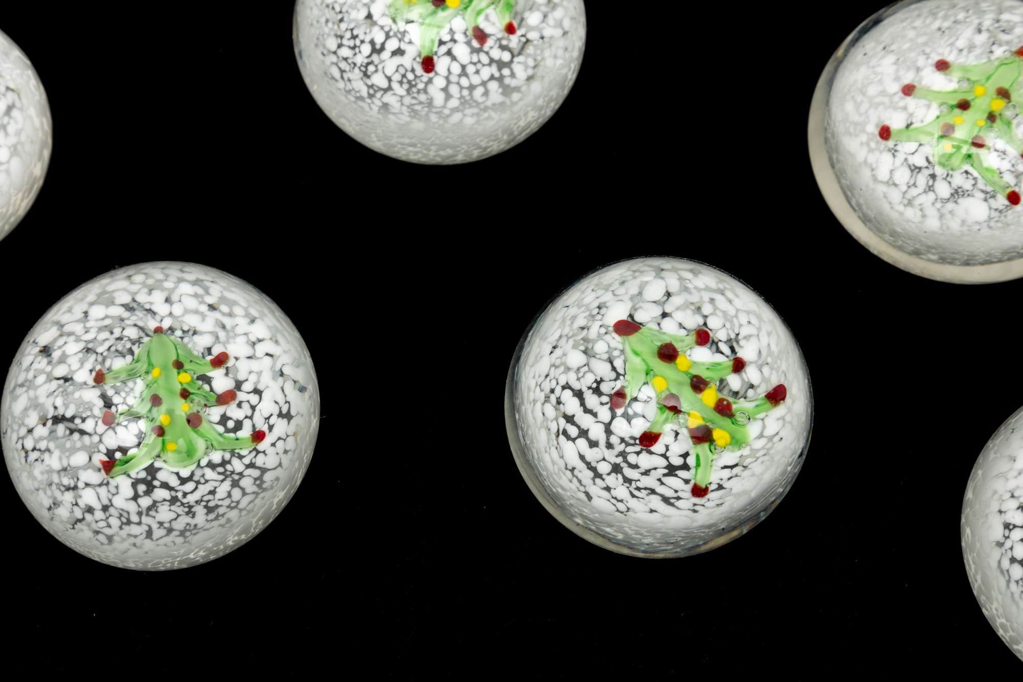 A collection of seasonal holiday art glass paperweights, eight of which are embedded with Christmas tree motifs. Two larger examples are detailed with a family of three penguins. All items are unmarked & unsigned.