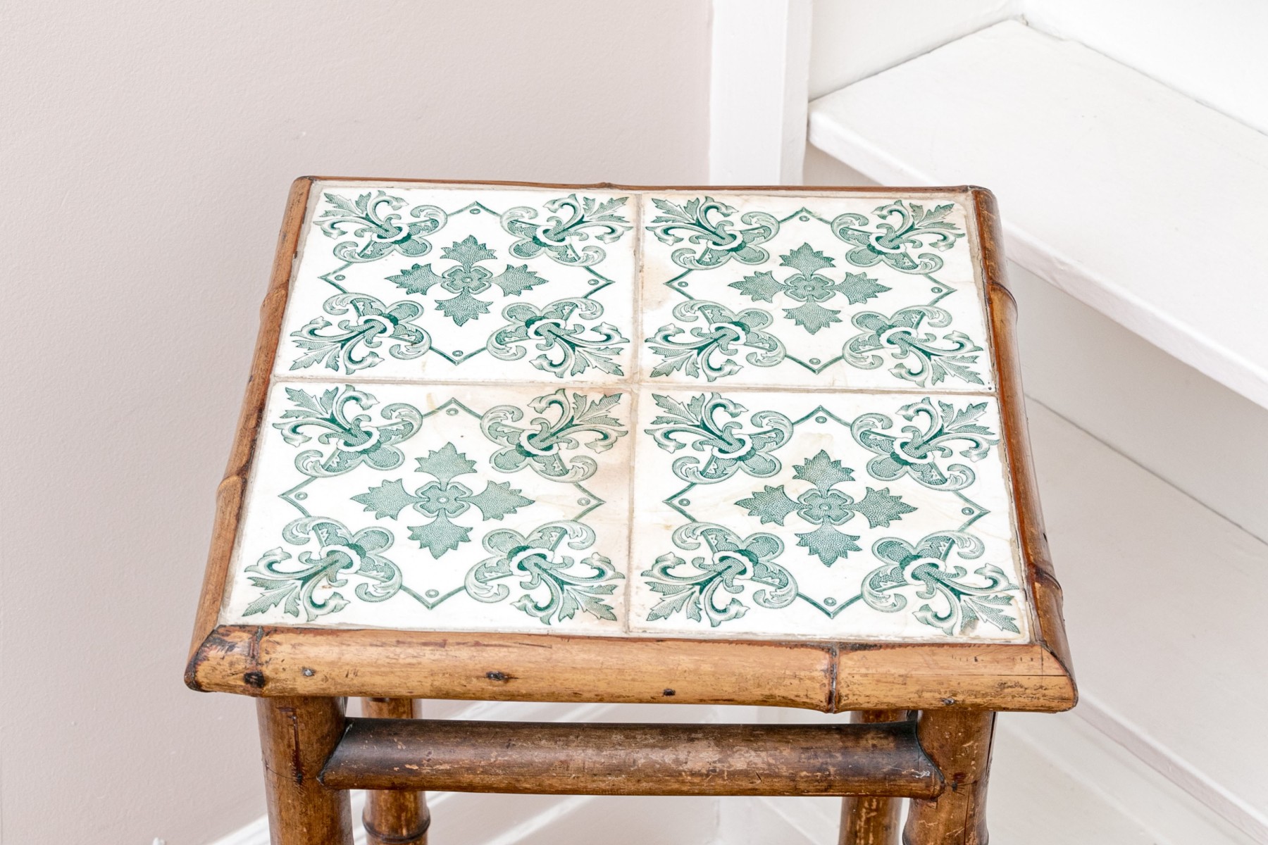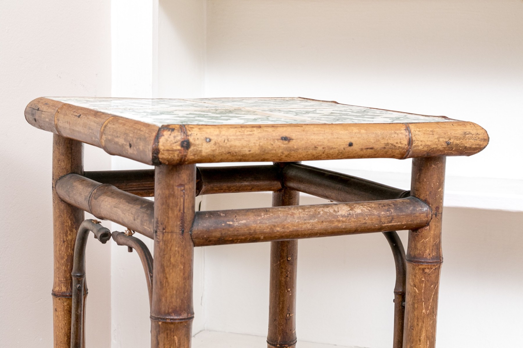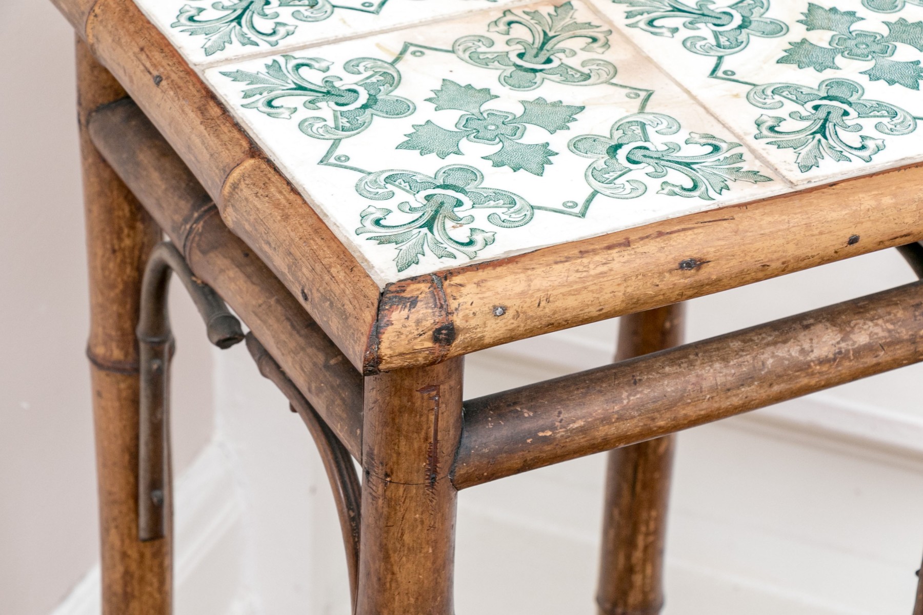 Crafted from bamboo, the frame of this table showcases a distinctive aged and weathered finish. The tabletop is adorned with beautiful blue/green tile designs, and the legs are connected by bamboo stretchers, gracefully splaying at the ends