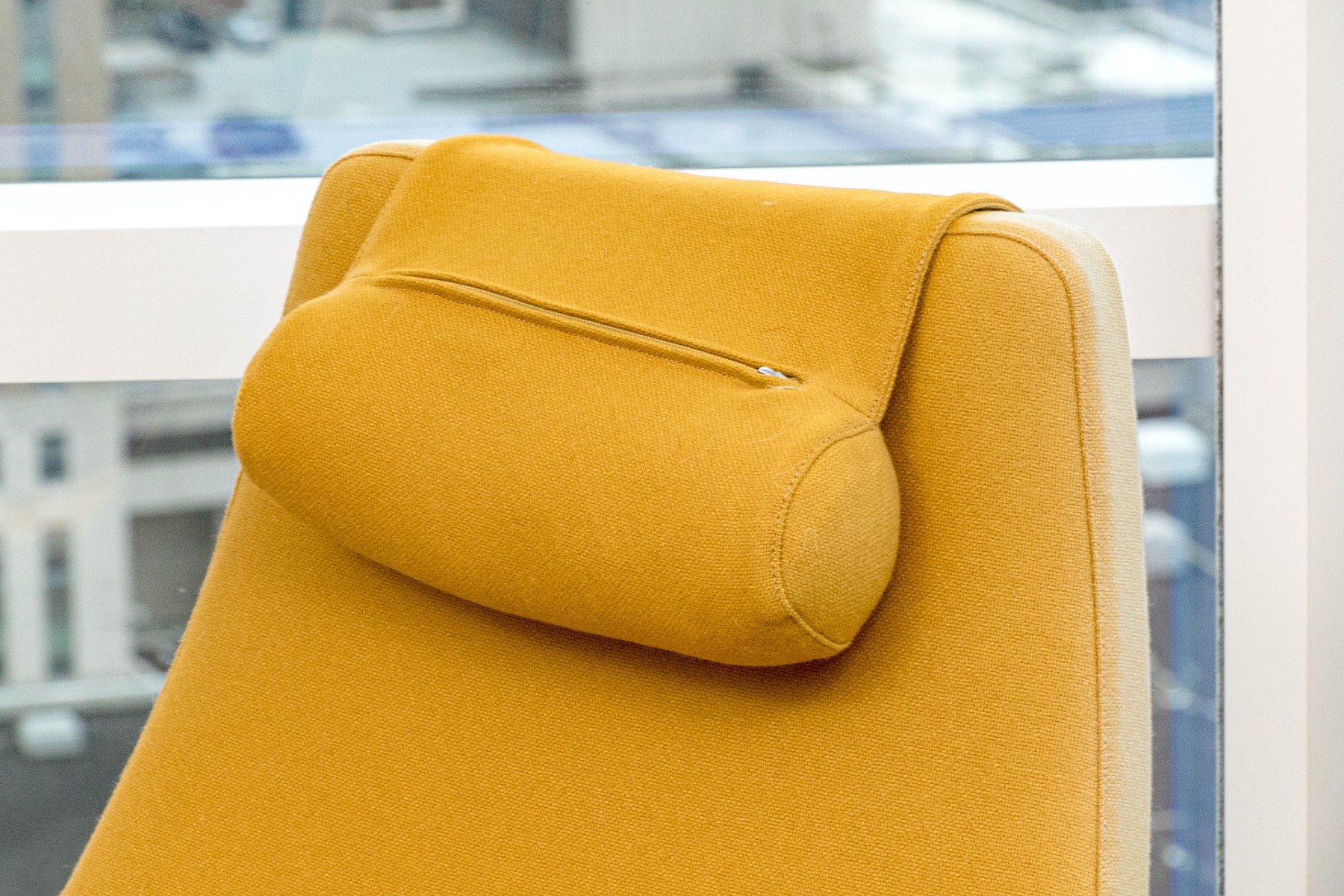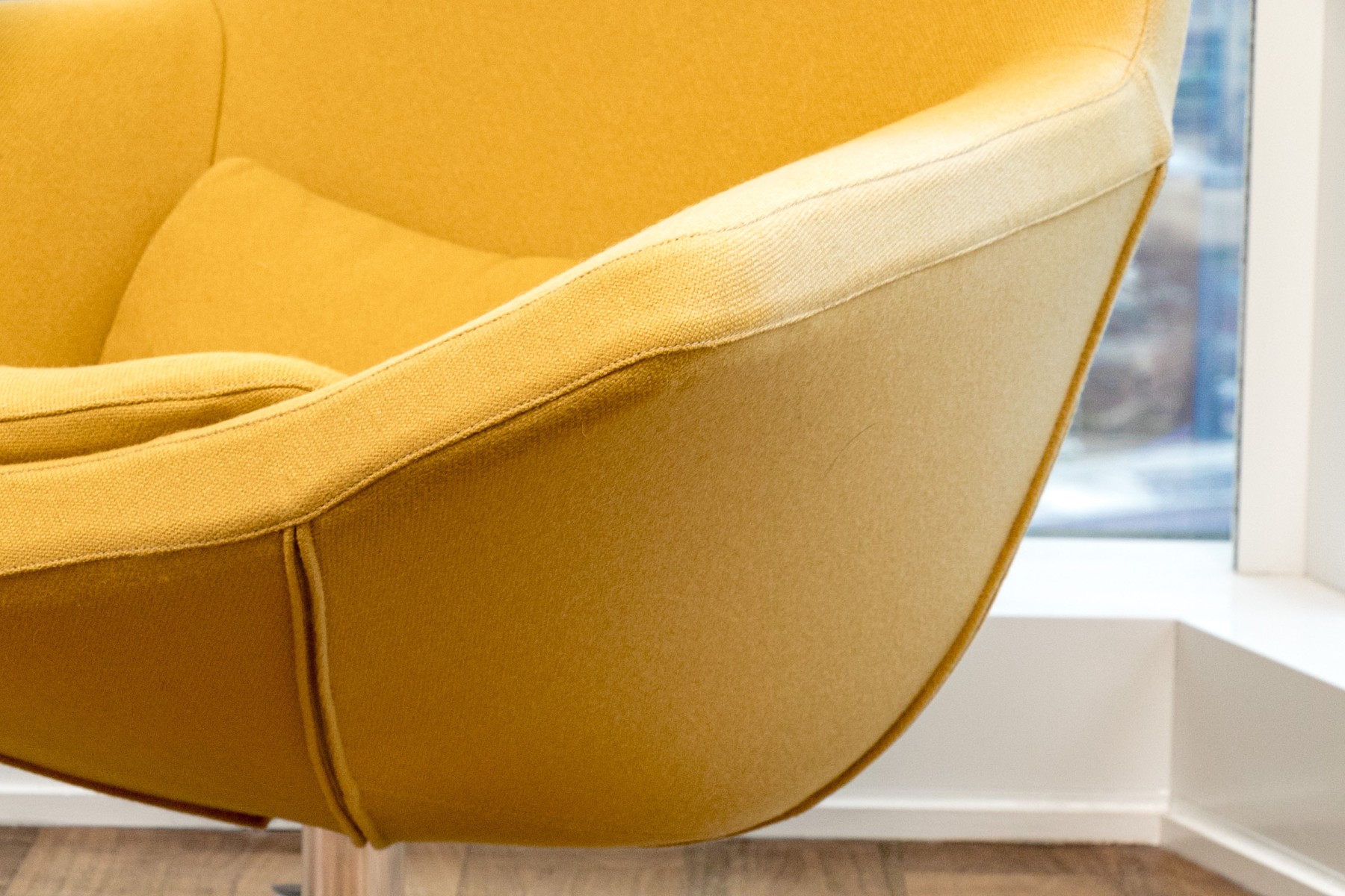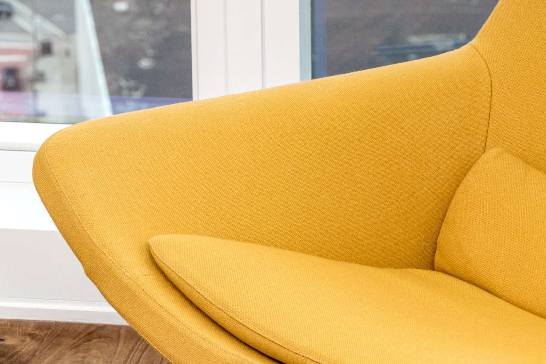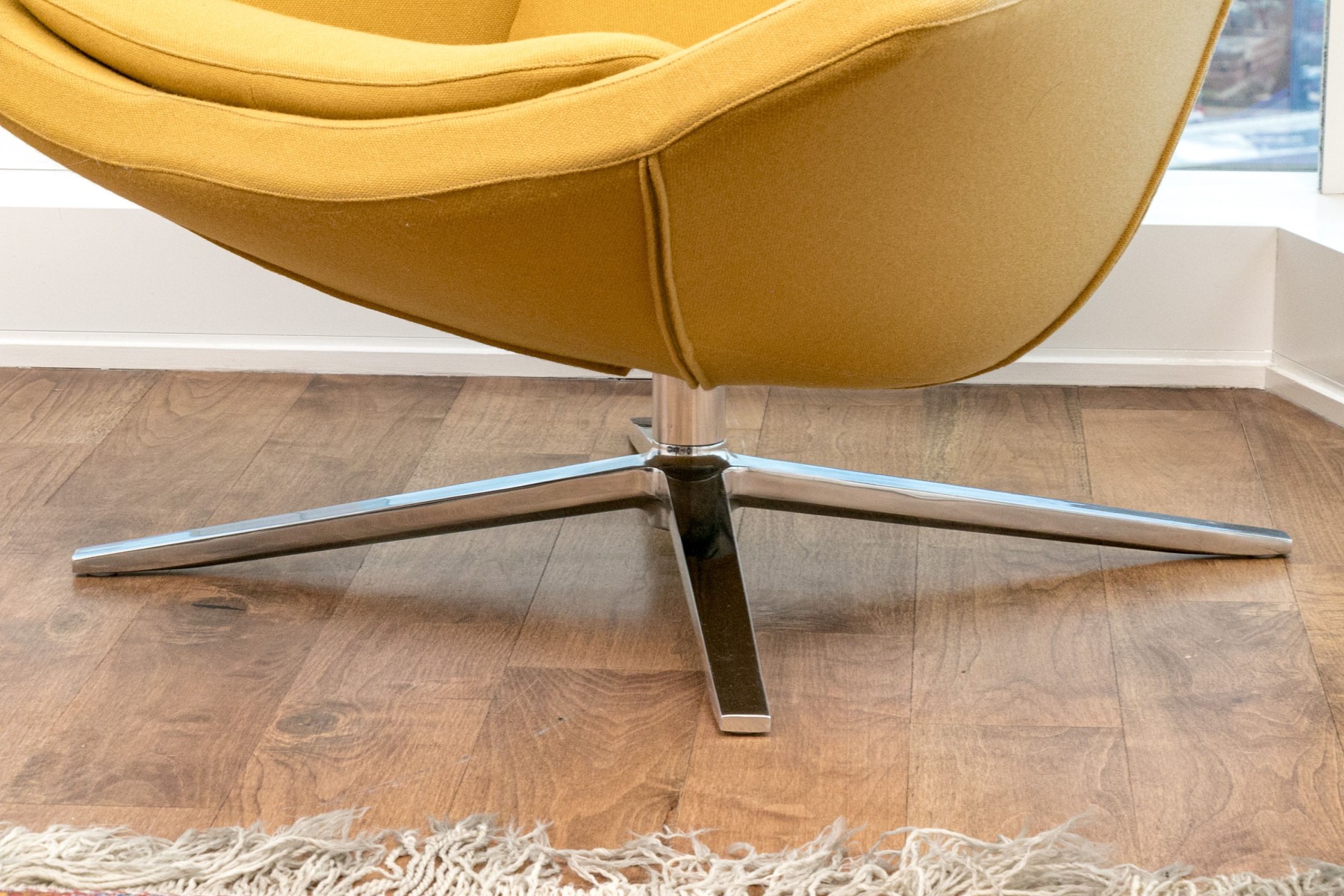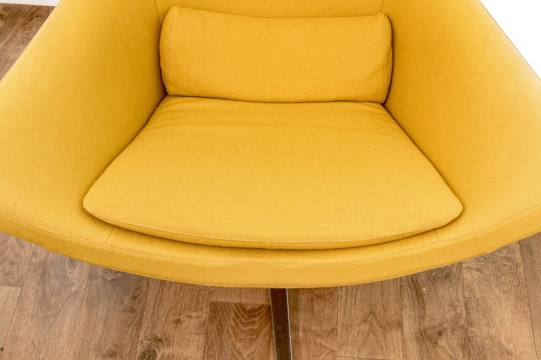 Made in Italy. One of their exclusive modern designs. A tub chair with wide arms and sloping back mounted on an X form steel frame. Upholstered in a mustard yellow polyurethane fabric. With separate head and lumbar pillows.
