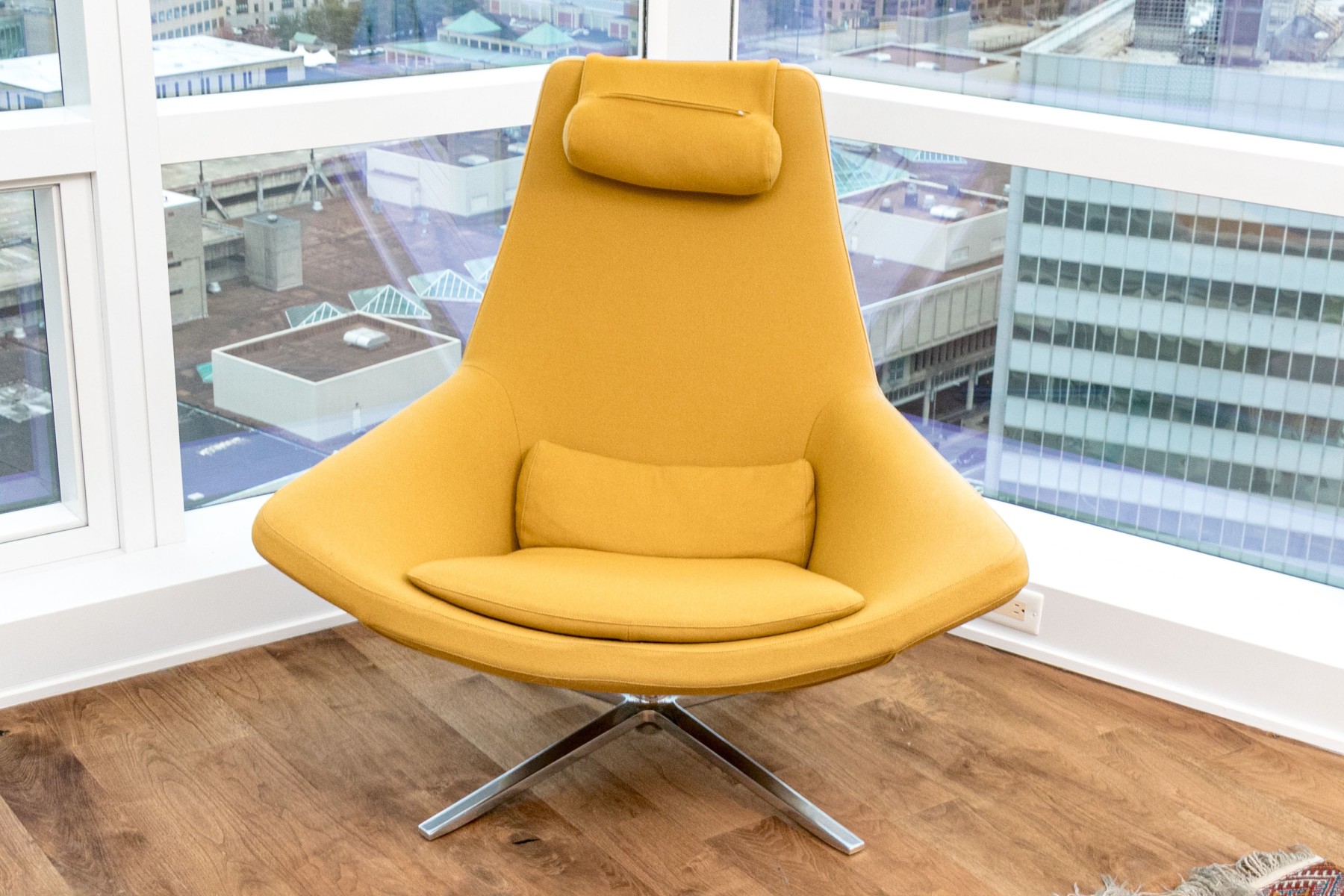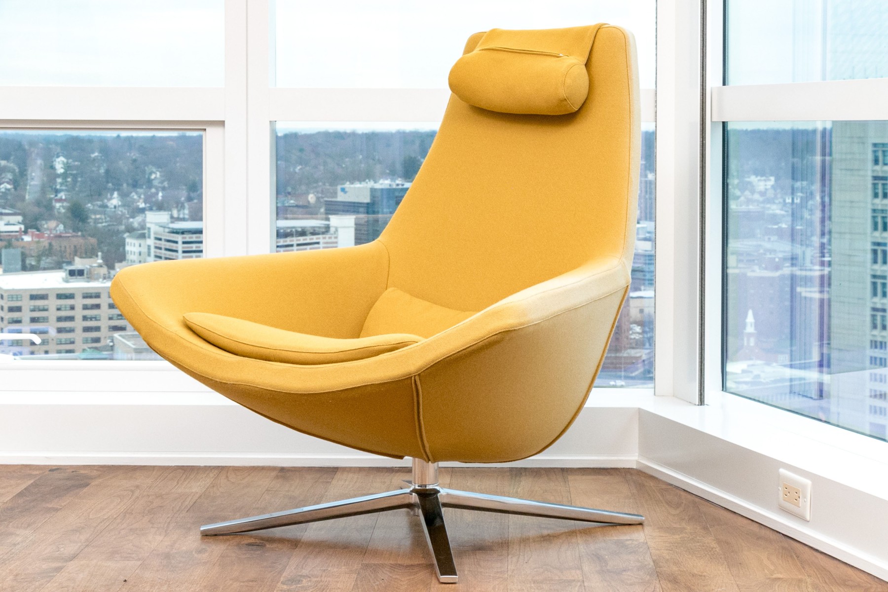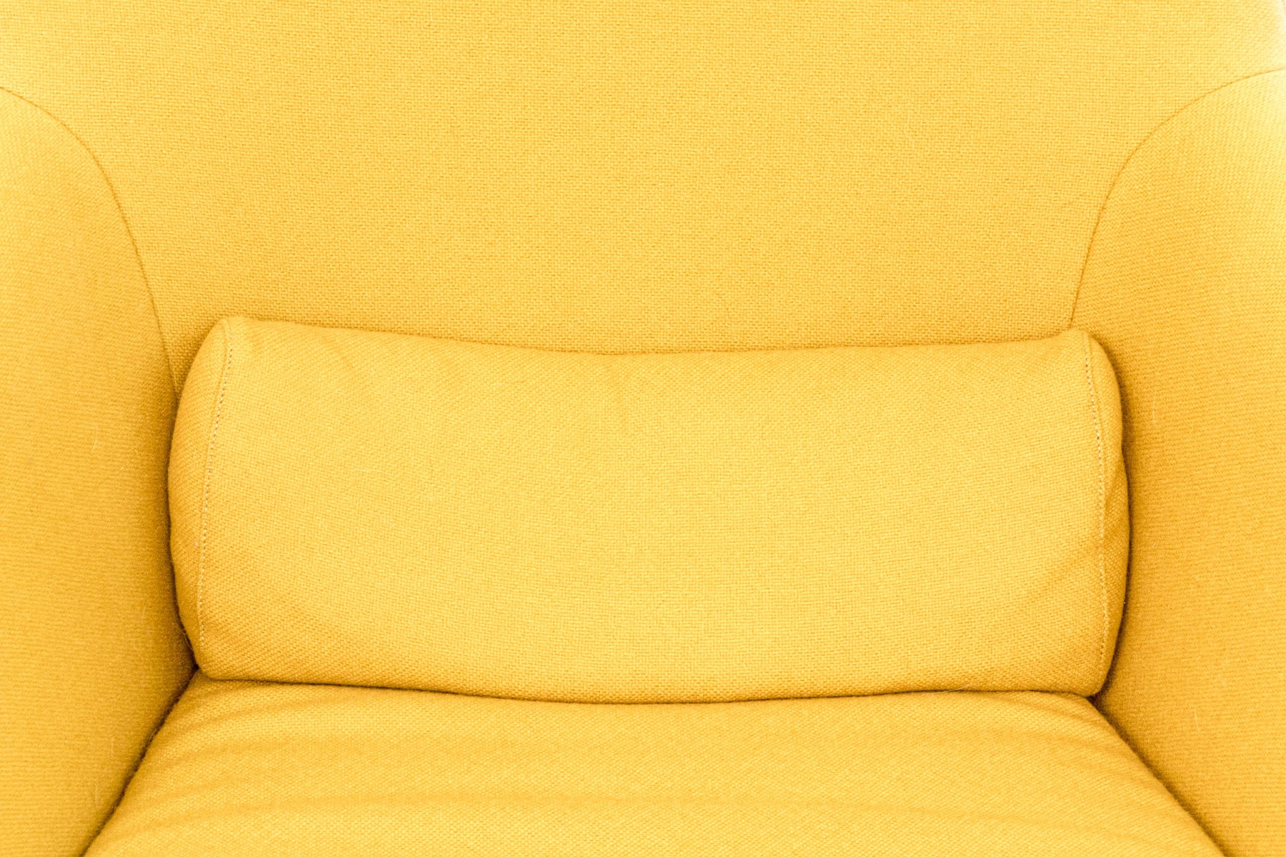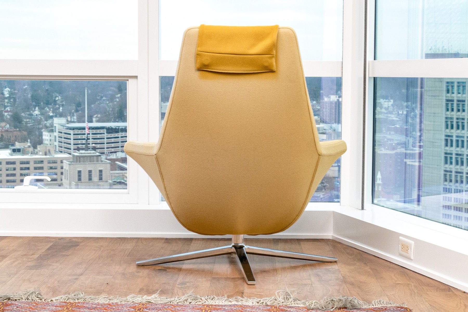 Made in Italy. One of their exclusive modern designs. A tub chair with wide arms and sloping back mounted on an X form steel frame. Upholstered in a mustard yellow polyurethane fabric. With separate head and lumbar pillows.