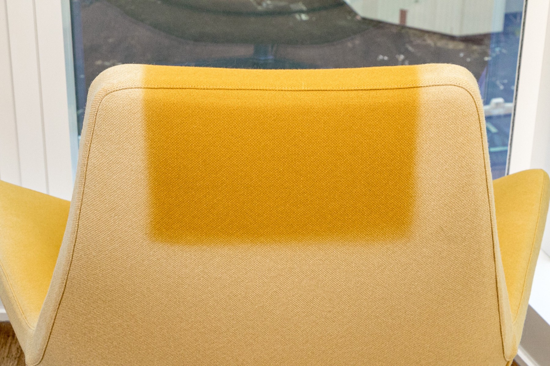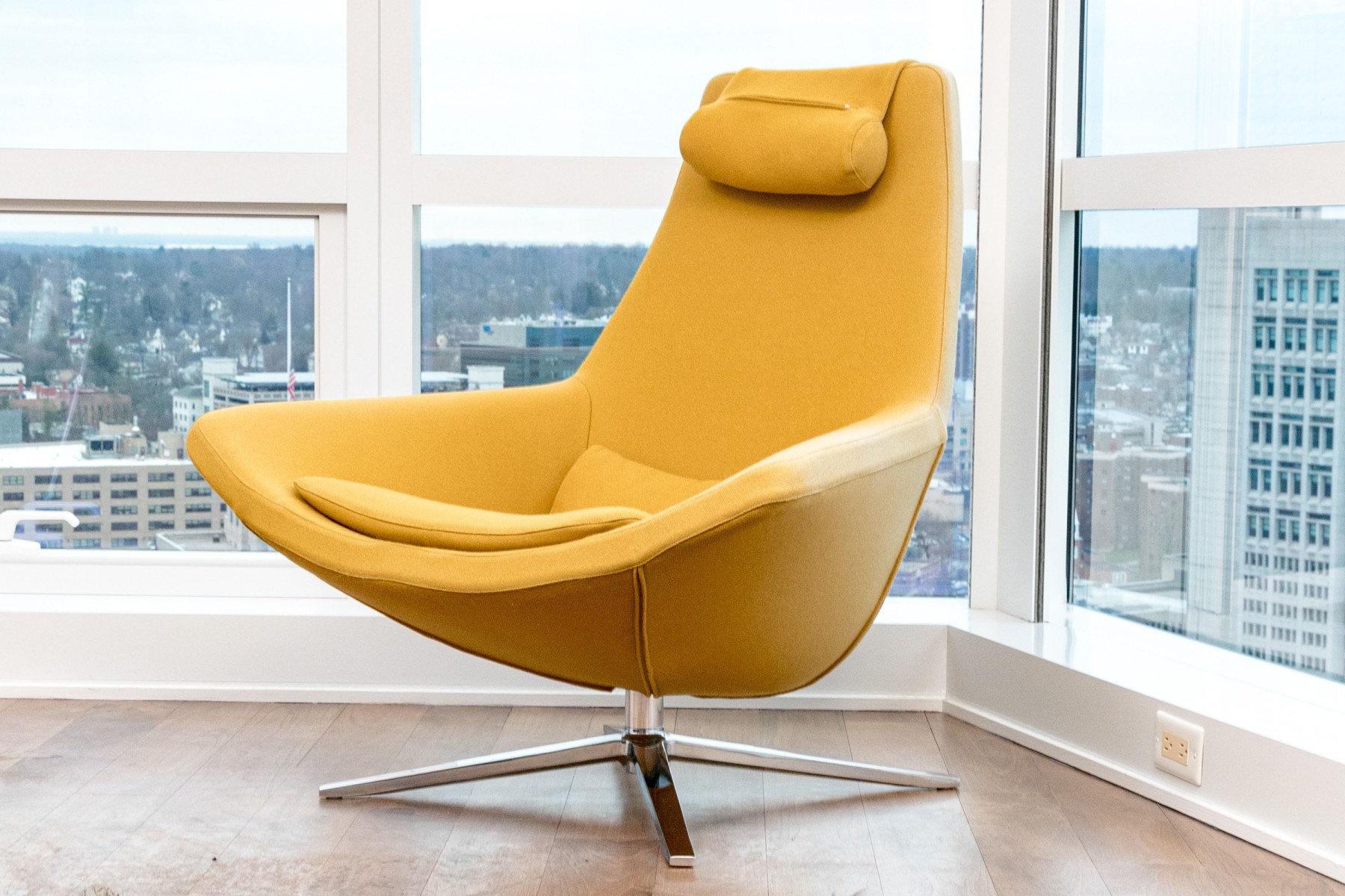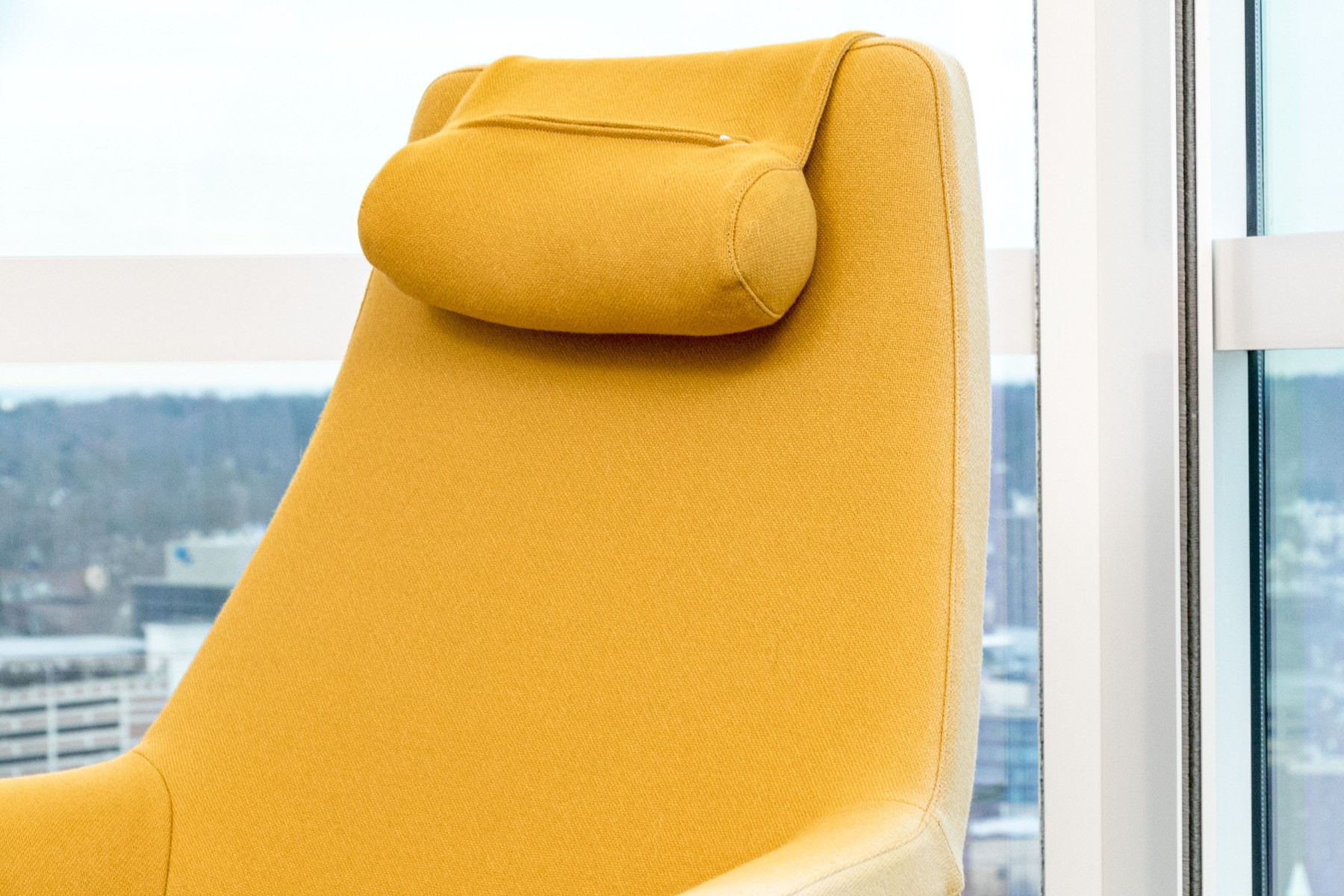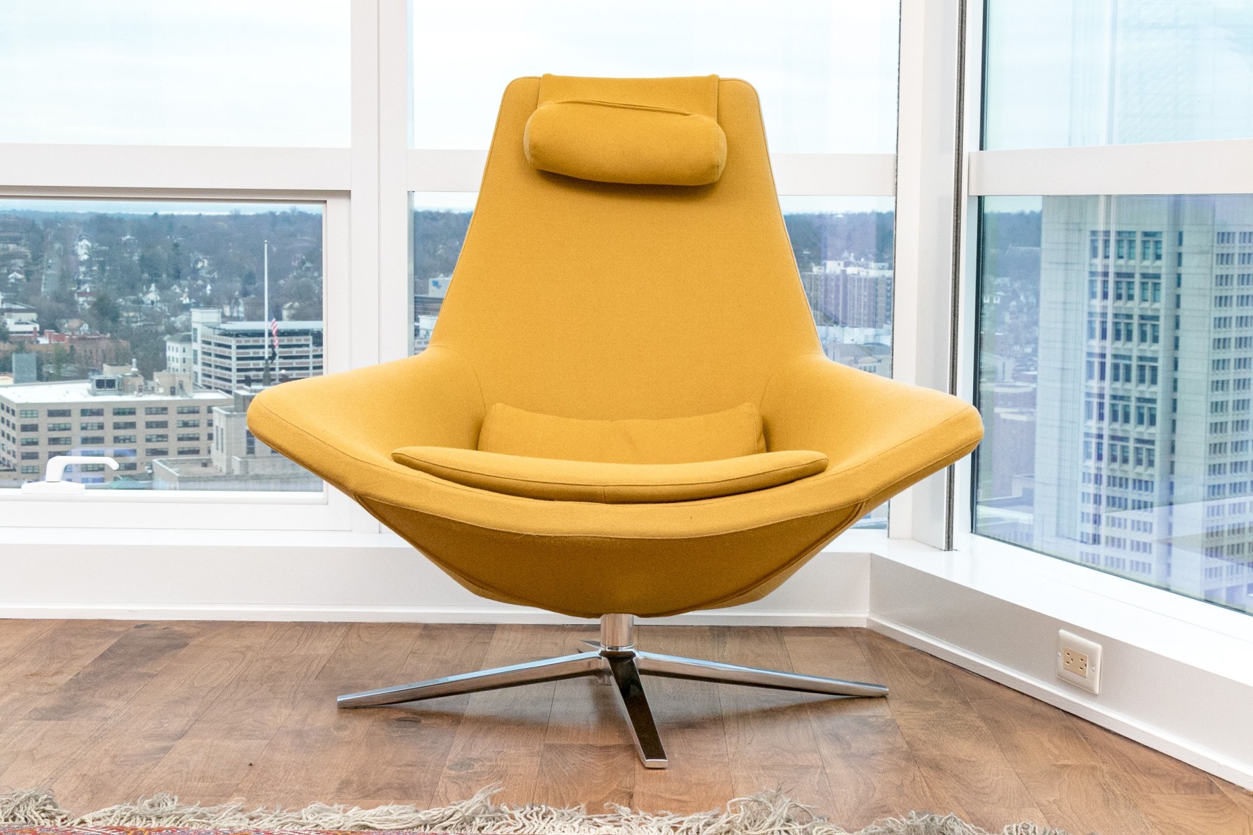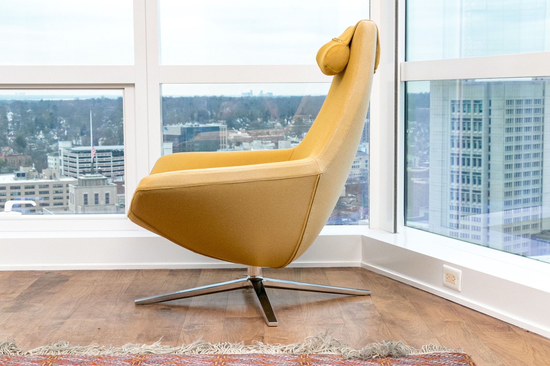 Made in Italy. One of their exclusive modern designs. A tub chair with wide arms and sloping back mounted on an X form steel frame. Upholstered in a mustard yellow polyurethane fabric. With separate head and lumbar pillows.