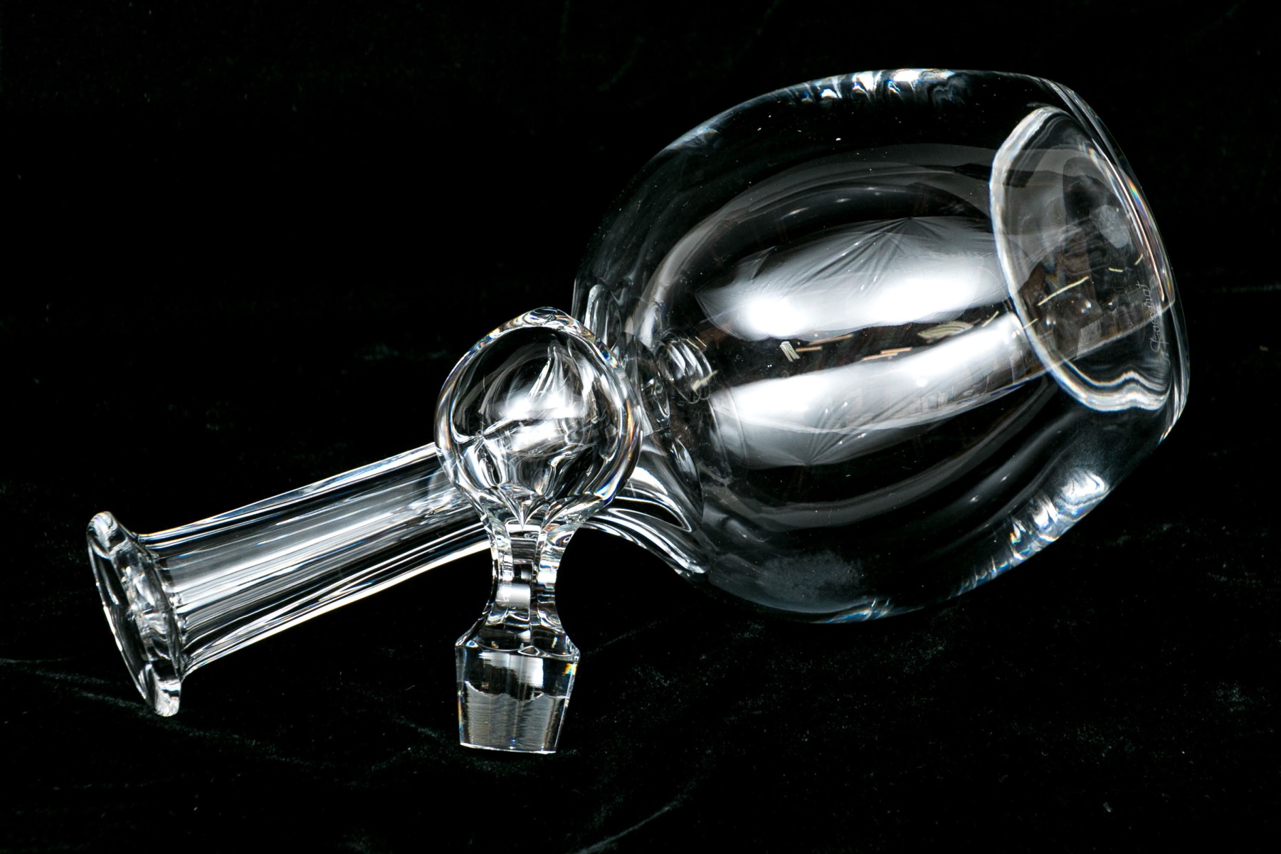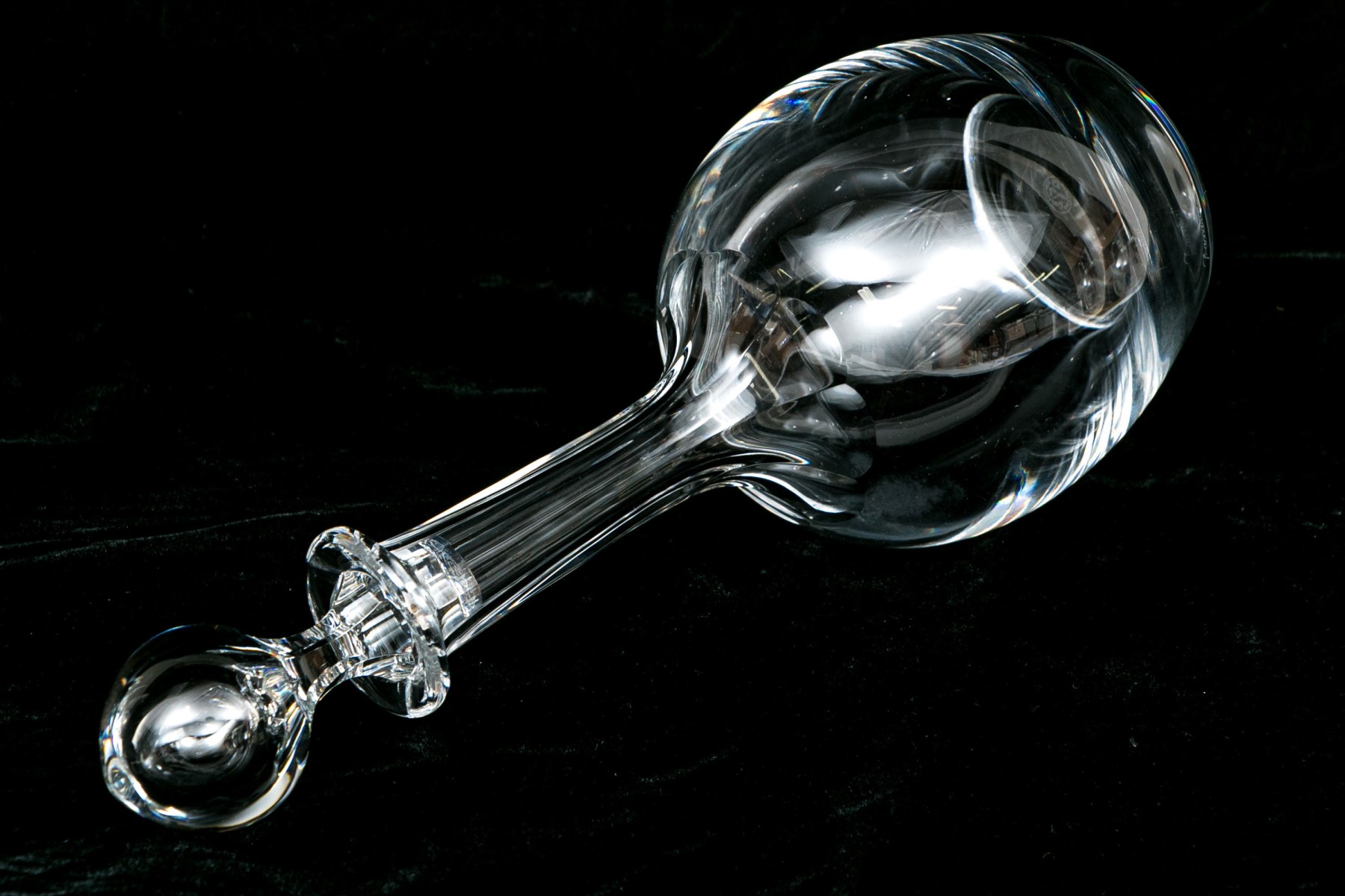 An elegant shape with a tall fluted neck, flat base and faceted teardrop form stopper.