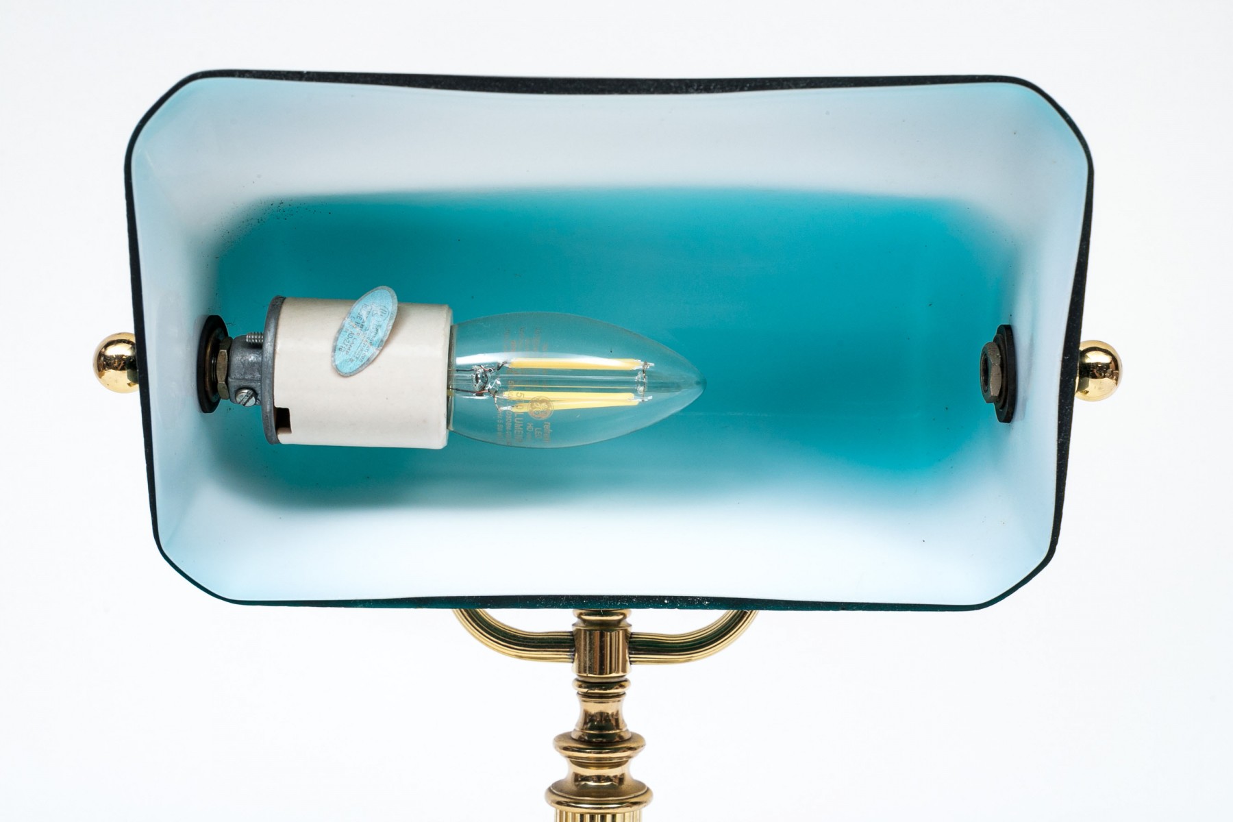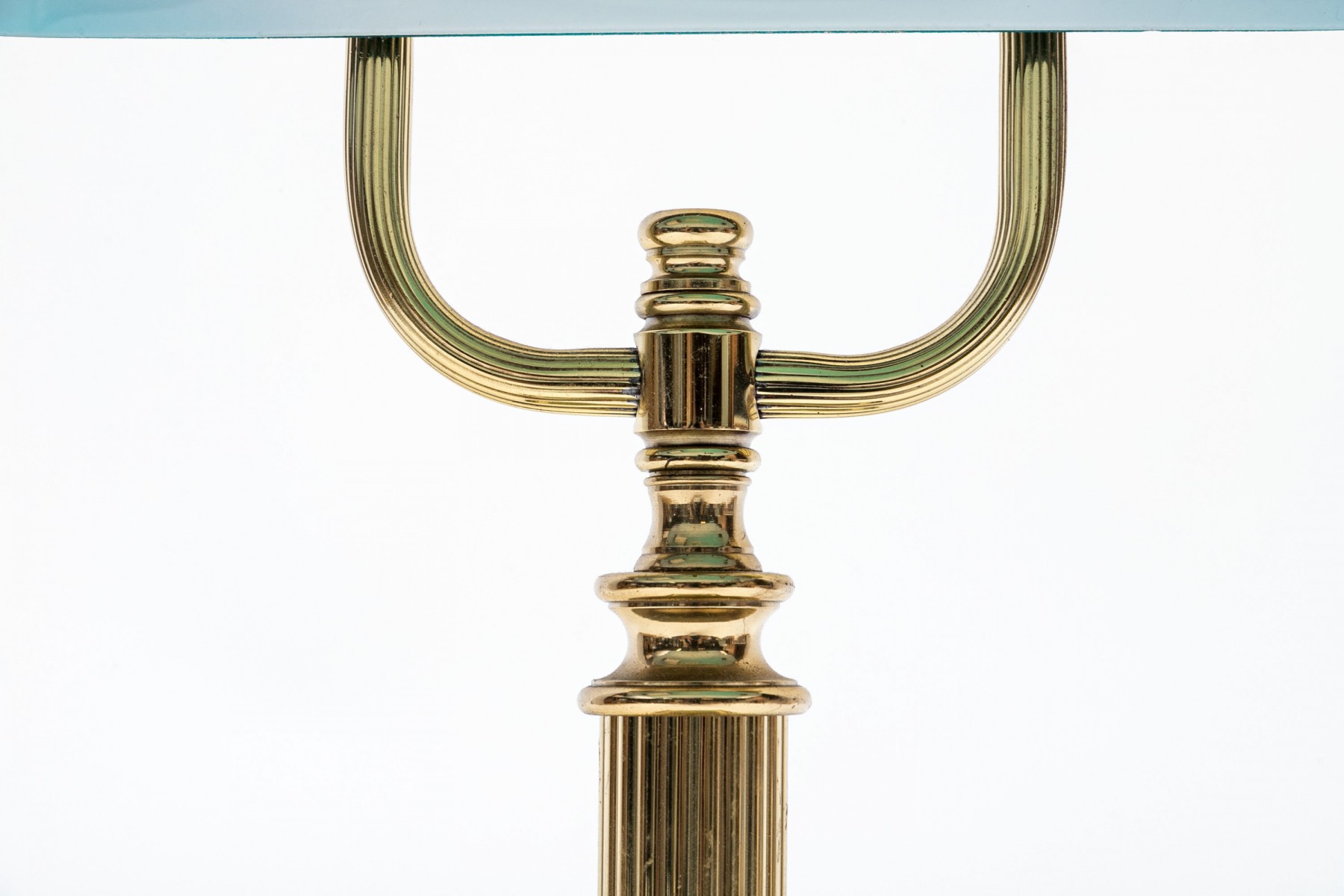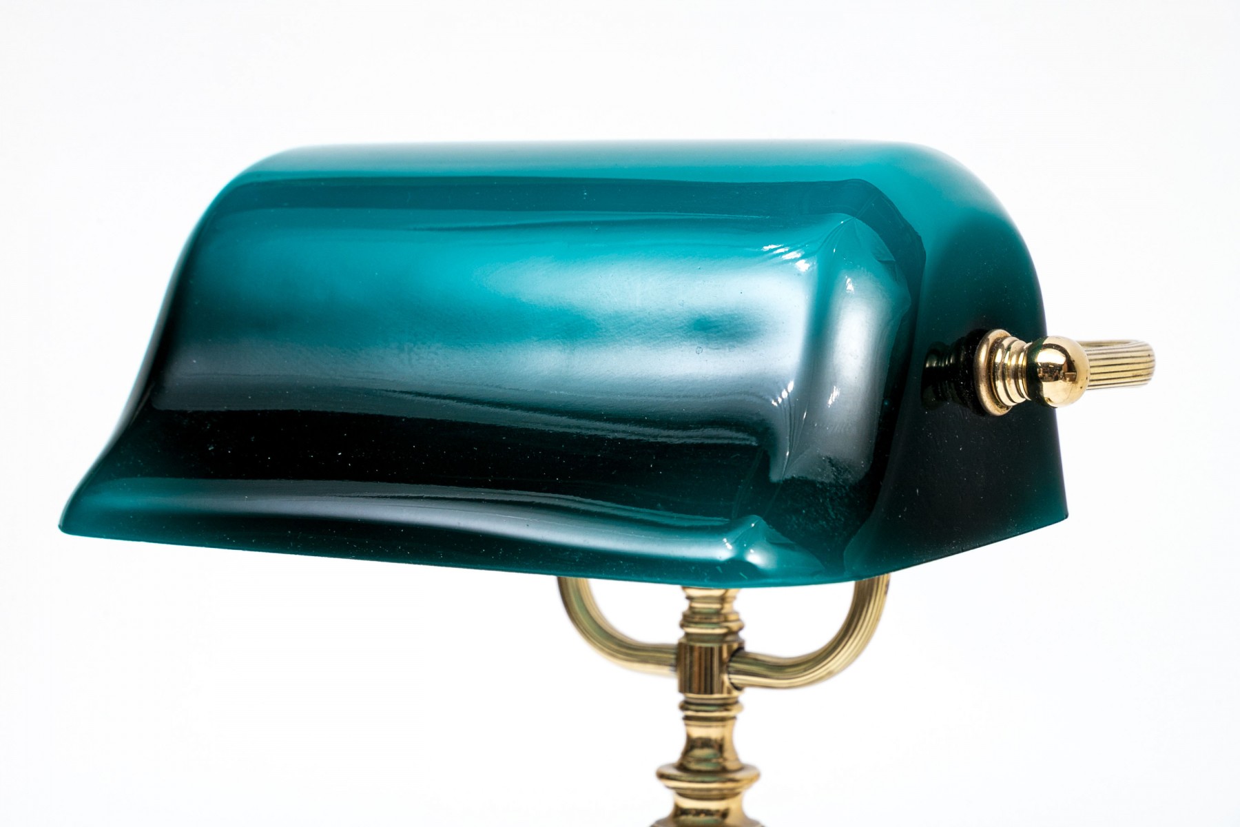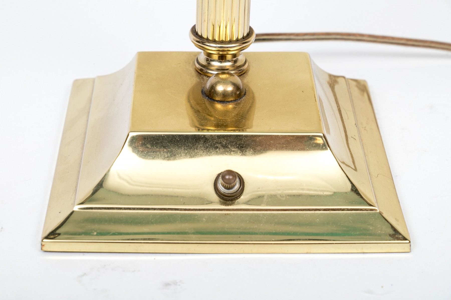 A classic banker's lamp with ribbed brass arms and brass support and base. With a green glass swivel shade.